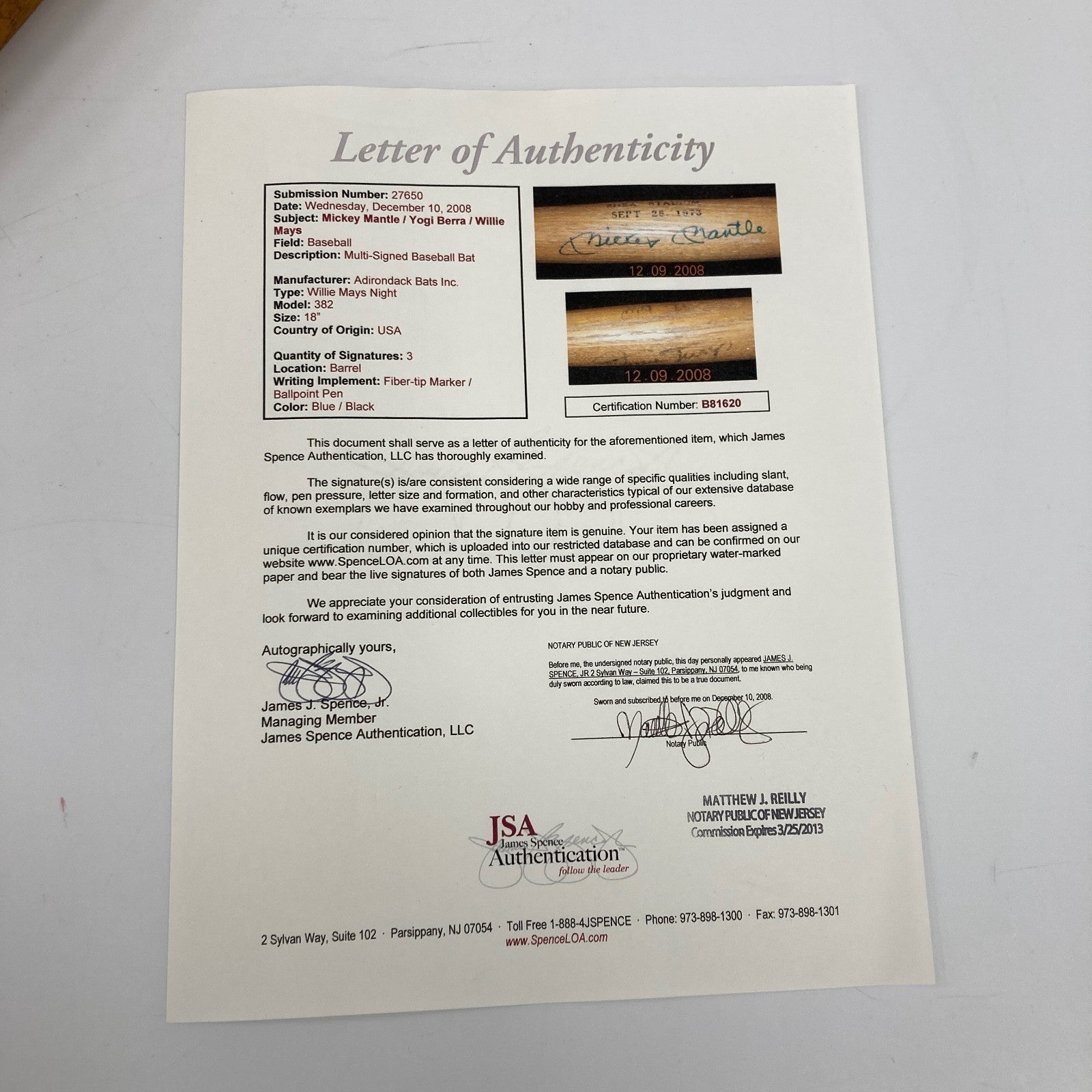 Mickey Mantle, Willie Mays, & Yogi Berra autographed mini Willie Mays Night Adirondack bat measuring 18" in length. Accompanied by a full JSA Letter of Authenticity.