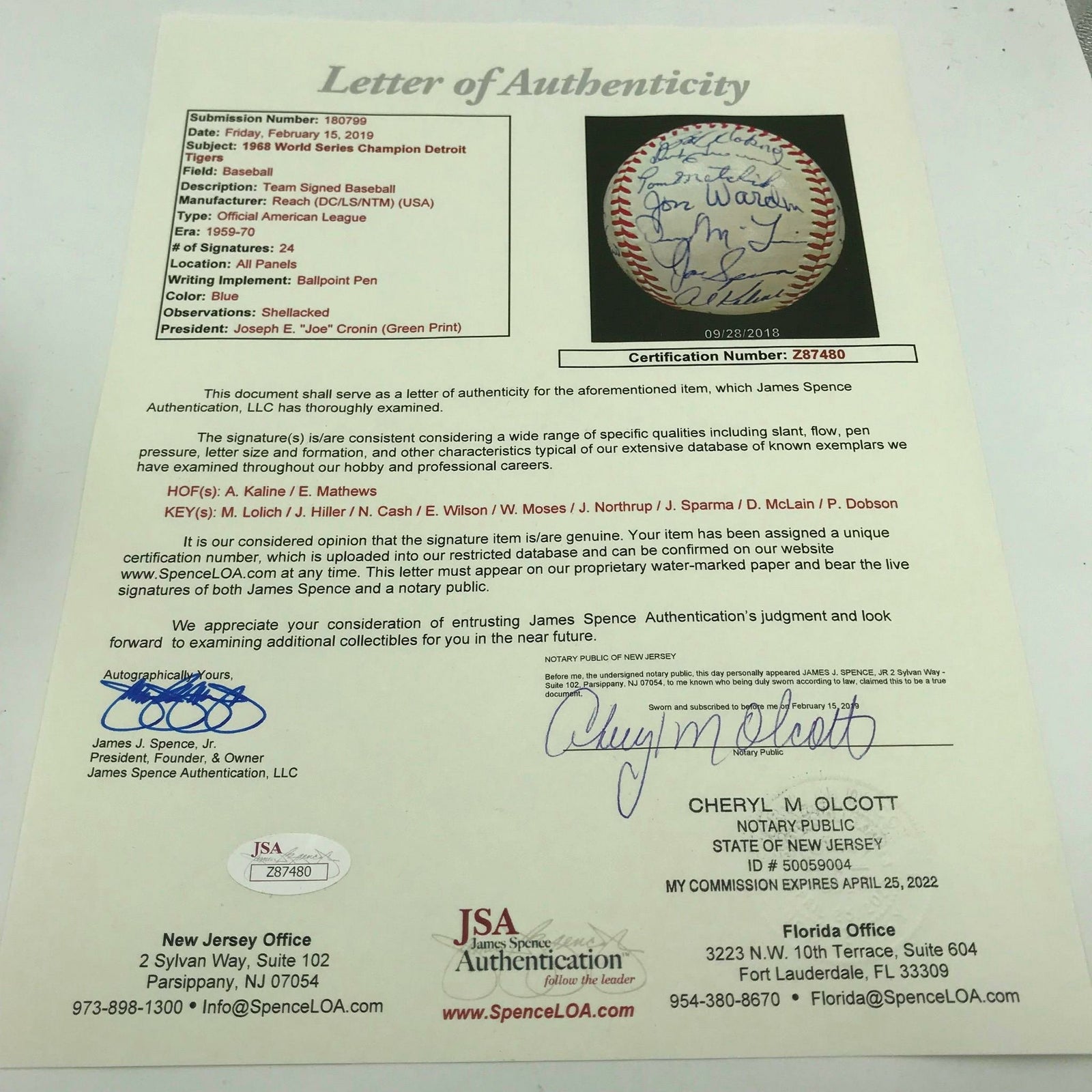 The Finest 1968 World Championship Detroit Tigers team-signed Official American League Joe Cronin baseball. 24 Signatures include: Wally Moses, Daryl Patterson, Willie Horton, Mickey Lolich, Fred Lasher, John Hiller, Pat Dobson, Dick Tracewski, Tommy Matchick, Jon Warden, Denny Mclain, Joe Sparma, Al Kaline (HOF), Gates Brown, Don Wert, Jim Northrup, Dick McAuliffe, Norm Cash, Les Cain, Earl Wilson, Johnny Sain, Eddie Mathews (HOF), Jim Price and Hal Naragon. The ball comes with a full LOA from JSA.