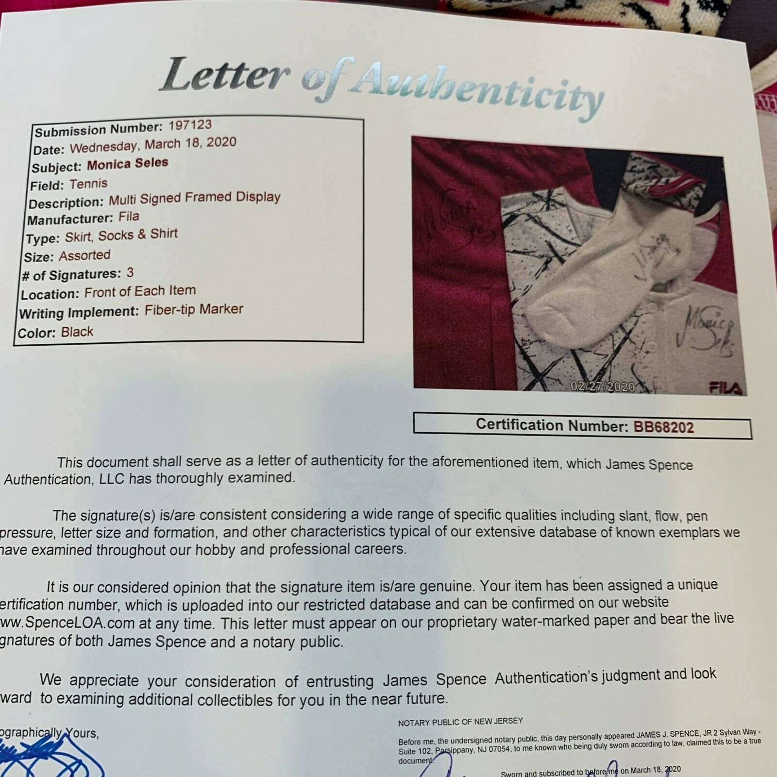 Click or scroll to zoom Tap or pinch to zoom Click or scroll to zoom Tap or pinch to zoom Click or scroll to zoom Tap or pinch to zoom Click or scroll to zoom Tap or pinch to zoom Click or scroll to zoom Tap or pinch to zoom Click or scroll to zoom Tap or pinch to zoom Monica Seles Signed Match Worn Game Used Tennis Shirt, Skirt & Socks JSA COA Sold out 1 2 3 4 5 6 7 8 9 10+ Quantity Quantity Sold out Monica Seles Signed Match Worn Game Used Tennis Shirt, Skirt & Socks. Full letter COA from JSA. Frame measures 21x23. #9389837 Exported By ExportYourStore