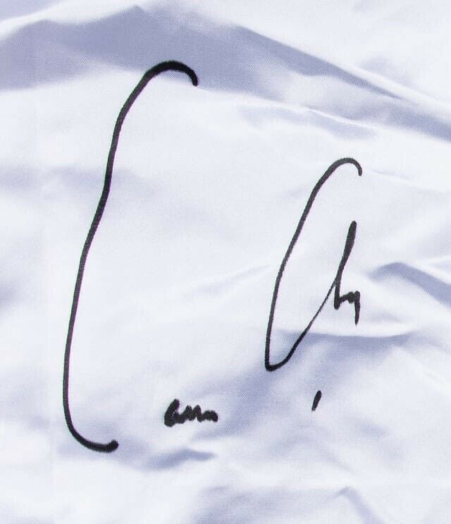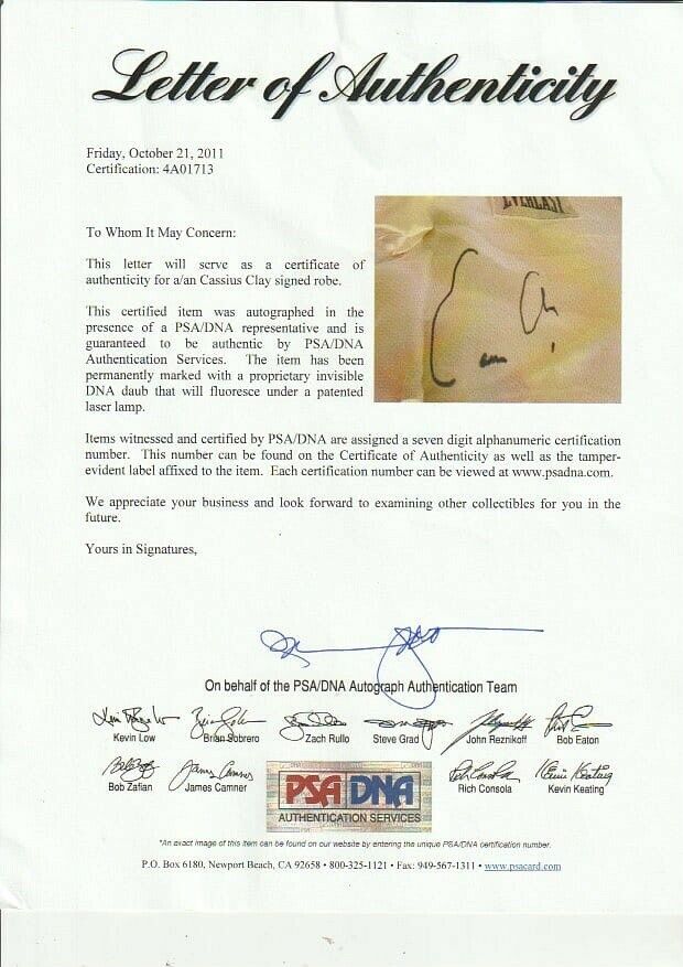 Offered here is a white Everlast boxing robe that has been signed by Muhammad Ali using his birth name Cassius Clay. This signature was done in black marker in near the mid-back portion of the garment. Black accents adorn the robe, with the Everlast logo appearing on the shoulders and neck area. “CASSIUS CLAY THE GREATEST” is embroidered on the top back portion of the robe in black. This comes with a LOA from PSA/DNA (4A01713).