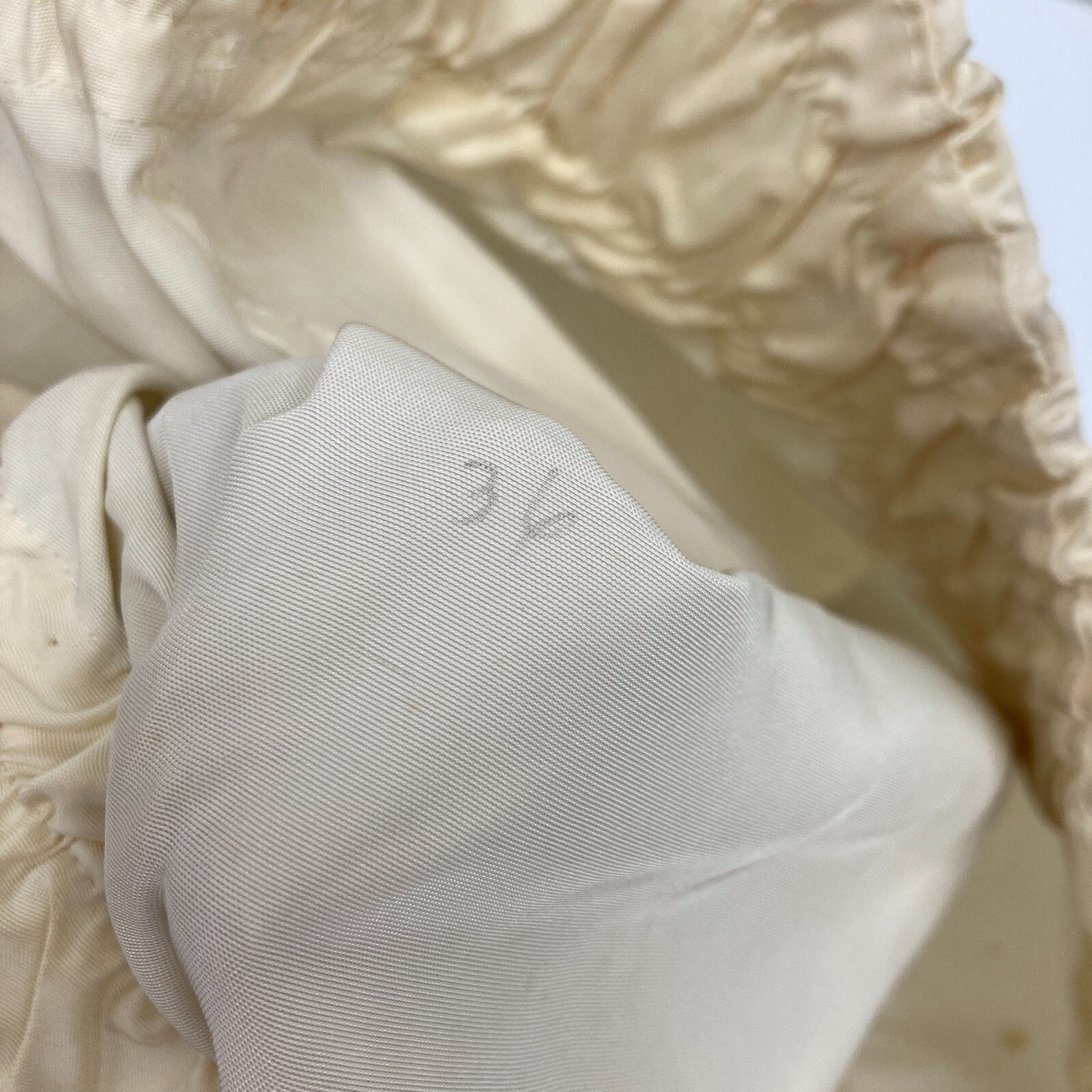 If you carefully look inside the waistband you should find the following written in pencil. 36 F, 36B and Ali. My belief is that since the front tag was either ripped off or removed ,the 36 F and B indicated the proper way to wear the trunks. Ali's waist size in the 1970's was 36.