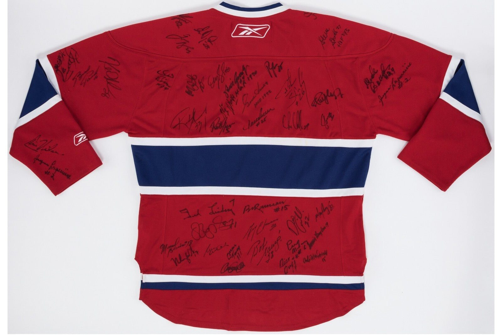 Offered is a Reebok size-L Montreal Canadians sweater signed by about 100 rink legends, including Guy LaFleur, Gordie Howe, Ted Lindsay, Richard Sevigny, Wayne Gretzky, Chris Chelios, Patrick Roy, Jean Beliveau, Guy Lapointe, Jacques Lemaire, (2) Jacques Laperierre, (2) Steve Shutt, Dick Duff, Peters Stasny, Brian Trottier, Pierre Pilotte, Gerry Cheevers, Brett Hull, Chris Chelios, Bob Gainey, (2) Serge Savard, Vladimir Tretiak, Elmer Lach, Brad Park, Guy Charbonneau, Dickie Moore, Marcel Dionne, Lanny McDonald, Mike Bossy, Bill Gadsby, Henri Richard, Marcel Bonin, Peter Mahovlich, Jean Guy Talbot, Mario Tremblay x 2, Bob Sauvé, Ab McDonald, Gaston Gingras, Eric Desjardins, Richard Sévigny, Chris Nilan, Patrice Brisebois, Pierre Mondou, Bob Filion, Kim St Pierre, Réjean Houle, Steve Penney, Don Marshall, Gilles Tremblay, Yvon Lambert, Lucien Deblois, Jacques Demers, Ralph Backstrom, André Pronovost, Pierre Bouchard and more.