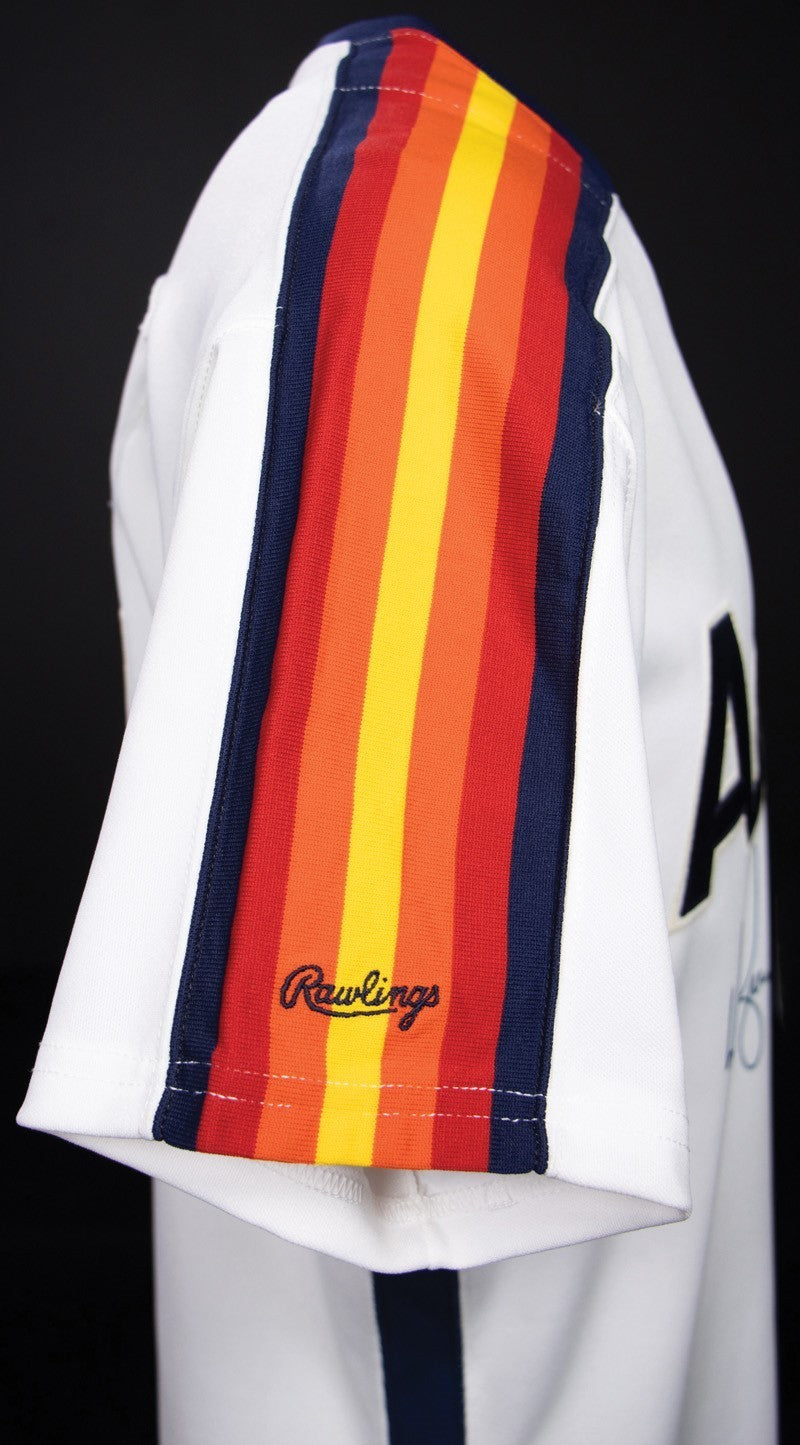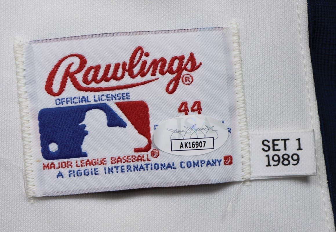 Presented is a professional model Houston Astros jersey attributed to the legendary pitcher Nolan Ryan from the 1989 season. Manufactured by Rawlings, the jersey features proper “Set 1 1989” tagging, consistent with team-issued examples from that year. Ryan has added a bold autograph to the front, enhancing the jersey’s appeal. A rare and desirable representation from Ryan’s final season in Houston, before his move to the Texas Rangers, this signed pro model stands as a premier collectible from baseball’s all-time strikeout king. Comes with JSA COA.