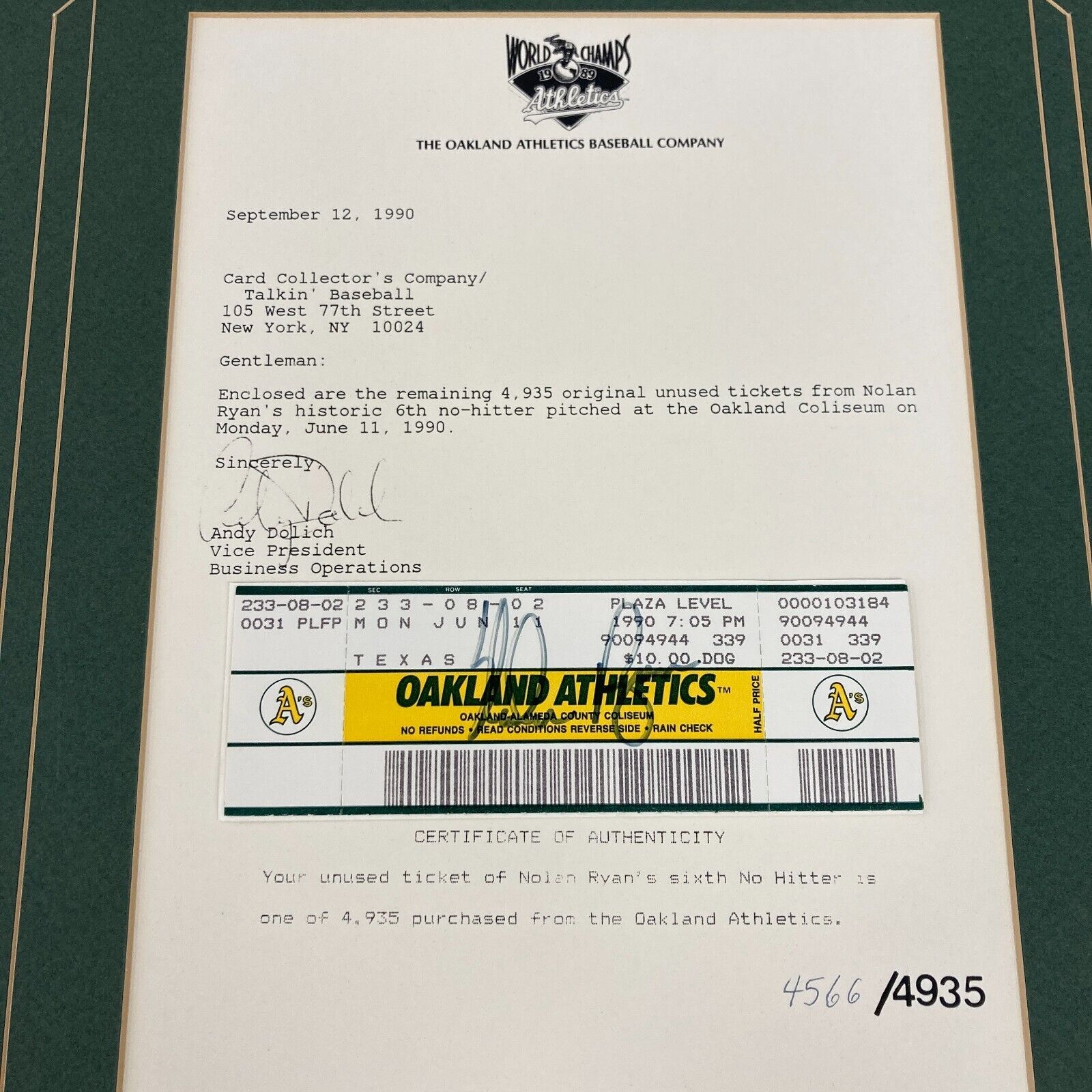 1990 Nolan Ryan Signed Sixth No-Hitter Unused Ticket. Offered is an unused ticket from a matchup between the Texas Rangers and Oakland Athletics on June 11, 1990. On that day, Nolan Ryan threw his sixth of seven career no-hitters. The HOFer signed the ticket, which exhibits little wear, in solid black Sharpie. Displays also includes a letter from the Athletics' confirming the item's authenticity. Numbered 4,566/4,935. Matted at 13x16", it displays well and is ready for frame. Comes with PSA DNA COA.