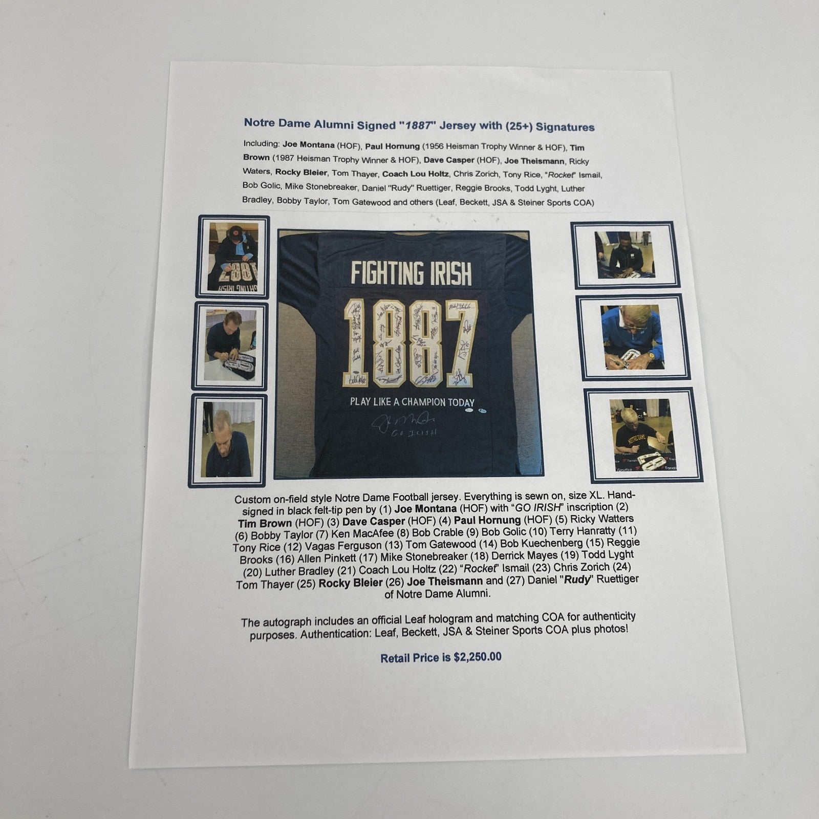 Signed by over 20 Notre Dame legends including Joe Montana, Paul Hornung, Tim Brown, Dave Casper, Joe Theismann, Rickey Watters, Rocky Bleier, Rudy Ruettiger, Lou Holtz, Chris Zorich, Bob Golic, Vagas Ferguson, Tony Rice, Rocket Ismail, Tom Thayer, Luther Bradley, Allen Pinkett and more. Jersey is size XL custom jersey