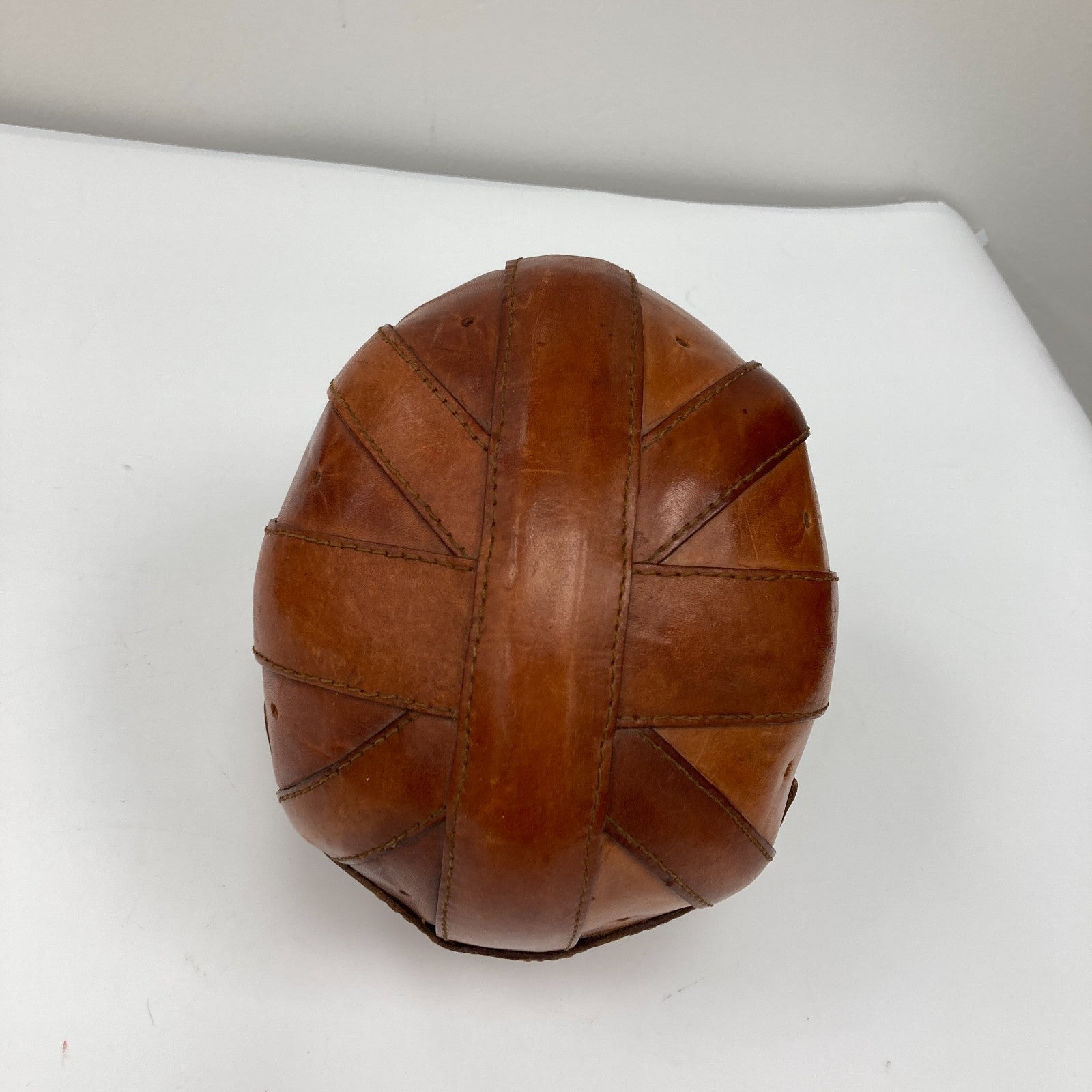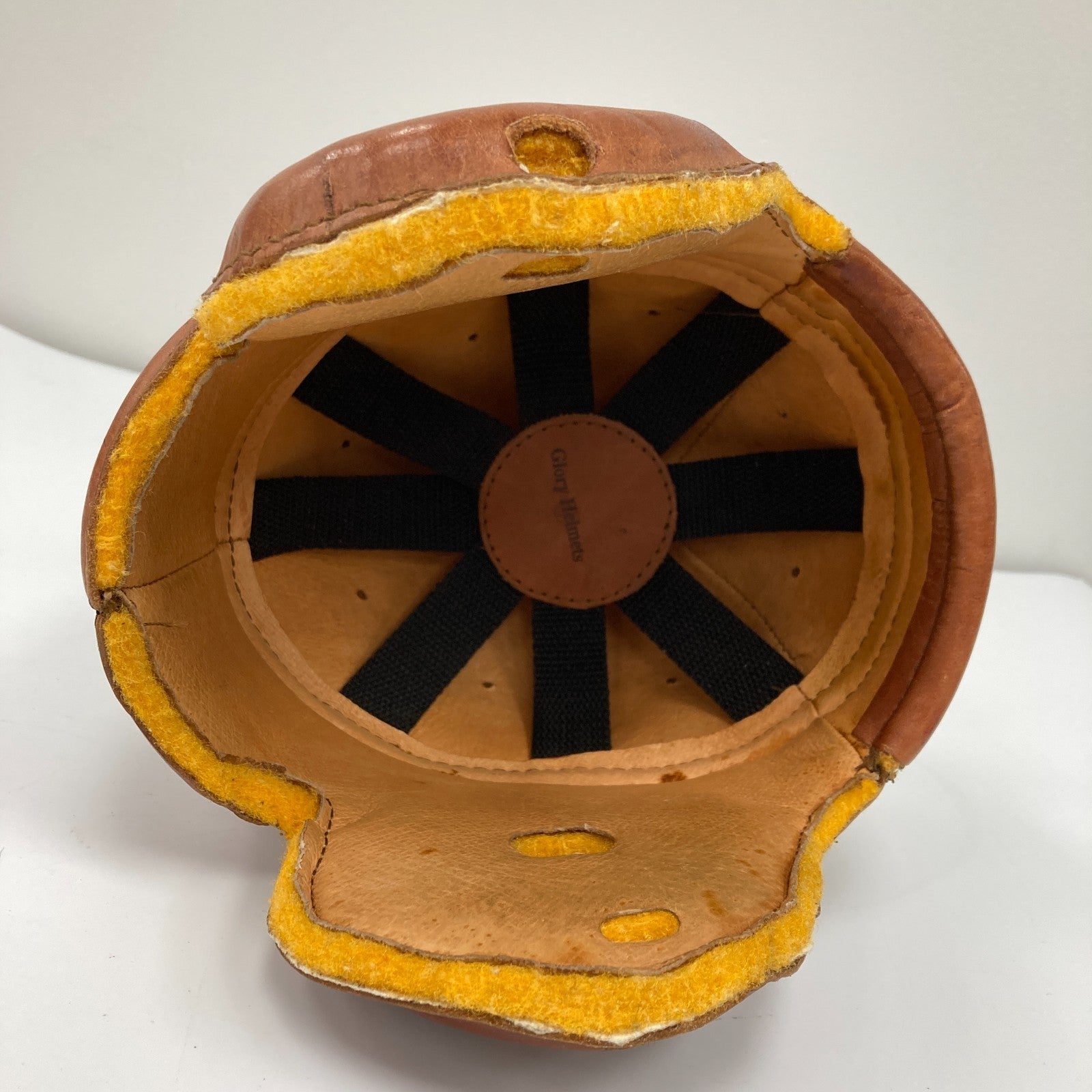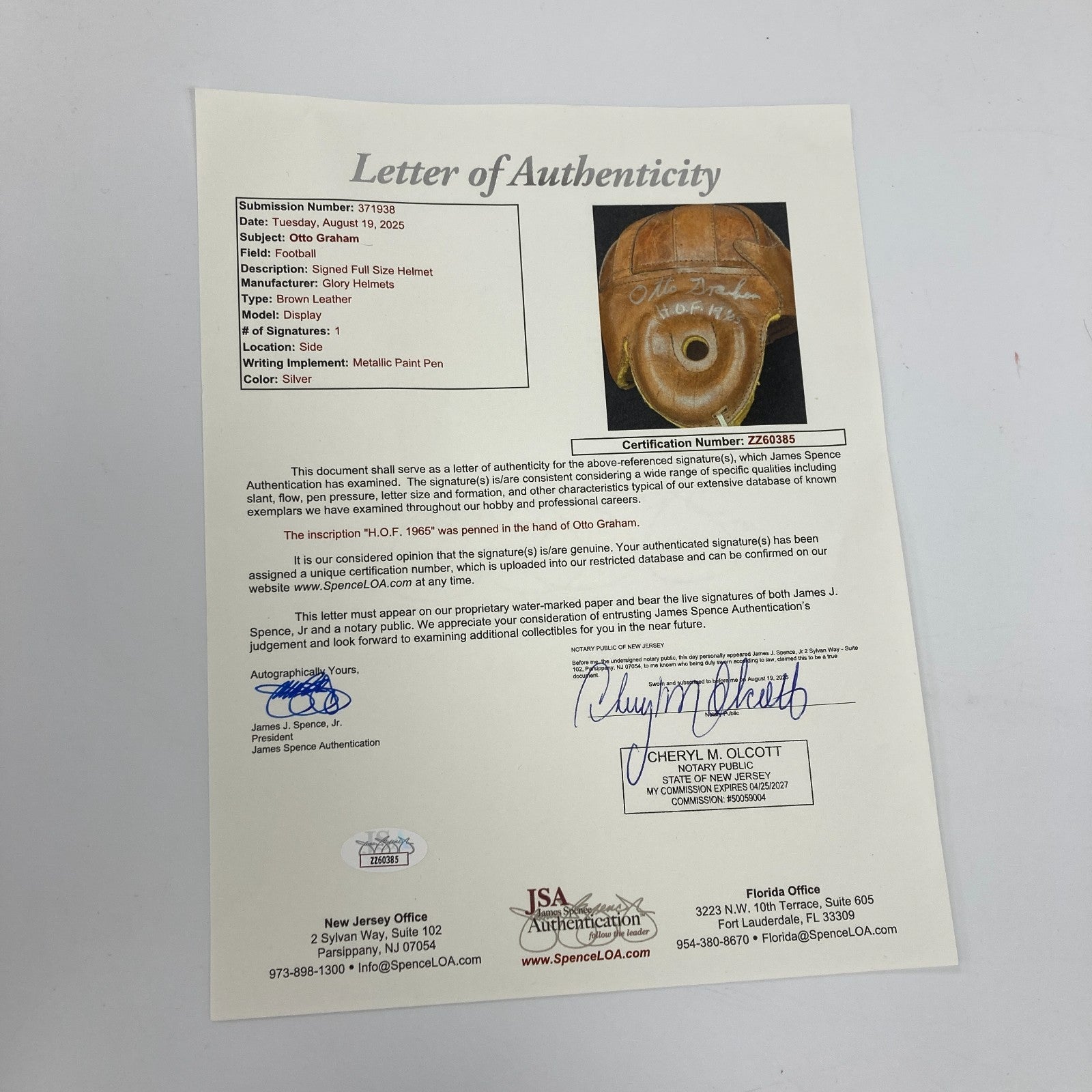 Beautiful leather replica helmet by Glory Helmets, signed and inscribed atop the right ear flap in silver paint pen by Hall of Famer Otto Graham. Durable helmet displays well, a modern construction loyal to the originals but using modern materials, which has helped this example retain its shape and creates an attractive display. Graham, who died in 2003, began his football career as leather helmets were transitioning to plastic. An extremely attractive display. Full LOA from James Spence Authentication.