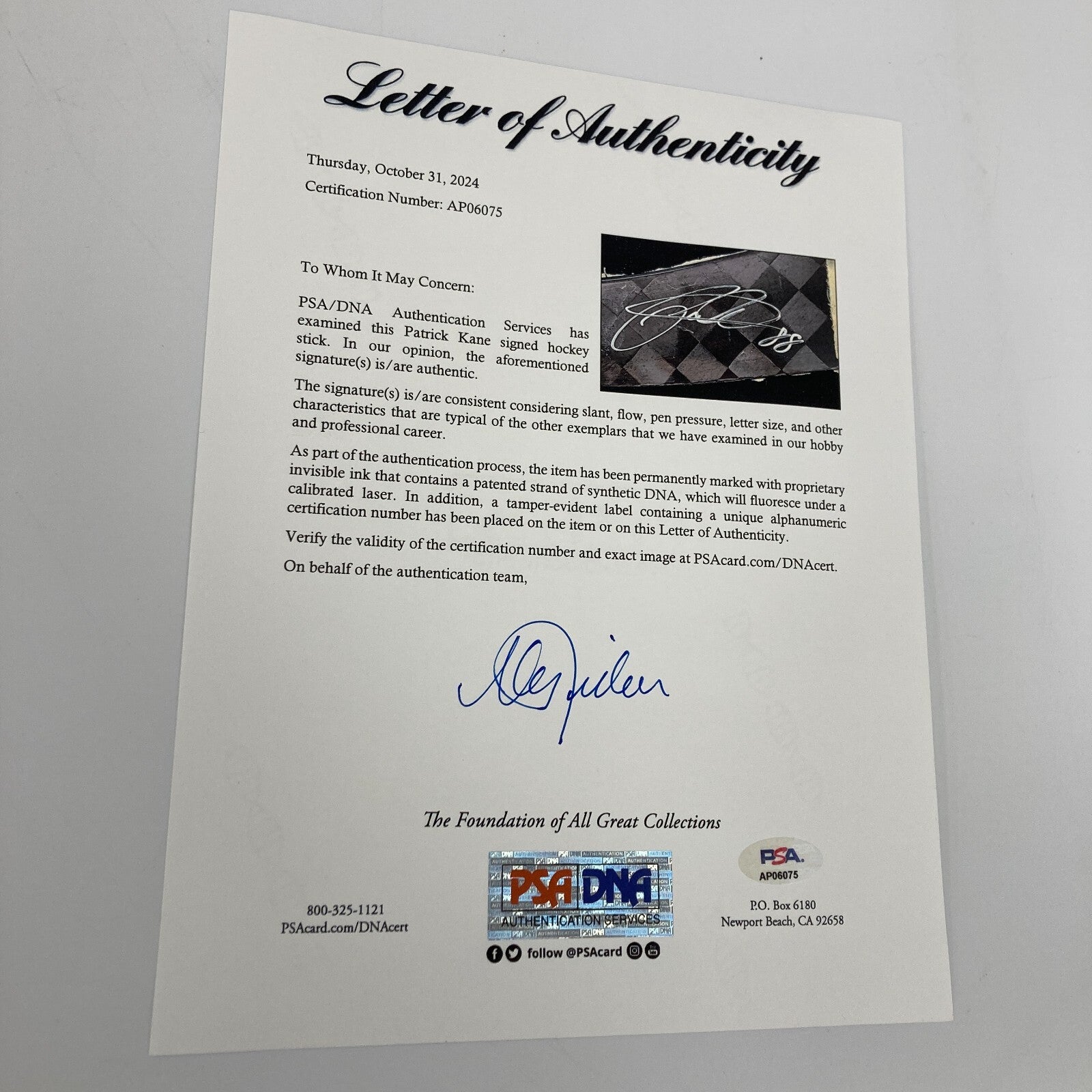 Kane used this Bauer Vapor APX stick when he was dominating the Windy City ice scene. "P. Kane #88" was factory stamped on the handle, which has Kane's customary rubber gripper ("3" written") firmly affixed. Kane signed the blade in silver paint pen. LOA from Perry Nelson. Full LOA from PSA/DNA. Full LOA from Beckett Authentication Services.