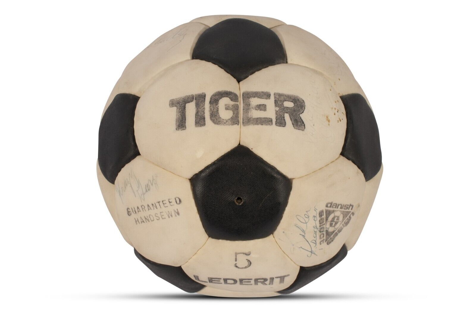 Vintage 1970s soccer ball autographed by players from the New York Cosmos and San Jose Earthquakes of the NASL. The Tiger soccer ball remains in good condition and is highlighted by Pele's large autograph that displays nicely. Pele won the 1977 NASL Championship while playing with the New York Cosmos. Other notable signers included on the soccer ball are Paul Child, Dick Berg, Krazy Berg Henderson, and Davie Kemp. Accompanied by a PSA/DNA LOA.