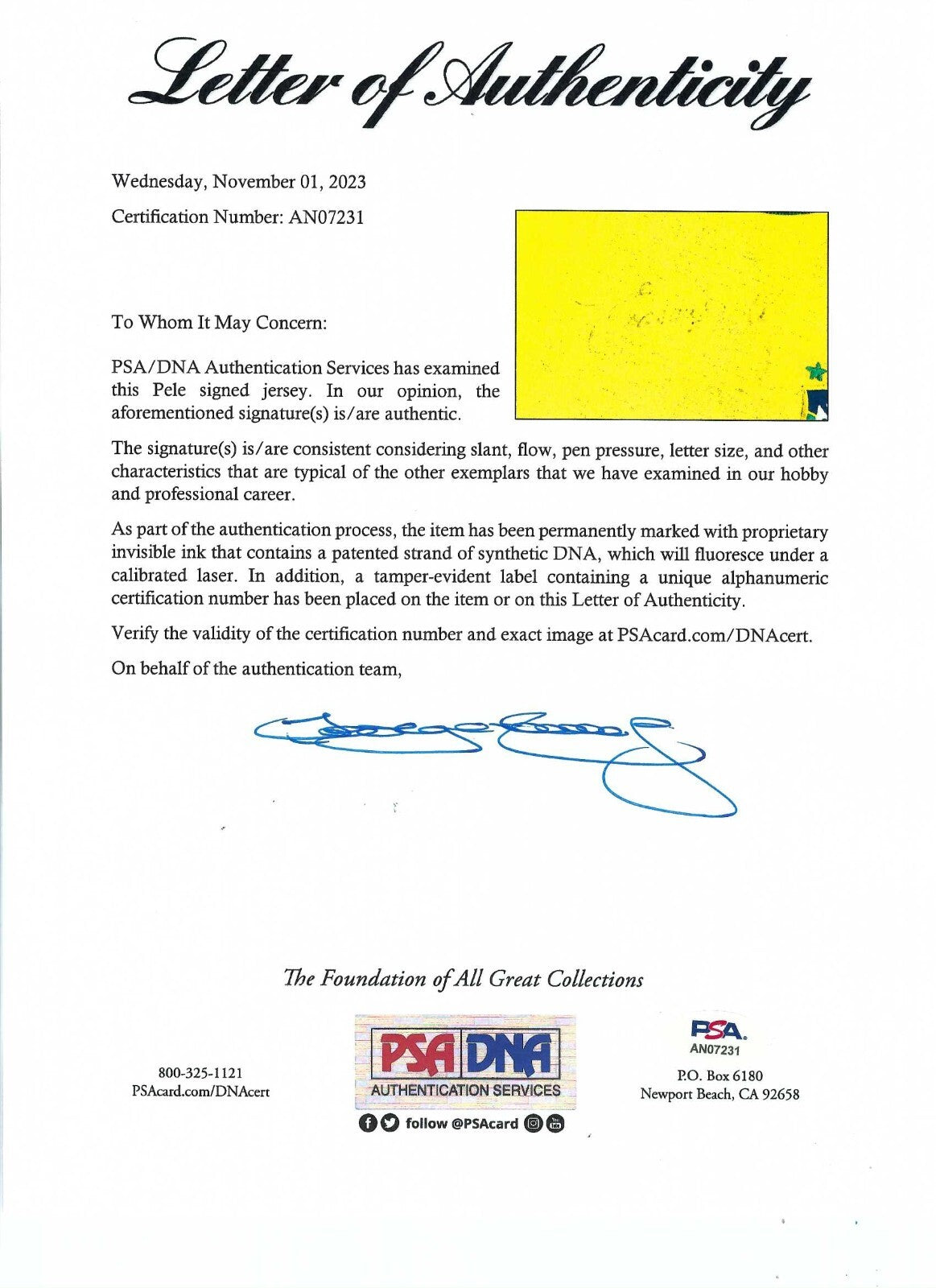 The front of the bright yellow jersey features the “CBD” crest over the heart, while the collar bears the label of São Paulo-based apparel manufacturer Athleta. On the back, Pelé's iconic number “10” is stitched onto the shirt in green. The front of the jersey also boasts a signature of "Edson = Pelé" in black. All-original with size measurements appropriate for Pelé, it comes with a jersey authentication letter from Sports Investors Authentication and a full LOA from PSA/DNA for the autograph.