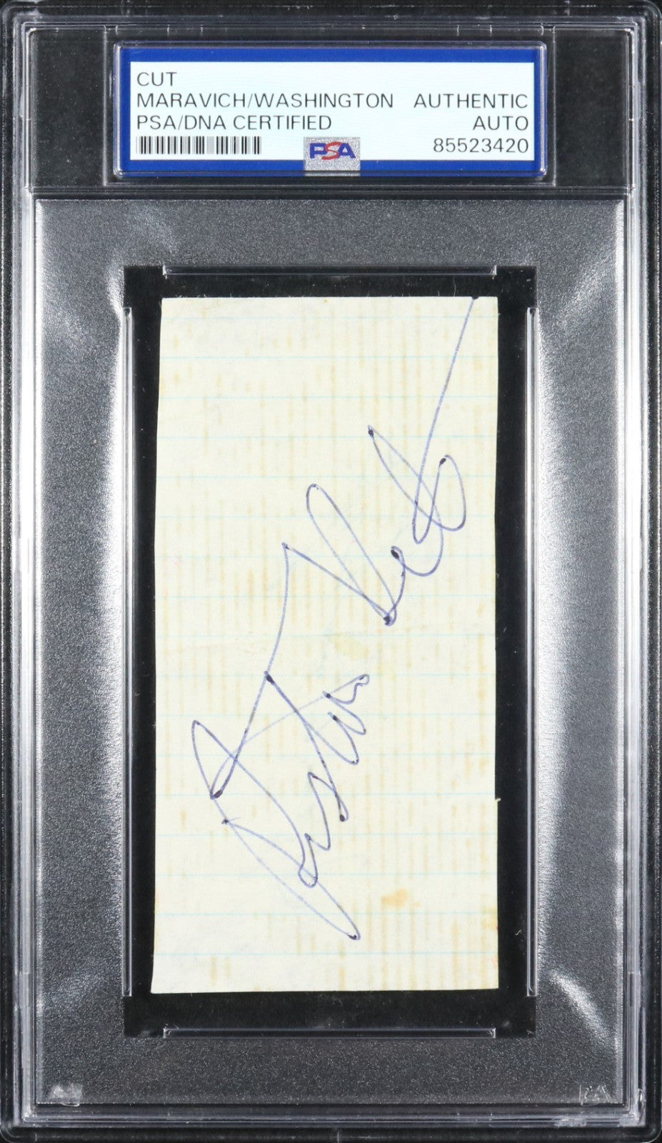 Cut signatures of Hall of Fame player Pete Maravich and "Jumping Jimmy" Washington, in blue ballpoint and blue ink pen, respectively. Maravich autograph is authenticated and encapsulated by PSA/DNA.