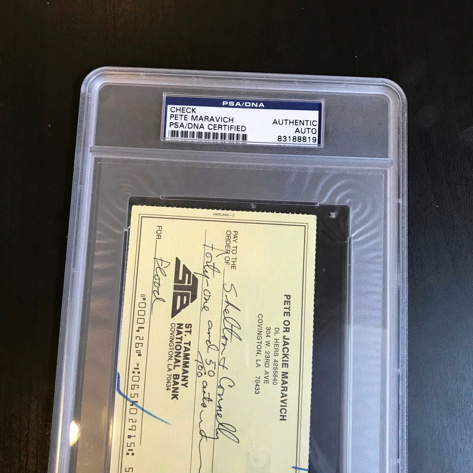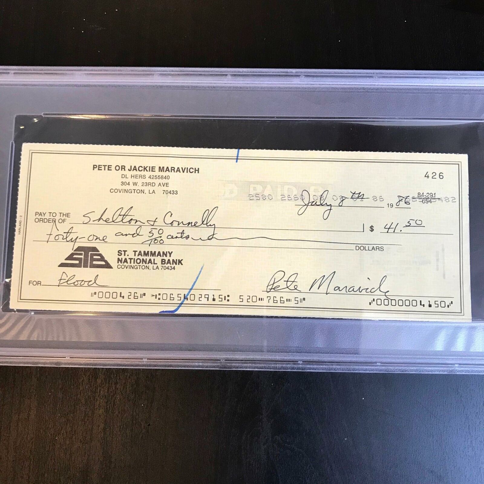 Pete Maravich "Pistol Pete" Signed Handwritten Original 1986 Check encapsulated and Authenticated by PSA DNA. Also comes with COA from Pete's Widow- Jackie Maravich.
