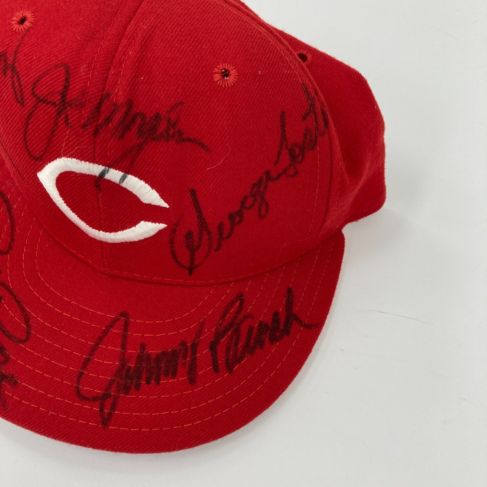 Pete Rose, Johnny Bench, Joe Morgan, Tony Perez, George Foster Big Red Machine Cincinnati Reds Signed Hat. There is a black mark on the back. See photos.