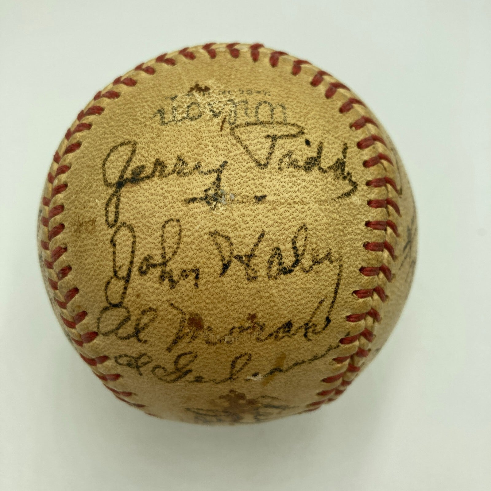 30+ members of the 1950 Kansas City Blues have added their signatures to this Official American Association baseball. Highlights include Joe Kuhel, Whitey Ford, Lew Burdette, Bill Renna, Jim Gleeson, Wally Hood, and others.
