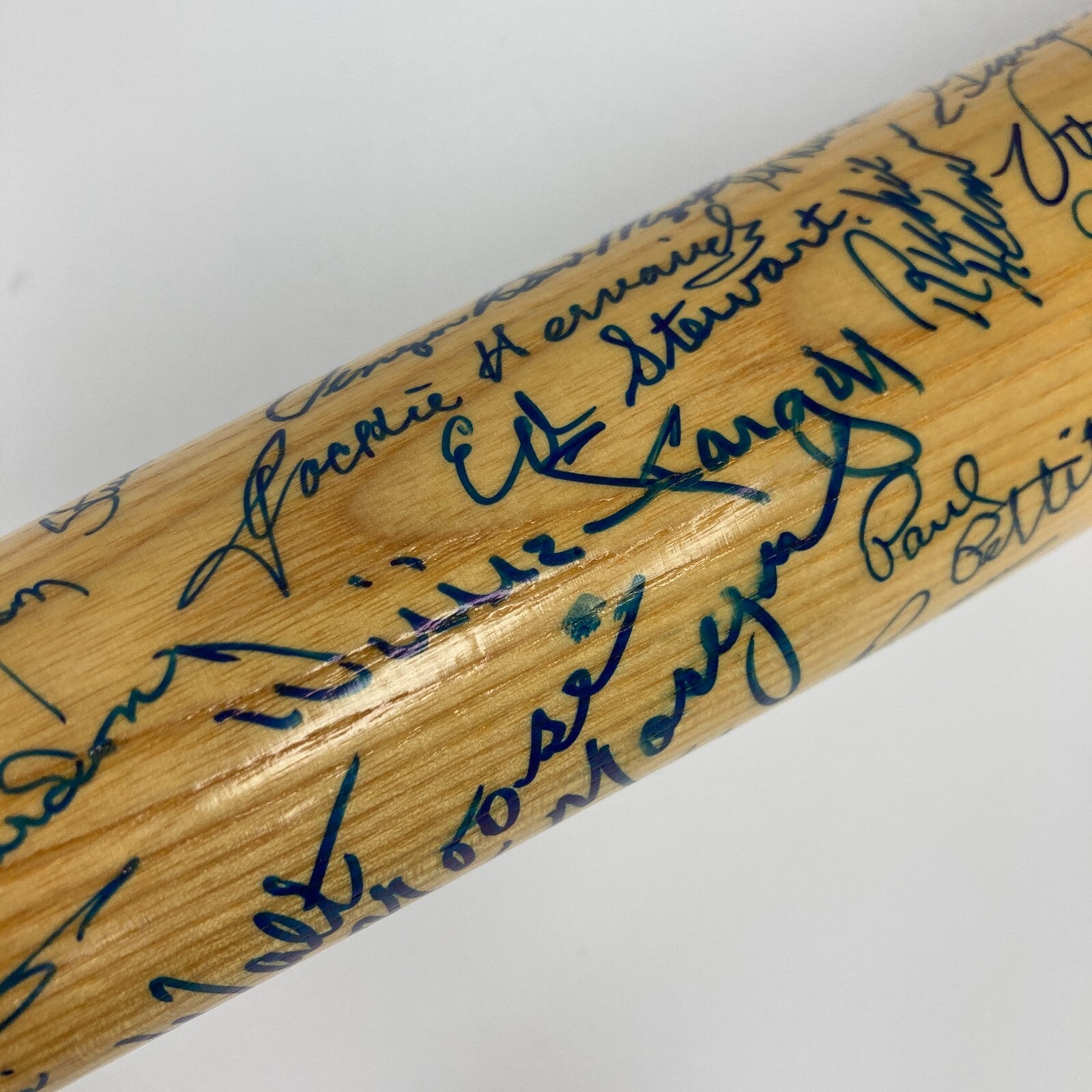 Commemorative Cooperstown Bat Co. Stadium Series lumber with Forbes Field graphic and text is signed by more than fifty former Pittsburgh Pirates, including Willie Stargell, Ralph Kiner, Herman, Bill Mazeroski, Face, Oliver, Groat, Burgess, Schofield, Haddix, Friend, Law, Vernon, Virdon, Alley, Ellis, Robertson, Blass, Briles, Grant, Belinski, Stuart, Cash, Labine, Abrams, Bend Mizell, May, Giusti, Moryn, Pagan, Lombardi, Ward, Stuart, Pettit and others. Fine visual appeal.