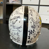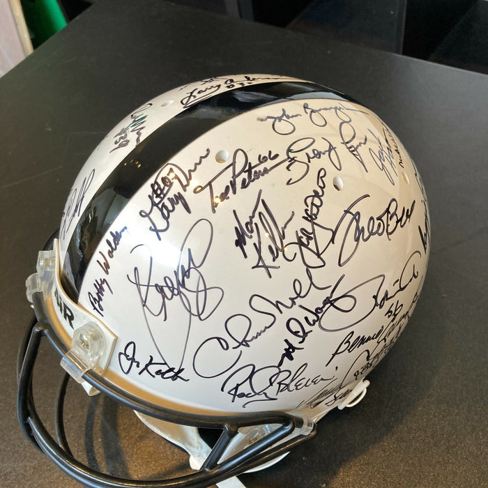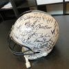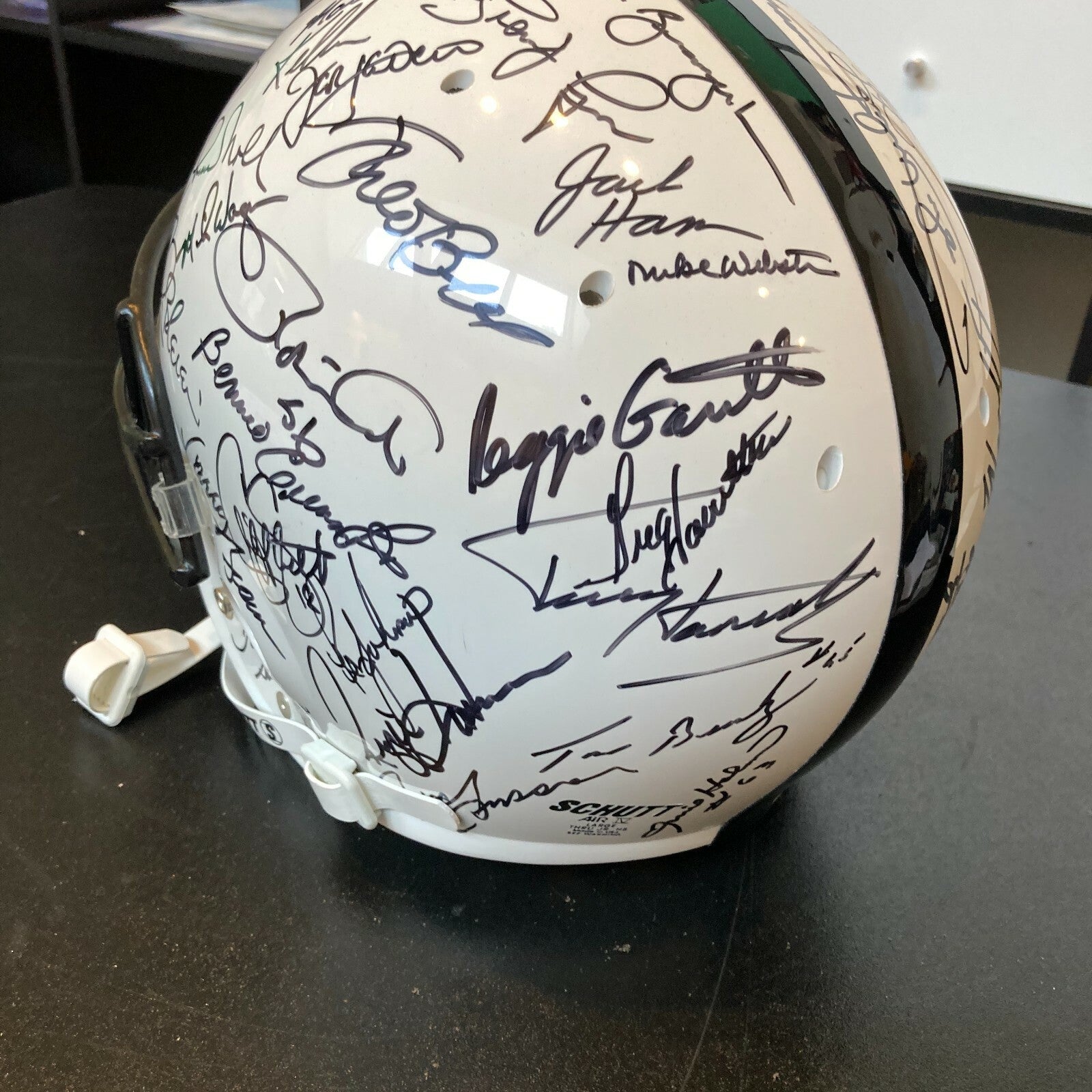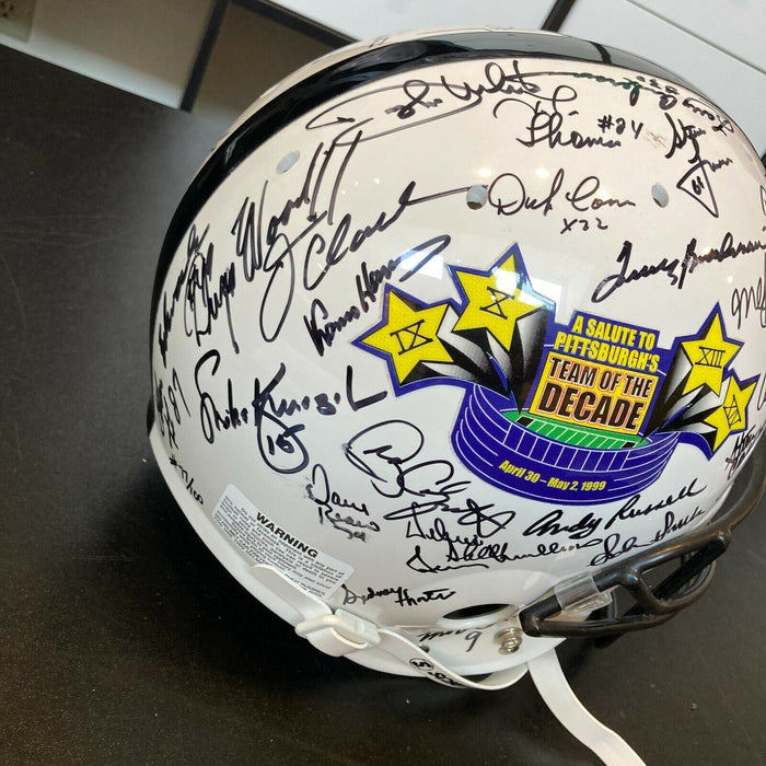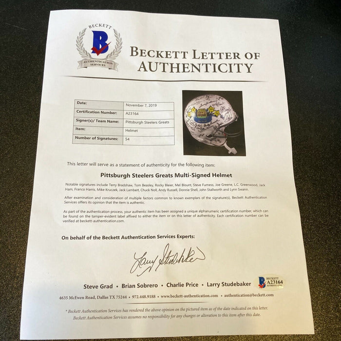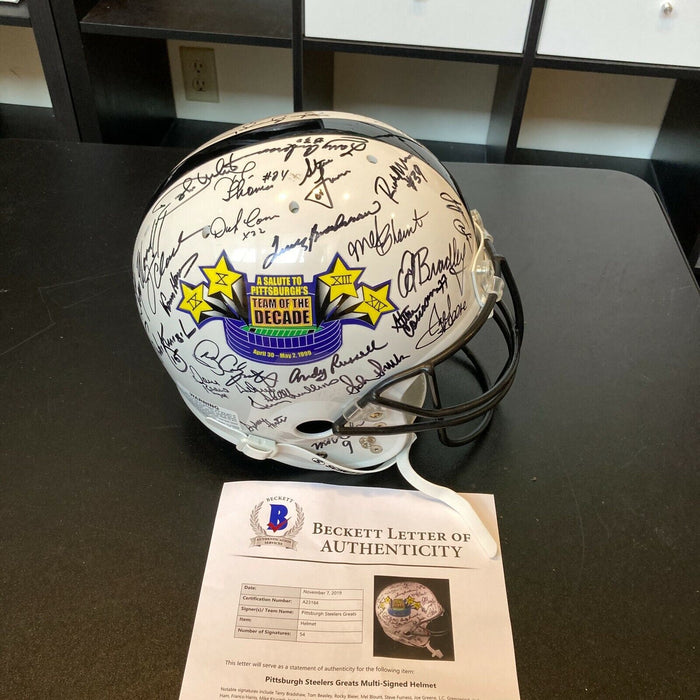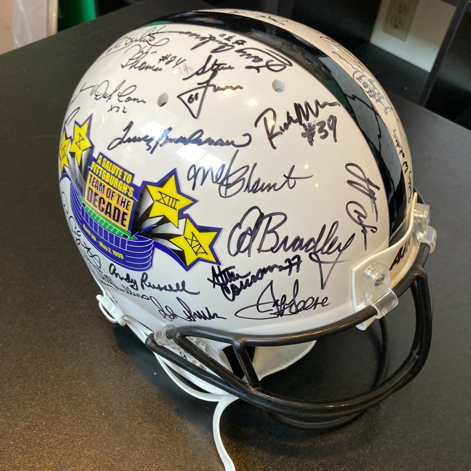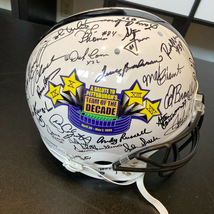 Full Size White football helmet signed in black Sharpie by 54 Pittsburgh Steelers all-time great football players. Included among the many signers are Terry Bradshaw, Franco Harris, Lynn Swann, John Stallworth, Tom Beasley, Rocky Bleier, Mel Blount, Steve Furness, Joe Greene, L. C. Greenwood, Jack Ham, Mike Kruczek, Jack Lambert, Chuck Noll (head coach), Andy Russell, Mike Webster, and Donnie Shell. Many of the players have also added their uniform numbers next to their signatures.The helmet features a special decal that reads "A Salute to Pittsburgh's Team of the Decade - April 30-May 2, 1999," which was the signing show at which the signatures on this helmet were obtained. The limitation-number "77/100" is written in black Sharpie on the rear of the helmet. The white Schutt Air IV helmet (size large) remains in Near Mint condition. Full LOA from Steve Grad and Brian Sobrero/Beckett Authentication Services.