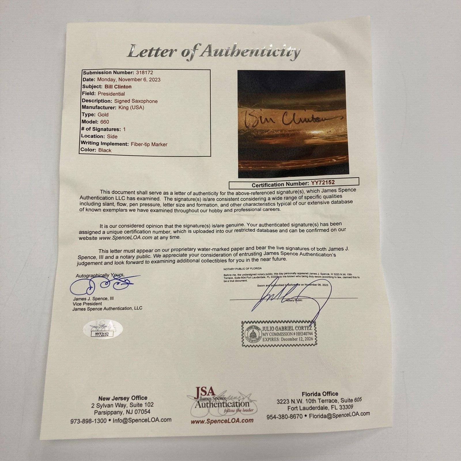 Presented is a saxophone signed by the 42nd president of the United States, Bill Clinton. Clint has penned his flowing signature in black marker along the outside of the bell. The saxophone comes with an LOA from JSA for signature. This exact item sold at auction in 2020 for $12,800.