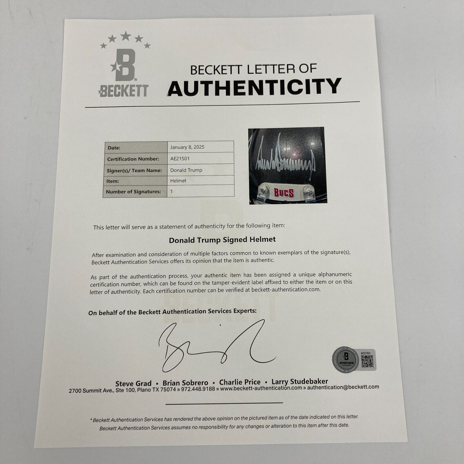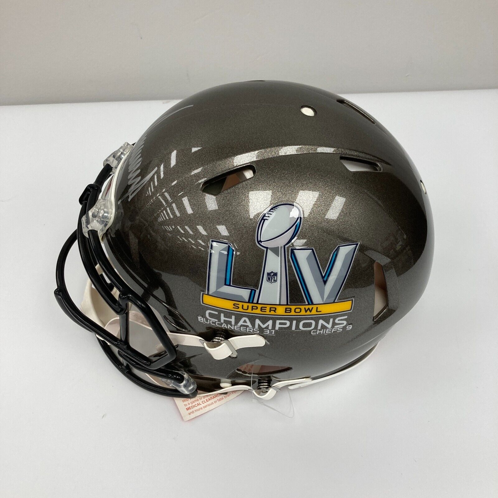 Magnificent President Donald Trump Full Name Signed authentic Tampa Bay Buccaneers Super Bowls Champs game model full size helmet. From a rare sitdown private signing with the President in Mar-a-Lago. Trump signed only a few pieces. Very rare full name signature, all the signatures you see online are quick and short. Bold mint signature. Comes with full letter Beckett COA.