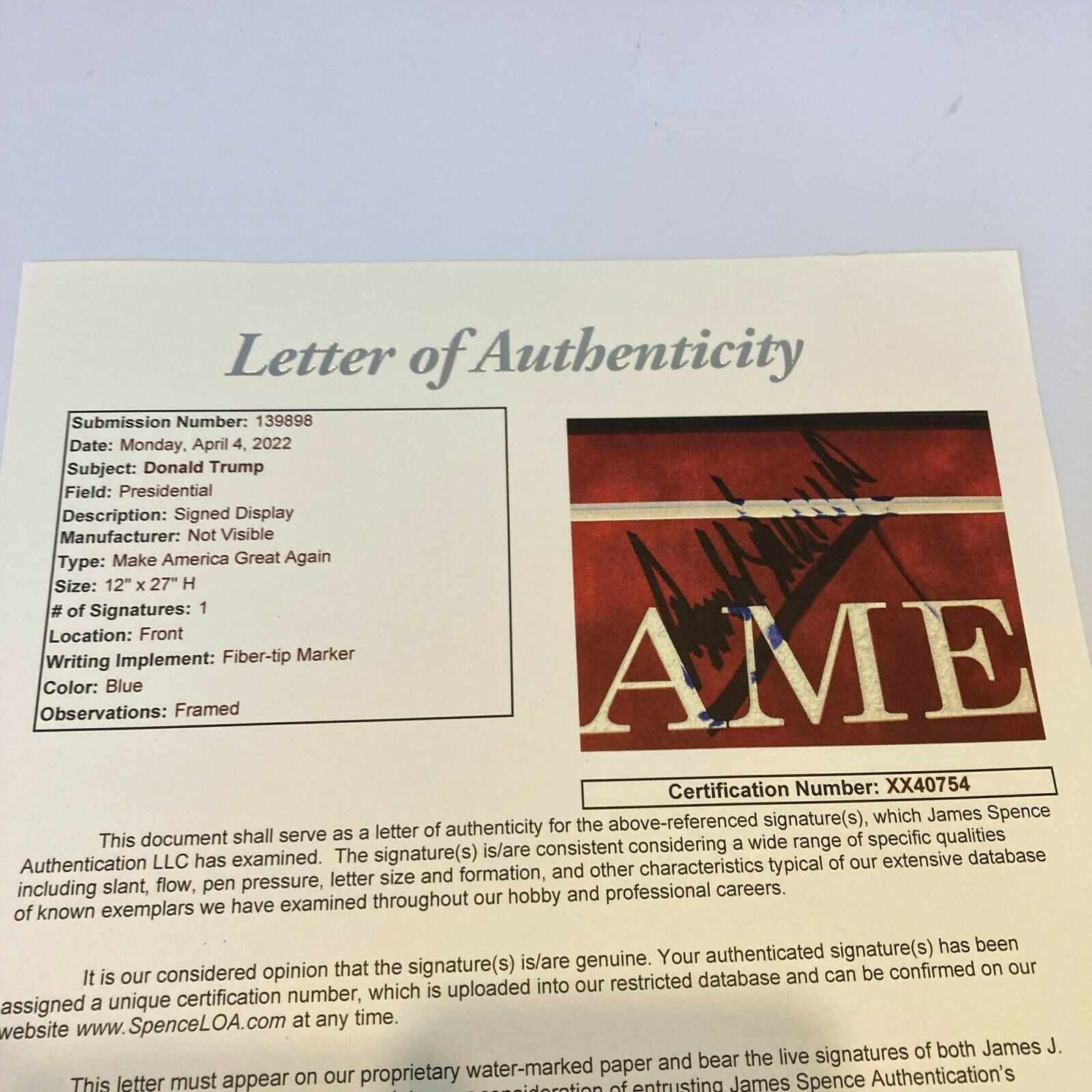 Beautiful President Donald Trump Signed Make America Great Again Large 12x27 Framed Display. Comes with full letter JSA COA.