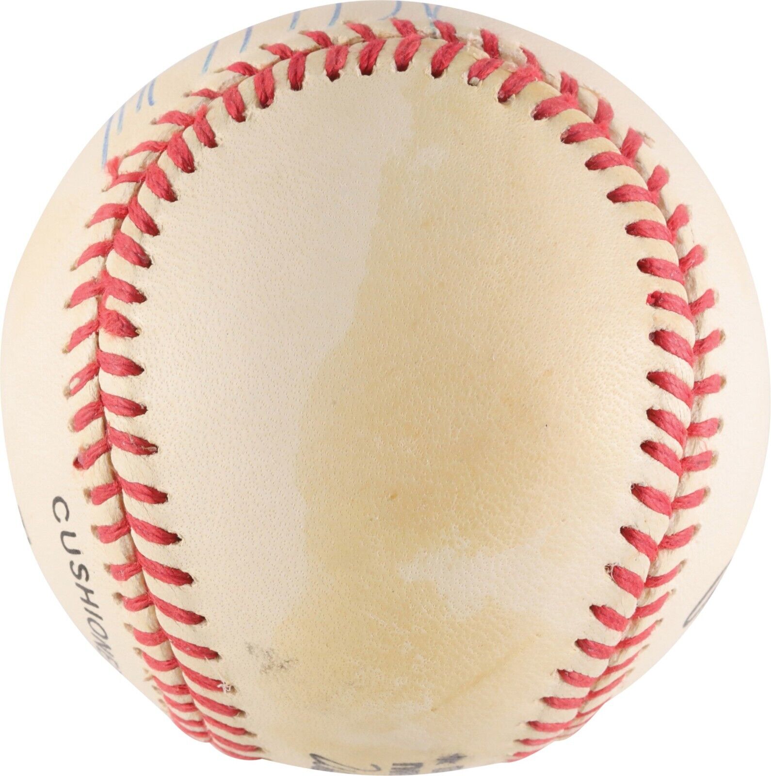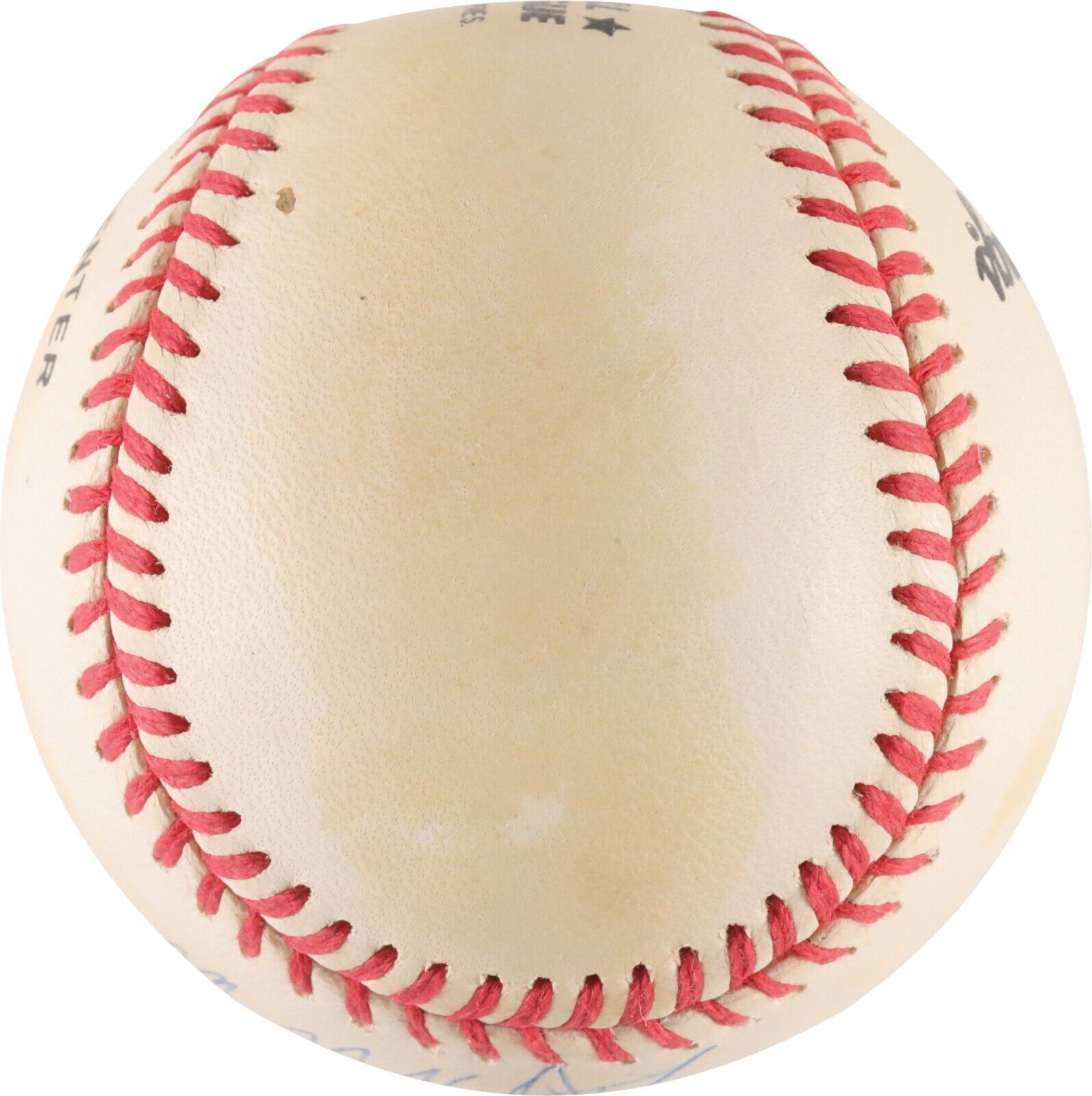 "At the New York Military Academy, I was captain of the baseball team," said Donald Trump. "I was supposed to be a pro baseball player." Displayed is a Donald Trump single-signed baseball. Donald Trump became a New York City real estate entrepreneur, the star of the television show The Apprentice, and then the 45th President of the United States. So, Donald Trump never did play professional baseball, and he never entered the military, and he became the only United States President not to have had prior military or government service prior to taking office. Trump was the U.S. President from 2017-21 after defeating Hilary Clinton in the 2016 Presidential race. Trump lost to former Vice President Joe Biden in the 2020 Presidential race, and Trump, barring any problems caused by looming legal issues, is on track to be the Republican Presidential nominee in 2024. Was Donald Trump fabricating a past baseball experience or exaggerating the extent of his baseball prowess? Writer Leander Schaerlaecken, in a May 5, 2020, article in Slate, researched the former President's claims, and found the following: Donald Trump was a co-captain of the baseball team at the New York Military Academy. He played first base, and he was very good defensively. Apparently, he was athletic and had a nice-looking baseball swing, but he didn't hit was as well as he swing might indicate. Thus, he was not really a professional prospect, but at a small, private school level he was a decent player. Donald Trump signed the offered baseball on the sweet spot. Ironically, in view of Donald Trump's previous policy as President of urging that tariffs be increased on Chinese goods, the signed baseball was manufactured in China. Trump signed the Spalding Official National League Ball (White) with his usual flair, using a blue ballpoint to pen an extroverted signature with big, angular letters. The signed ball comes with a PSA LOA for the signature.