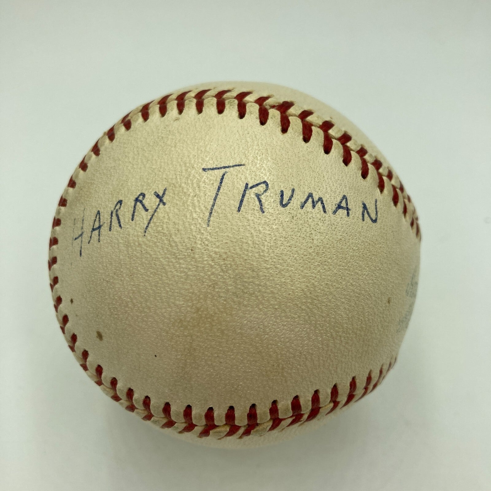 Presidential single-signed baseballs dating from the 1950s are highly desirable and rare. This single-signed ball by Harry S. Truman, 33rd president of the United States, is an extreme rarity. Truman has signed the official American League baseball (Harridge) in bold black fountain pen across the sweet spot. He has added the date "6-27-59" and his hometown "Independence, MO." directly below his signature. Truman's name "Harry Truman" is printed on a side panel in blue ink. Truman was a great fan of our national pastime. The record shows that Truman attended more Major League games than any other U. S. President, including eight season openers in Washington where he threw out the ceremonial first pitch. For anyone attempting to assemble a complete run of signed presidential baseballs, this is an extremely rare opportunity. In Excellent condition overall. Full LOA from James Spence/JSA.