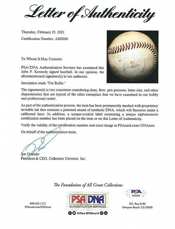 Historic President John F. Kennedy single signed Official 1960-1962 American League (Joe Cronin) Baseball. One of the few JFK single signed baseballs known to exist. This comes from the estate of former Washington Senators Catcher and Coach Rollie Hemsley. This is most likely the first pitch of the game that JFK threw out on April 10, 1961 at the Senators Opening Day game. Ball shows nice game use. Video footage of the first pitch can be seen online. You can see the President throwing out the first pitch and one of the Senators players catching it and JFK signing the ball. Comes with full letter PSA DNA COA.