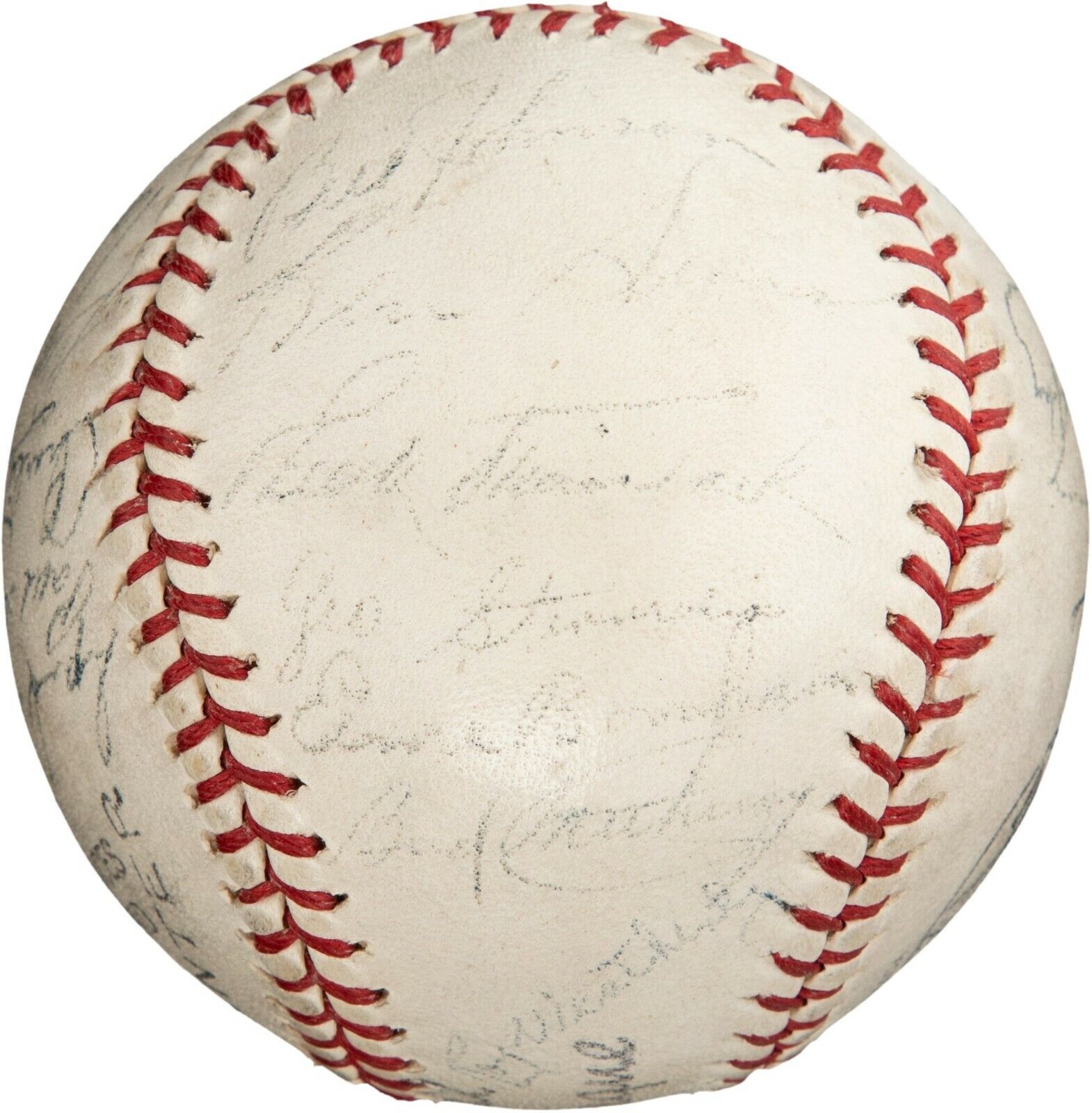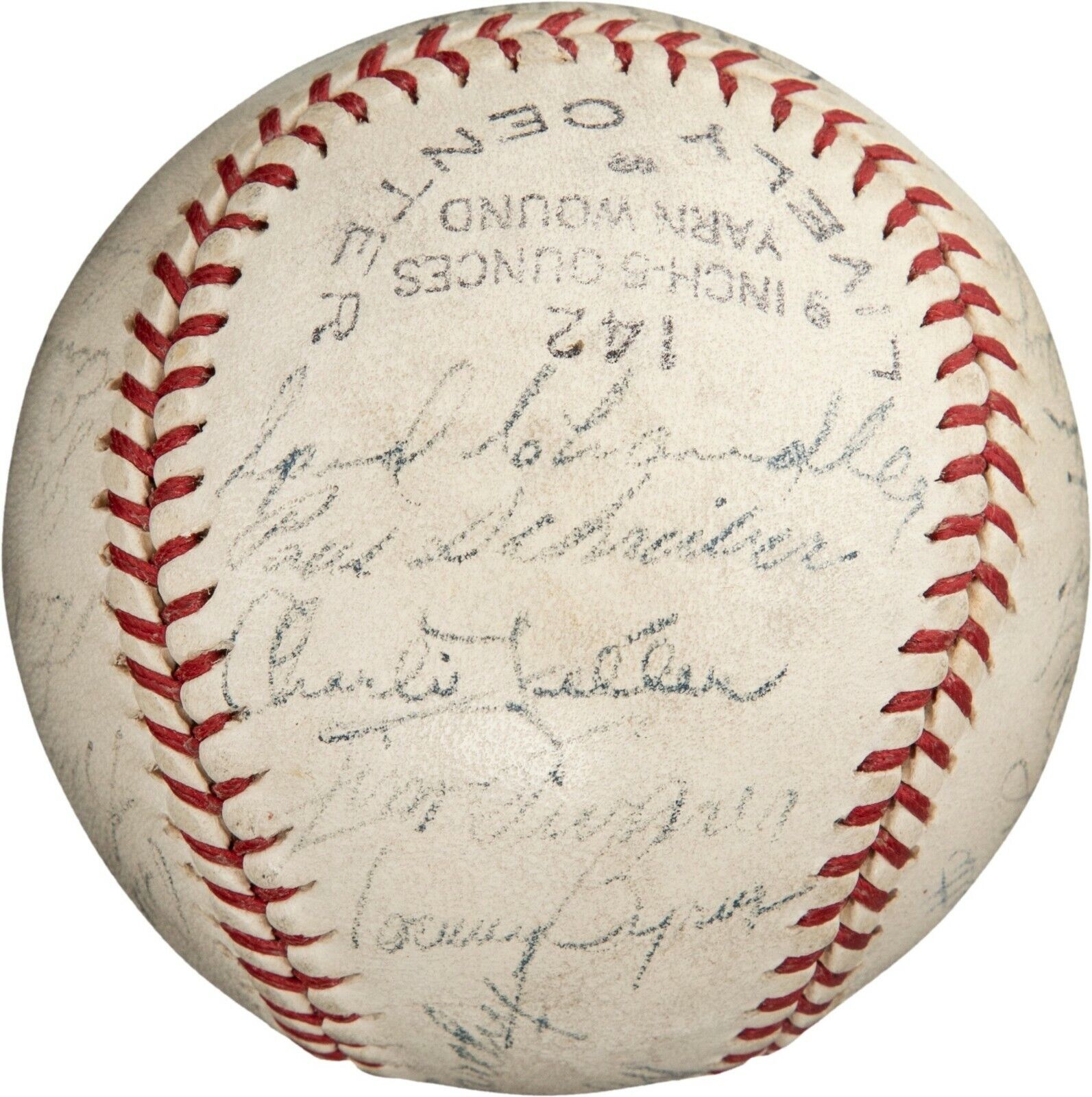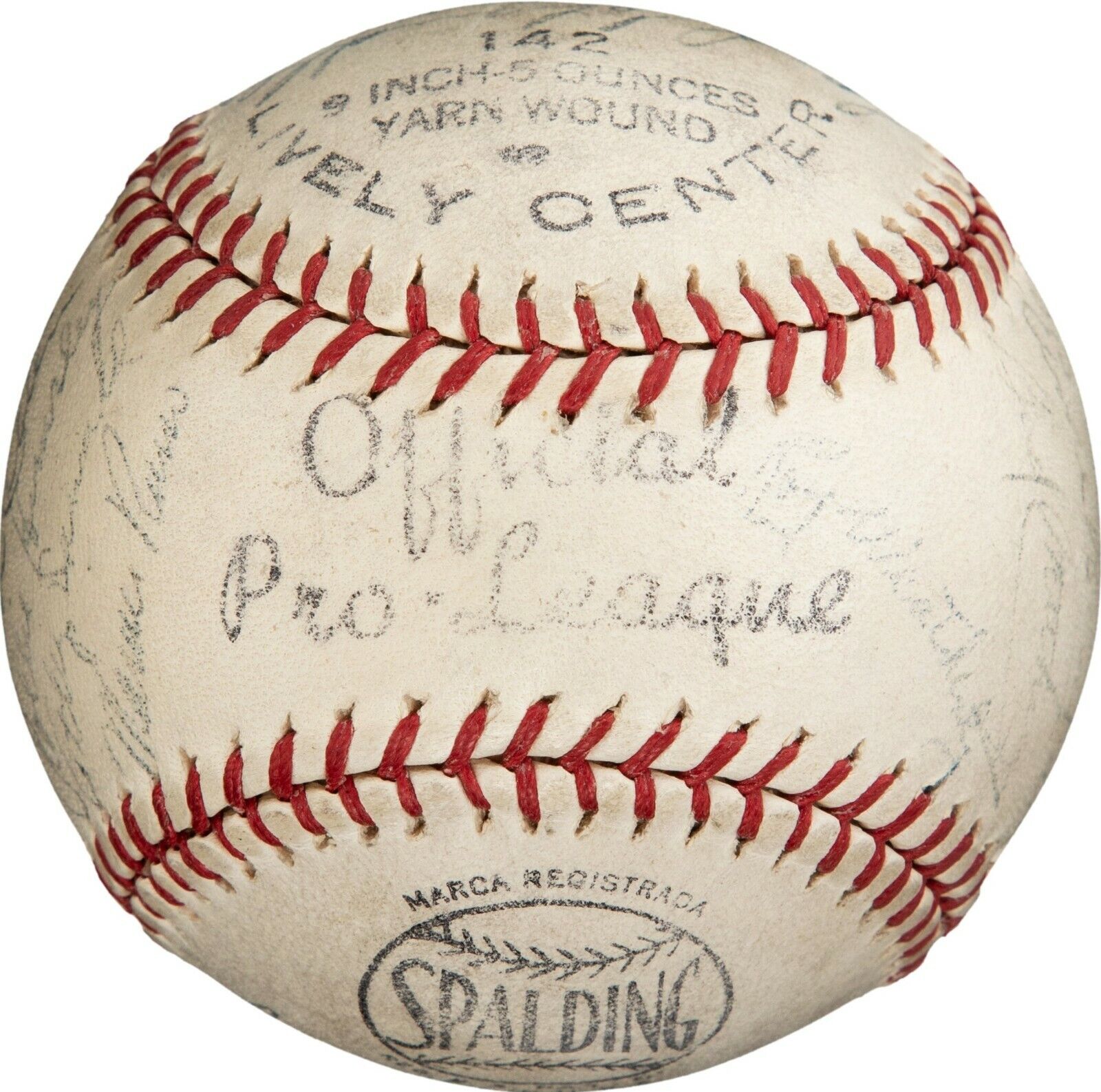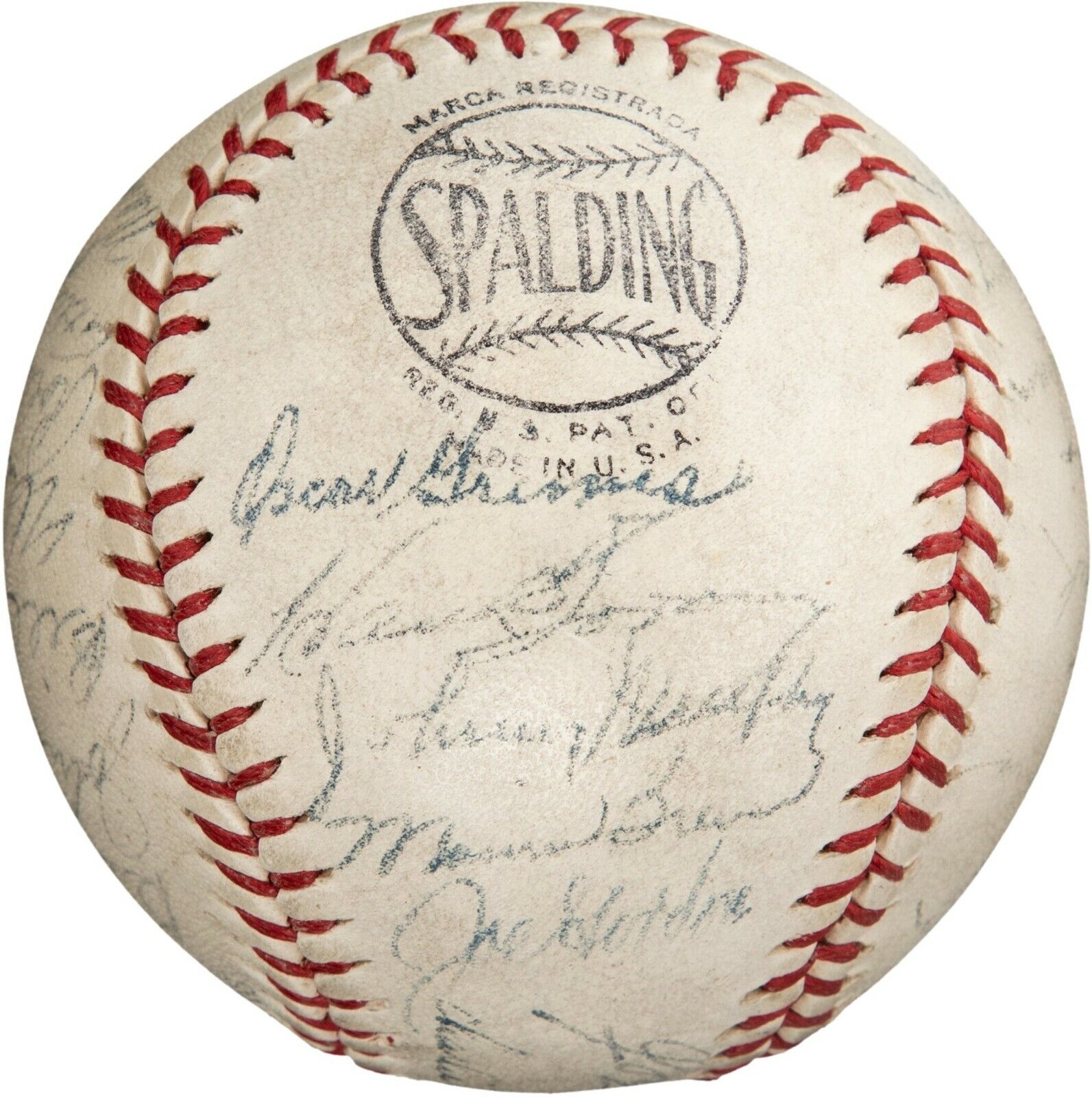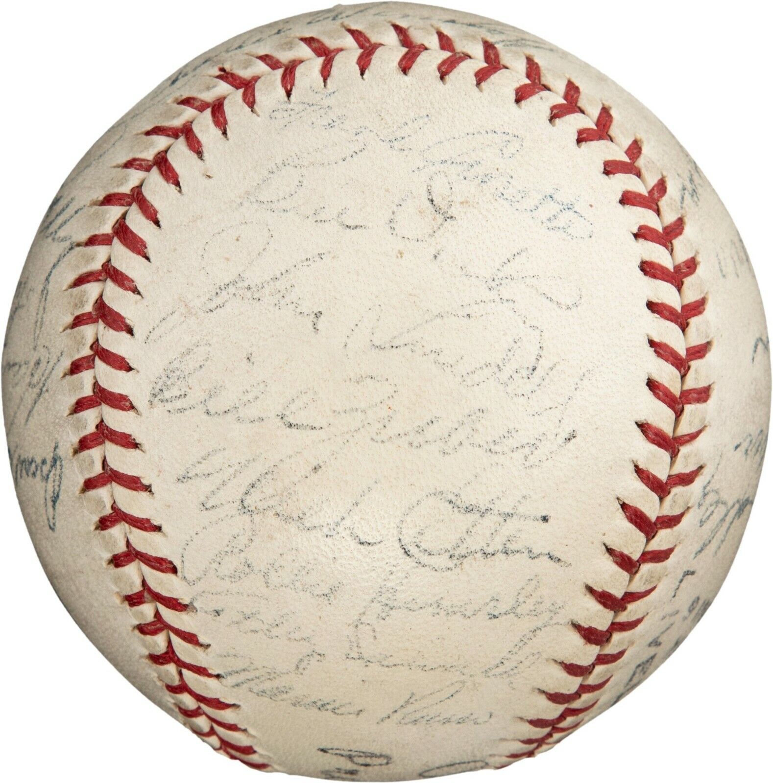 1943 New York Yankees Team Signed Baseball. The Yankees were still winning titles during World War II. This exemplar is signed by a total of twenty-seven 1943 World Series champion Bronx Bombers, including Hall of Famers Joe McCarthy (sweet spot), Bill Dickey, and Joe Gordon. Others present include league MVP Spud Chandler, Charlie Keller, Frank Crosetti, Paul Schrieber, Tommy Byrne, Oscar Grimes, Bill Johnson, George Stirnweiss, Rollie Hemsley, Johnny Lindell, Bill Zuber, Nick Etten, Marius Russo, Roy Weatherly, Butch Wensloff (sweet spot), Hank Borowy, Johnny Murphy, Marv Breuer, Jim Turner, Tiny Bonham, Bud Metheny. "Official Pro-League" baseball is still quite white and nice. All signatures are authentic, there are no clubhouse signatures (very rare). Full LOA from PSA/DNA.