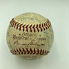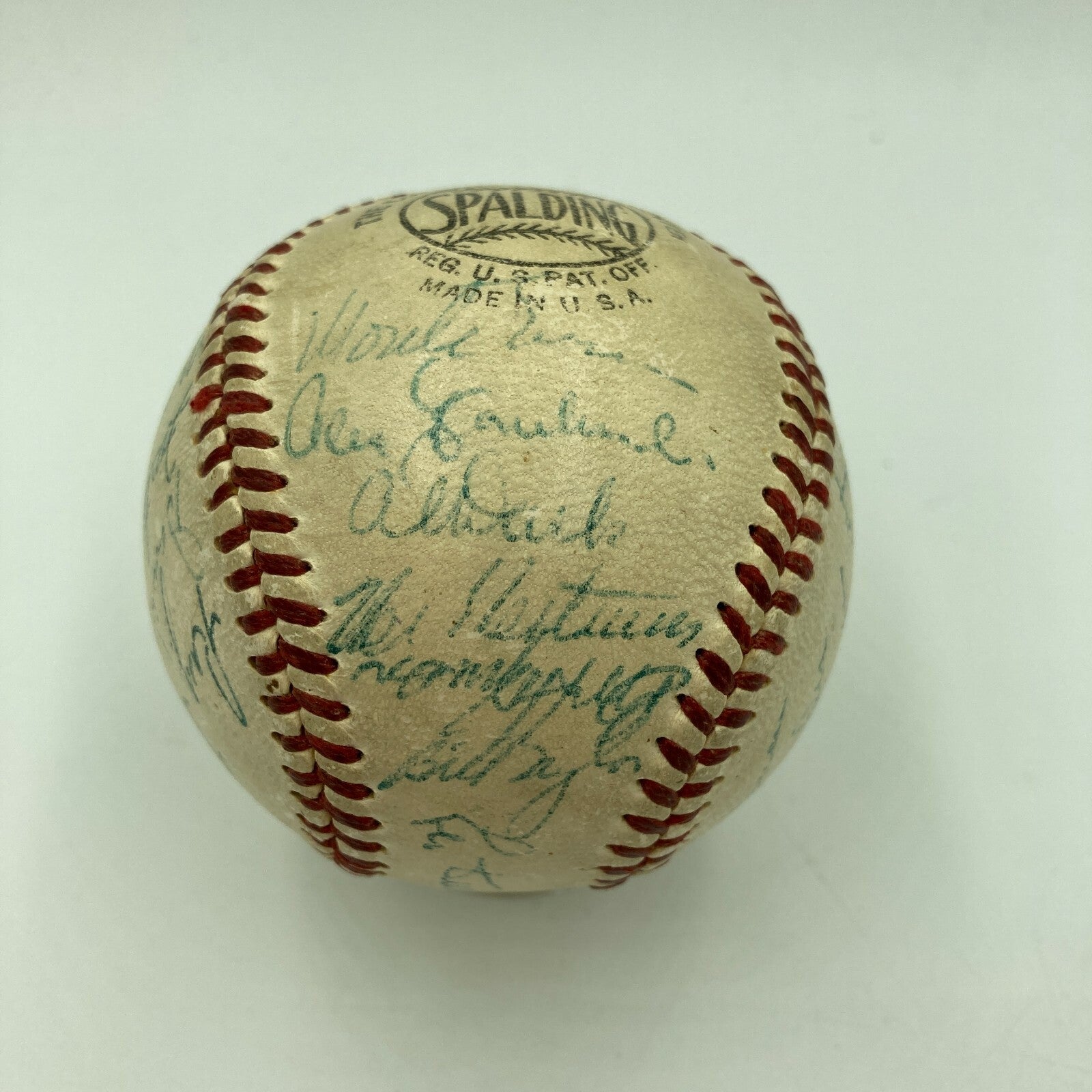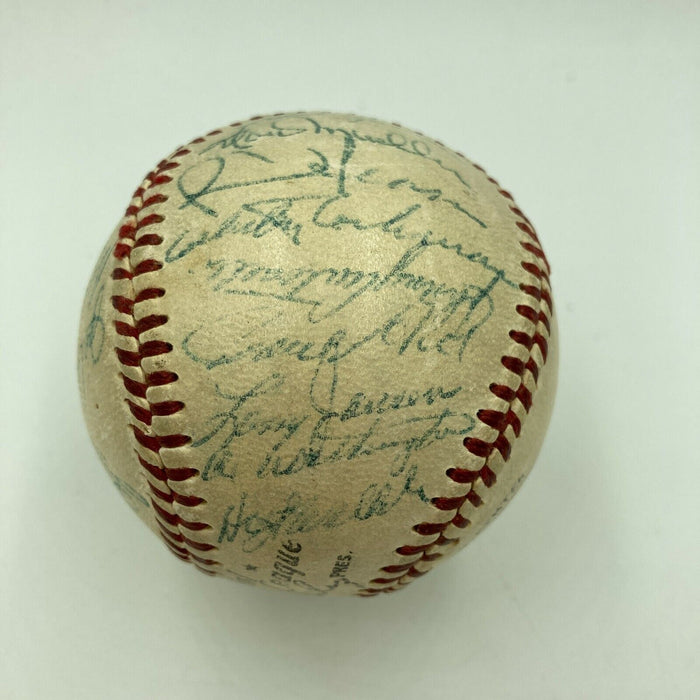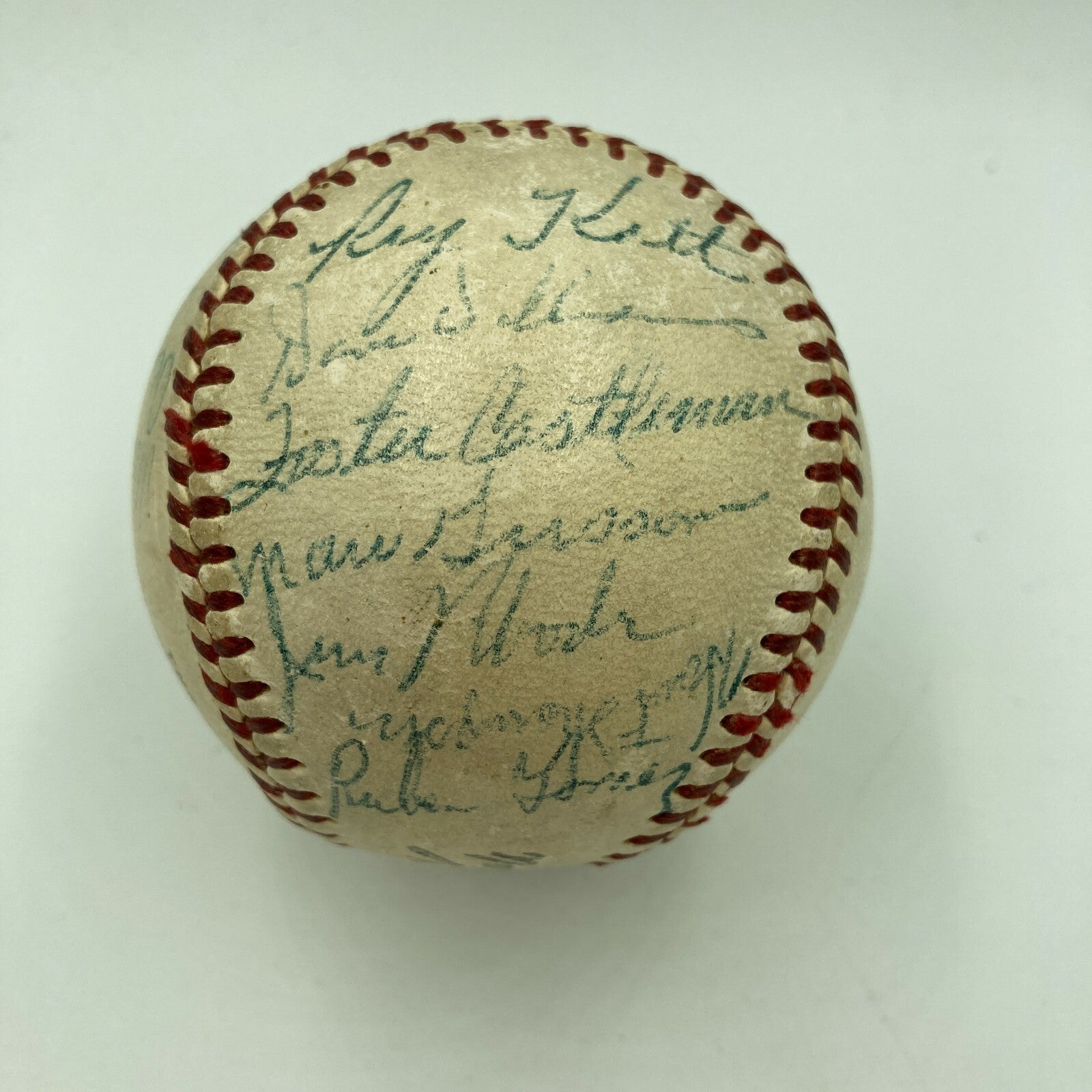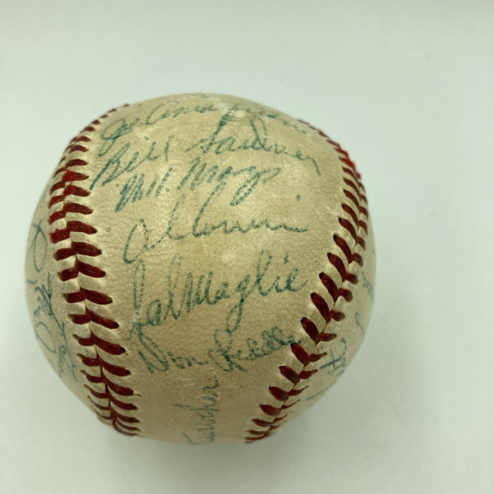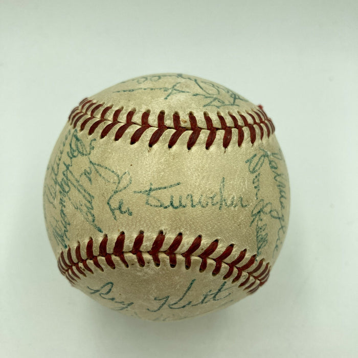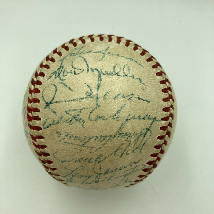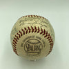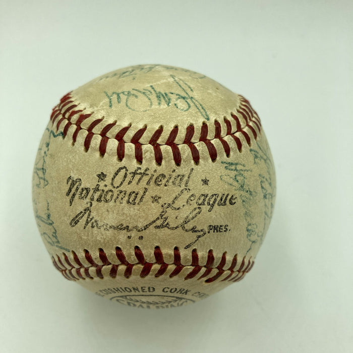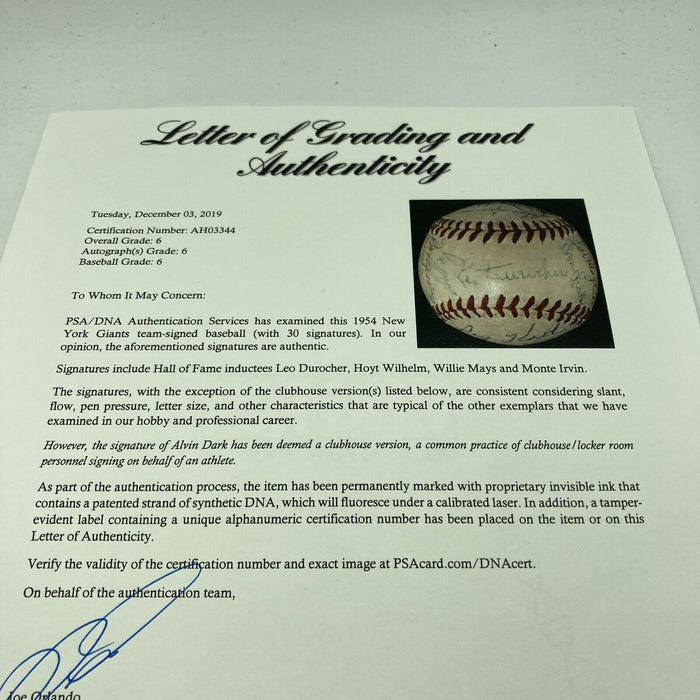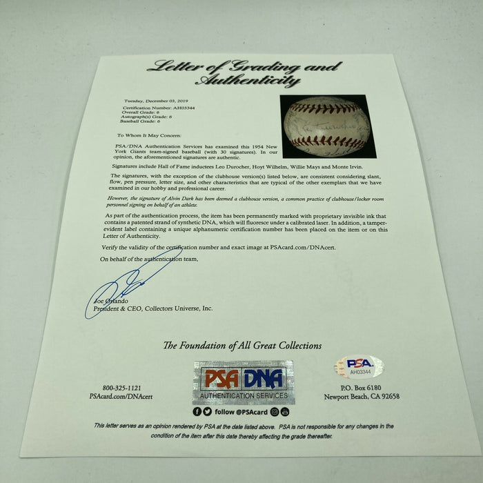 Official National League (Giles) ball signed in blue ink by 30 members of the 1954 World Champion New York Giants. Graded EX-MT 6 by PSA/DNA (signatures graded EX-MT 6 on average, ball graded EX-MT 6; resulting in a final grade of EX-MT 6). The thirty signatures appear on the ball are those of Durocher (sweet spot), Willie Mays, Irvin, Wilhelm, Mueller, Spencer, Hearn, Lockman, Antonelli, Giel, Jansen, Worthington, Gomez, Thompson, Rhodes, Grissom, Castleman, Williams, Katt, McCall, Amalfitano, Gardner, Corwin, Maglie, Liddle, Taylor, Westrum, Thomson, and Konikowski. Full LOA from PSA/DNA