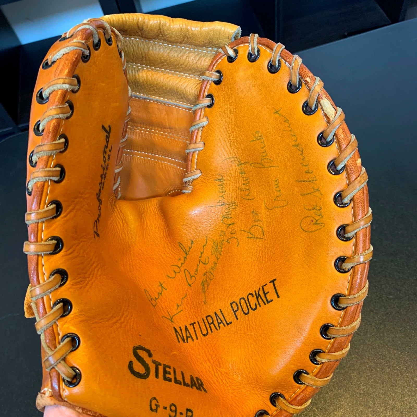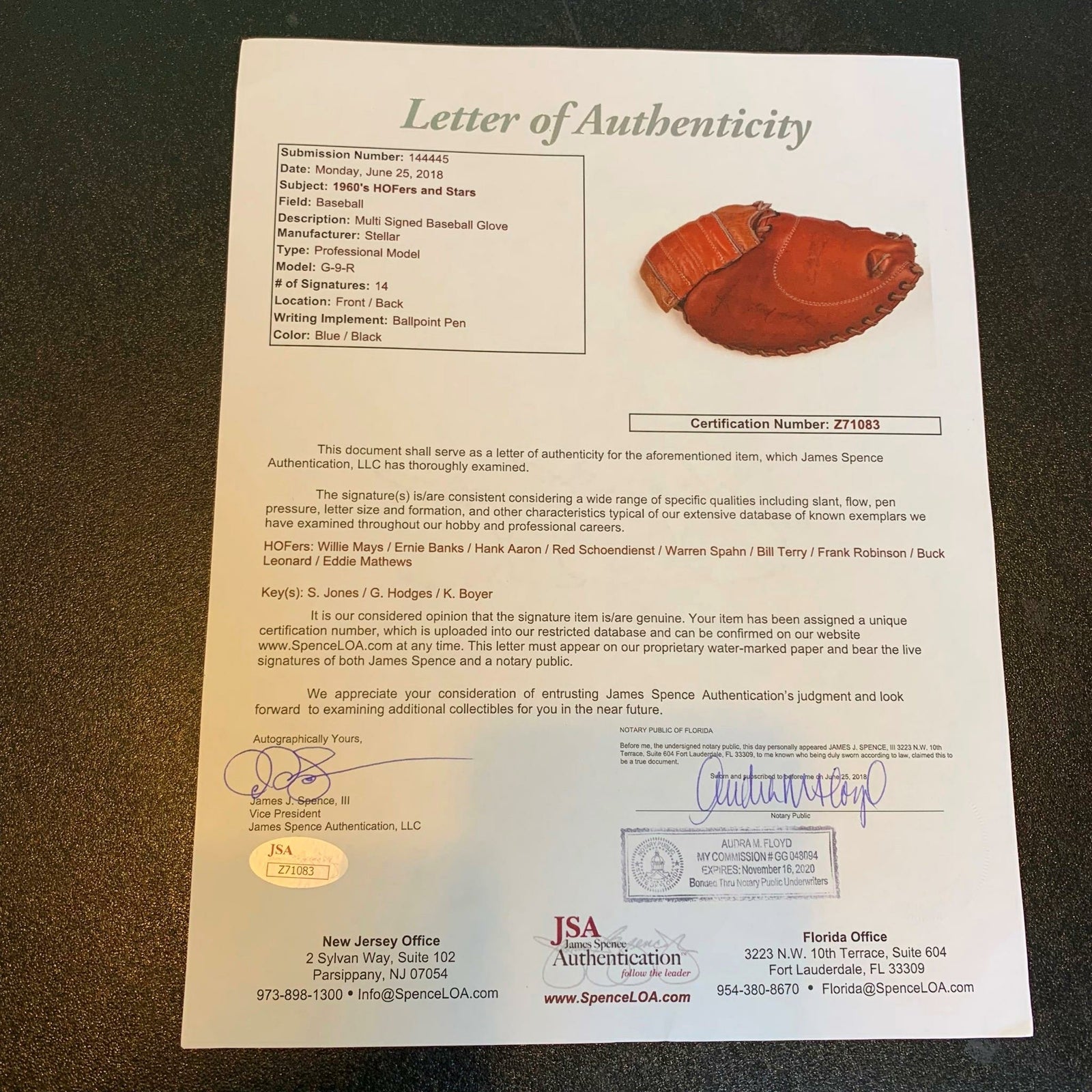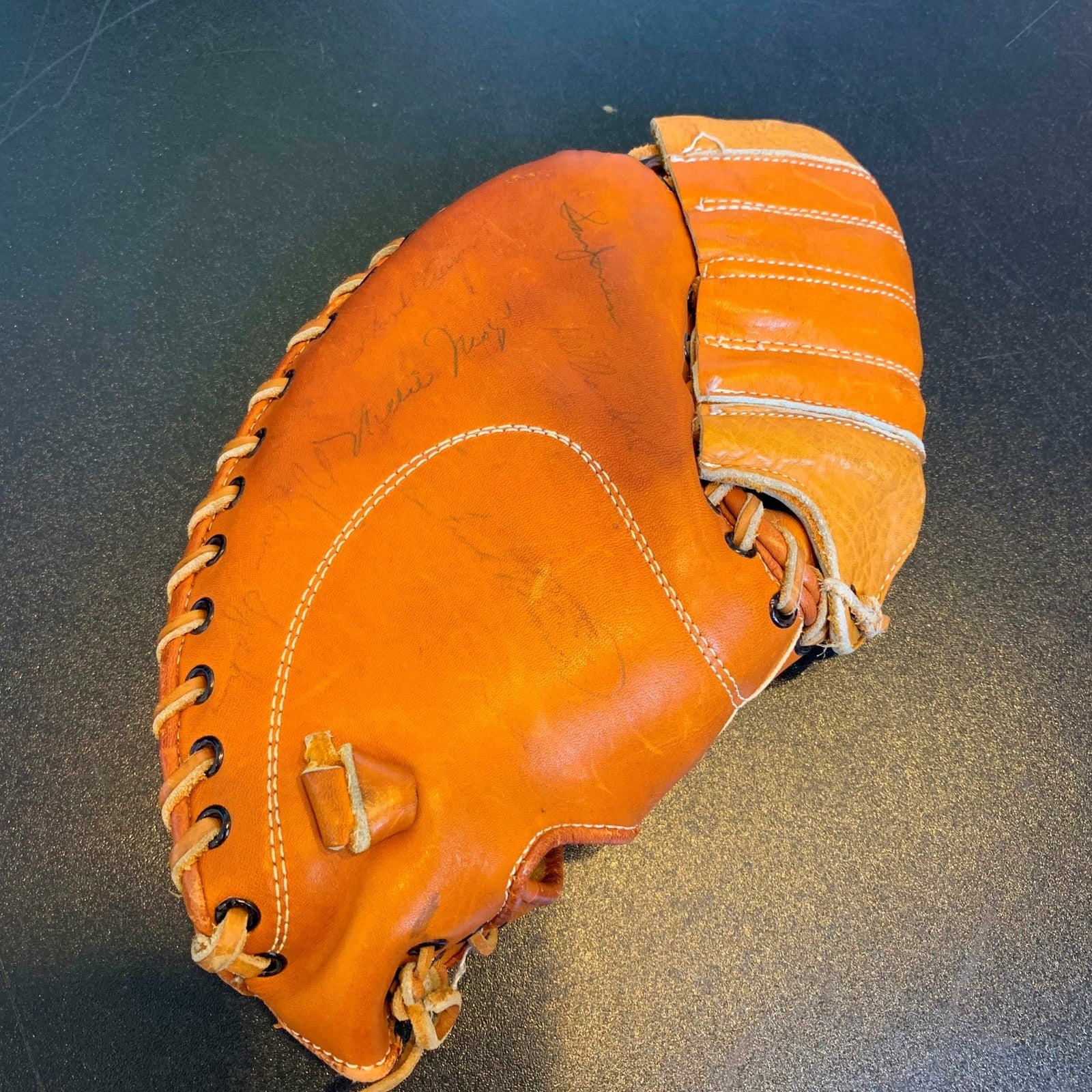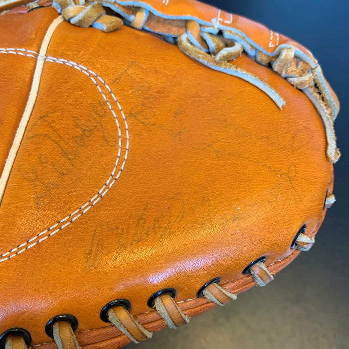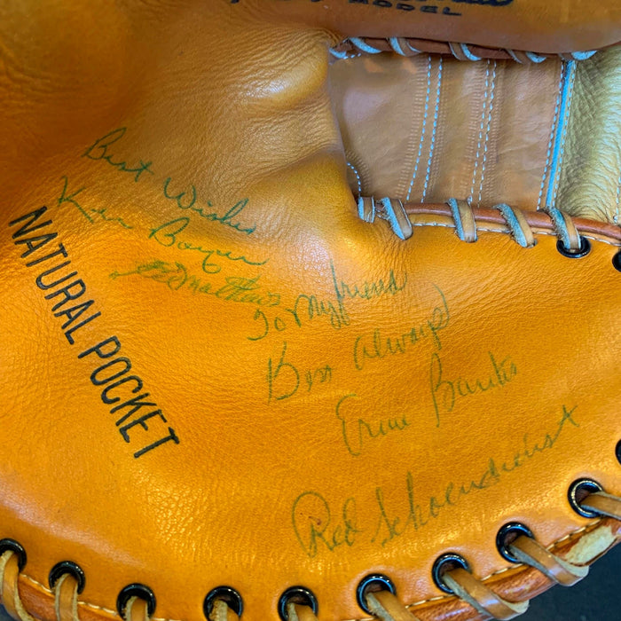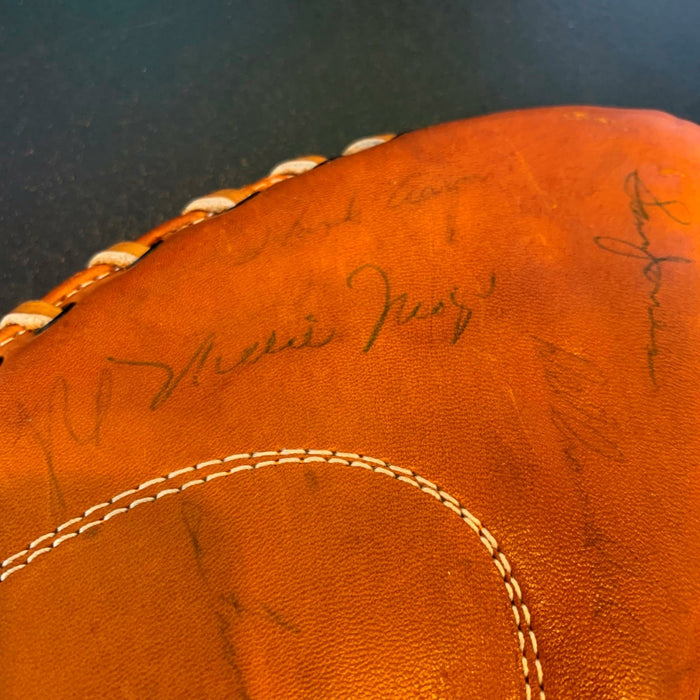 Rare 1950's Hall Of Fame multi signed glove. 14 signatures with Willie Mays, Hank Aaron, Ernie Banks, Red Schoendienst, Warren Spahn, Bill Terry, Frank Robinson, Buck Leonard, Eddie Mathews, Sam Jones, Gil Hodges and Ken Boyer. Full letter JSA COA.