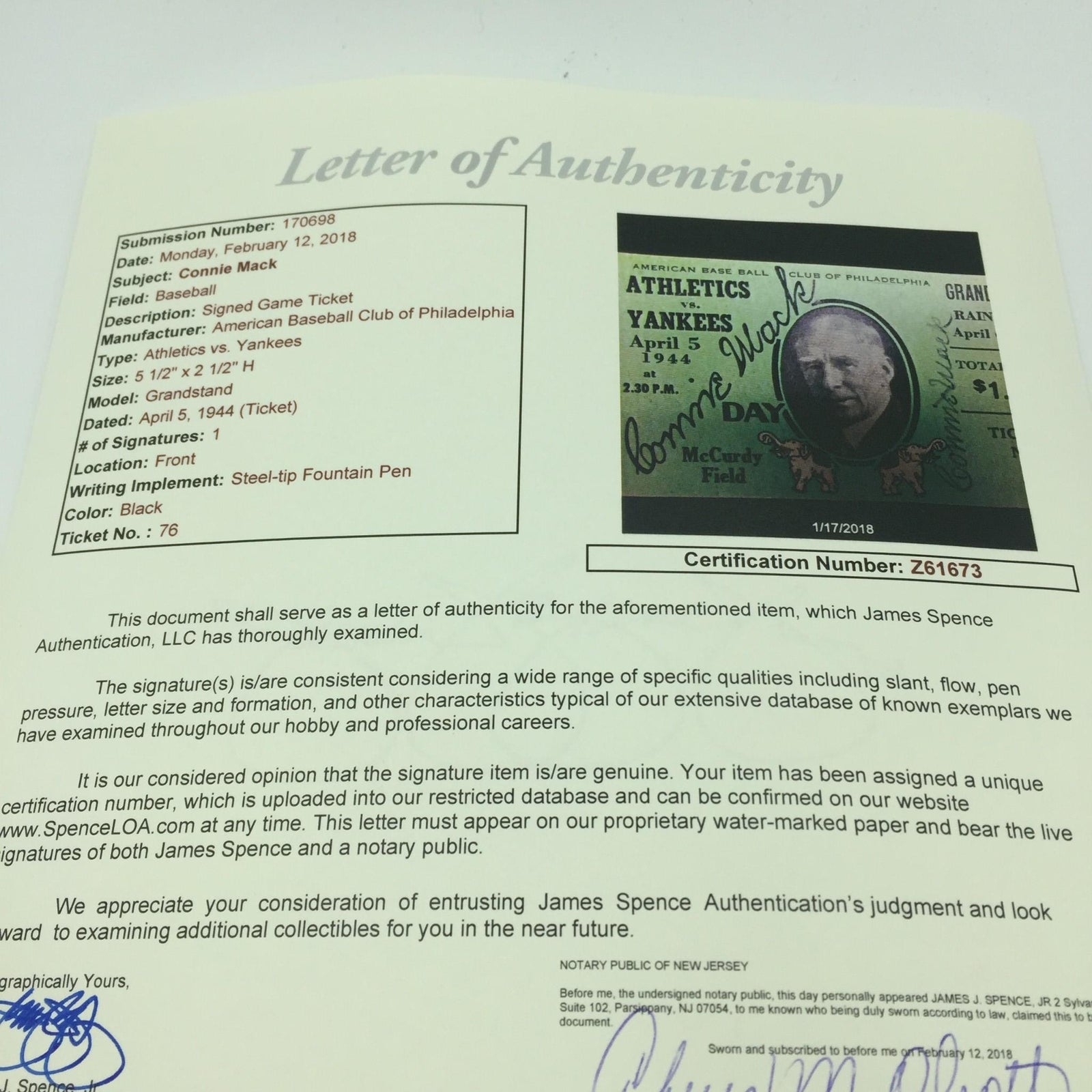 1944 Connie Mack Day Signed Ticket. Nobody on planet Earth saw more baseball than Connie Mack. Always dressed in his Sunday best, Mack tops the list of winningest manager in big league history. The Hall of Fame skipper signed this Connie Mack Day ticket across the side in black fountain pen. Comes with full letter JSA COA.