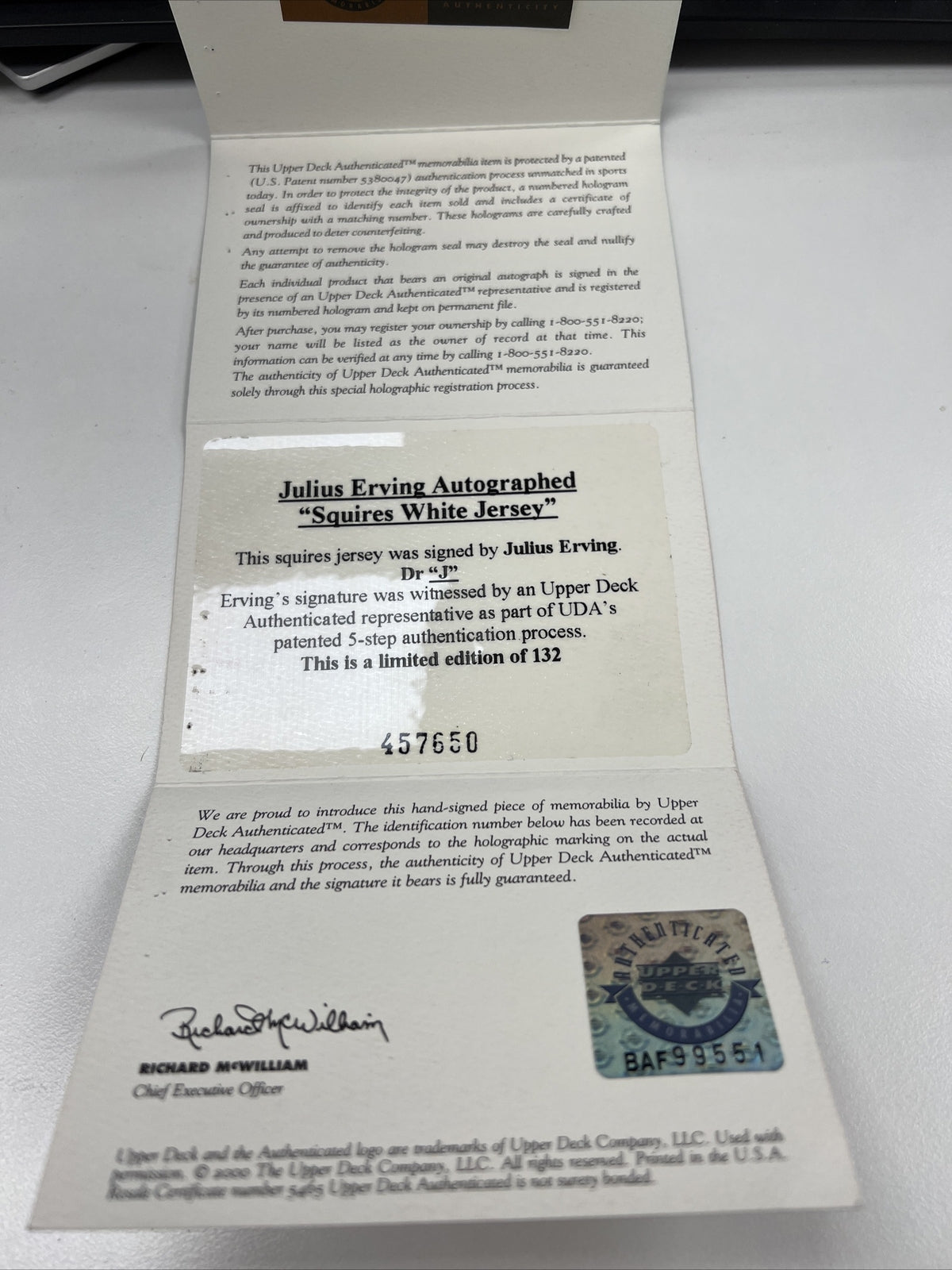 Julius Erving Signed Virginia Squires UDA Jersey. One of the more popular basketball UDA issues, this Virginia Squires jersey was signed by Dr. J Julius Erving. Numbered 99/132, it is signed on the front sewn-on numeral in Mint silver ink. In addition, a Mitchell & Ness tag is in the tail. COA from UDA #BAF99551.