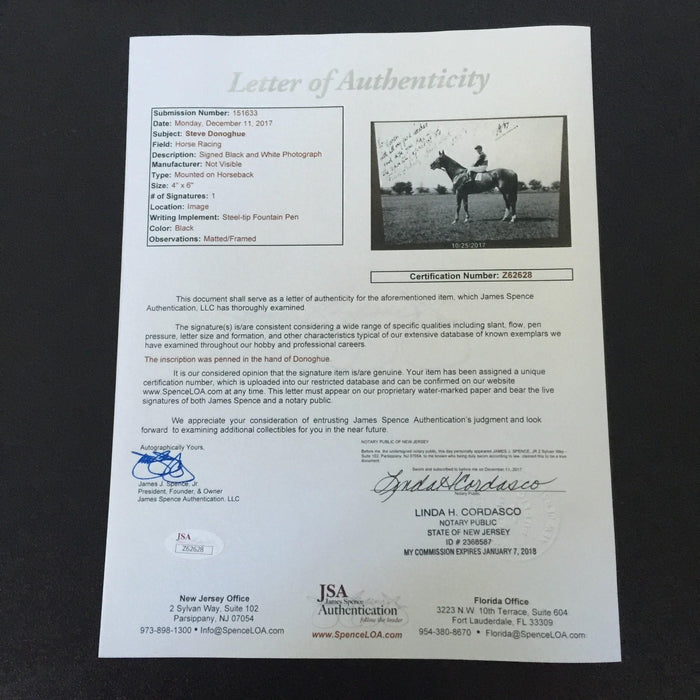 Click or scroll to zoom Tap or pinch to zoom Click or scroll to zoom Tap or pinch to zoom Click or scroll to zoom Tap or pinch to zoom Click or scroll to zoom Tap or pinch to zoom Rare Steve Donoghue 1937 Signed Photo Legendary British Horse Jockey JSA COA $199.00 1 2 3 4 5 6 7 8 9 10+ Quantity Quantity Add to cart This item is a recurring or deferred purchase. By continuing, I agree to the cancellation policy and authorize you to charge my payment method at the prices, frequency and dates listed on this page until my order is fulfilled or I cancel, if permitted. Rare Steve Donoghue 1937 Signed 4x6 Photo. The photo has been professionally framed. Comes with full letter JSA COA. #9693726
