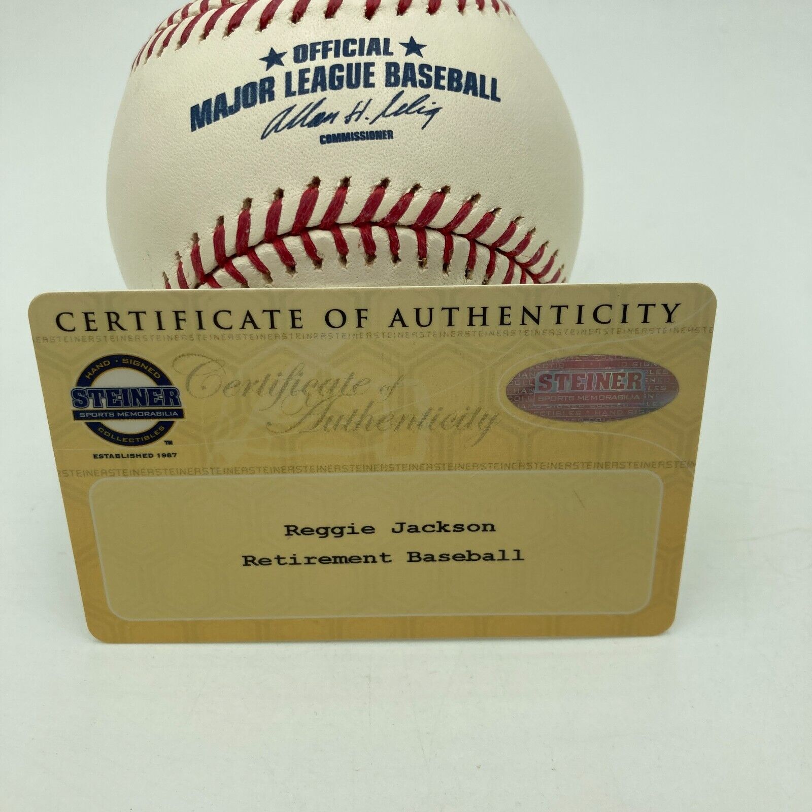 Offered is a Rawlings Official Major League Bud Selig Hall of Fame baseball signed on the sweet spot by Reggie Jackson who has also inscribed "#9 5-22-04" and "#44 8-14-93" in commemoration of his number being retired by both the Athletics and Yankees franchises. Numbered 99/250 with Steiner hologram/COA card also attending.