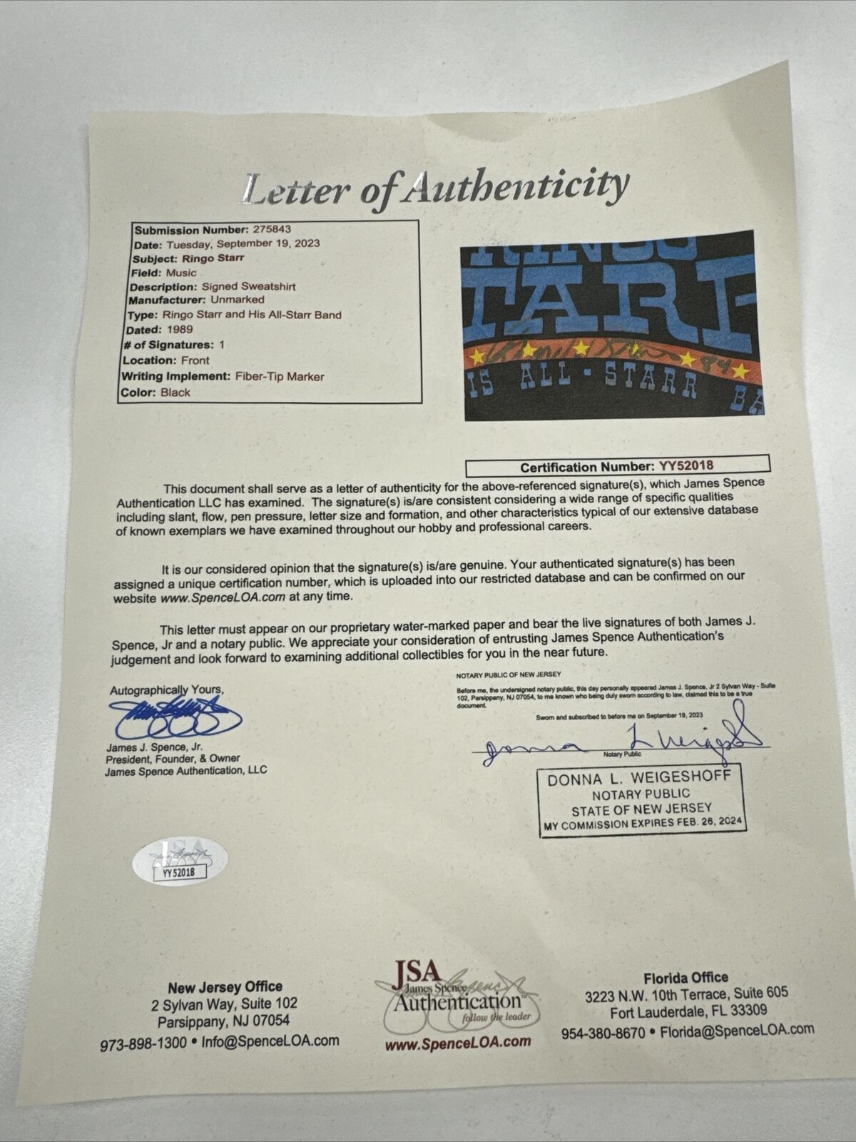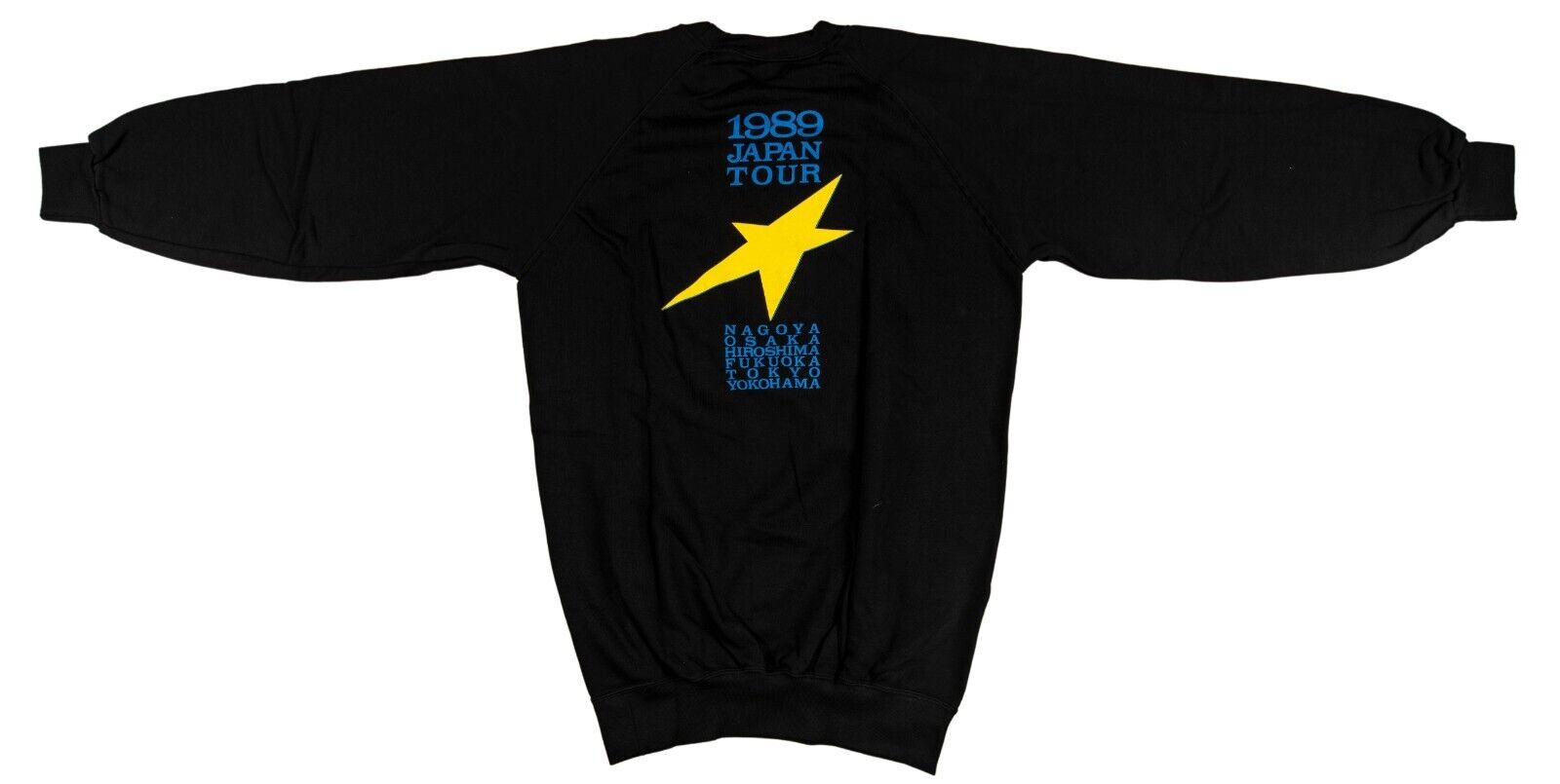 Ringo Starr, a universally admired songwriter and former drummer for the Beatles, has signed this black "Ringo Star And His All-Starr Band" sweater on the front in black marker, adding the year of the band's tour, "89," after the autograph. The reverse side reads "1989 Japan Tour / Nagoya / Osaka / Hiroshima / Fukuoka / Tokyo / Yokohama" in blue font. The sweater comes with an LOA from JSA for Starr's signature.