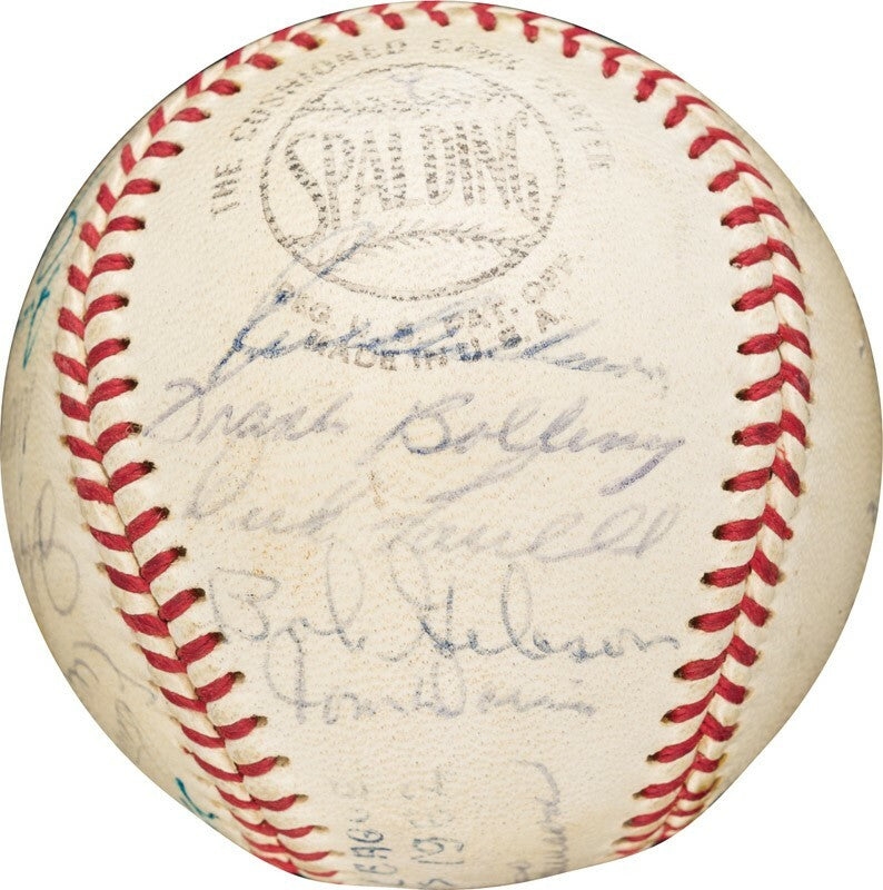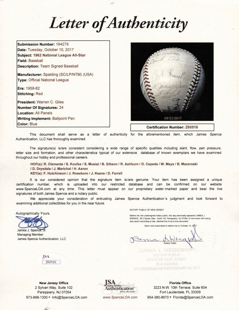This Official National League baseball has been signed by 24 members of the National League All-Stars of 1962 who won the All-Star Game 3-1. This was the 32nd All-Star Game. President John F. Kennedy was the second president to attend the event and threw out the first pitch. A highlight of the game was the first presentation of the Arch Ward Trophy. It was first presented in 1962 as a tribute to the man who helped found the All-Star Game in 1933. That first presentation went to Leon Wagner of the Los Angeles Angels (second game MVP) and to Maury Wills of the Los Angeles Dodgers (first game MVP). Players who have signed the baseball include Roberto Clemente, Hank Aaron, Willie Mays, Don Drysdale, Juan Marichal, Bill Mazeroski, Orlando Cepeda, Richie Ashburn, Bob Gibson, Stan Musial and superstar Ken Boyer. Roberto Clemente was a key contributor with three hits in the game! Baseball come with a full LOA from PSA/DNA and JSA.