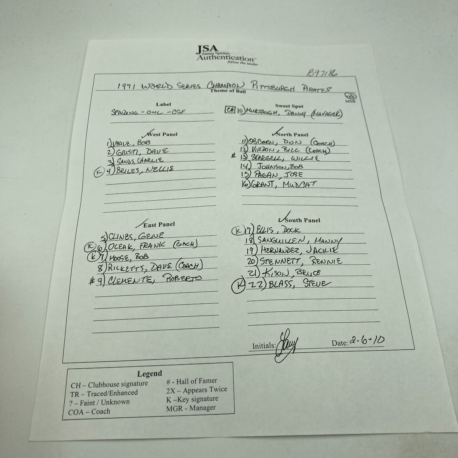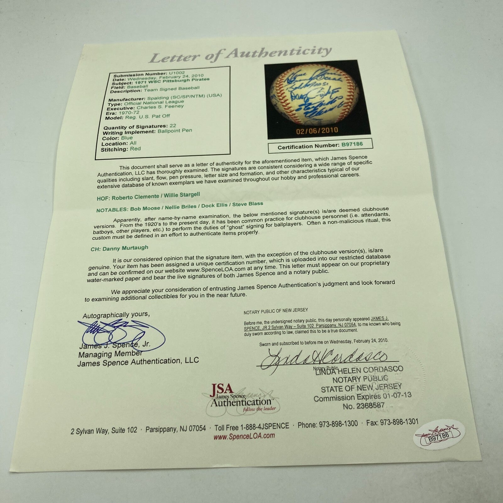 Beautiful 1971 Pittsburgh Pirates World Series Champs Signed Official National League Feeney Baseball. 22 signatures with Roberto Clemente, Willie Stargell and many others.