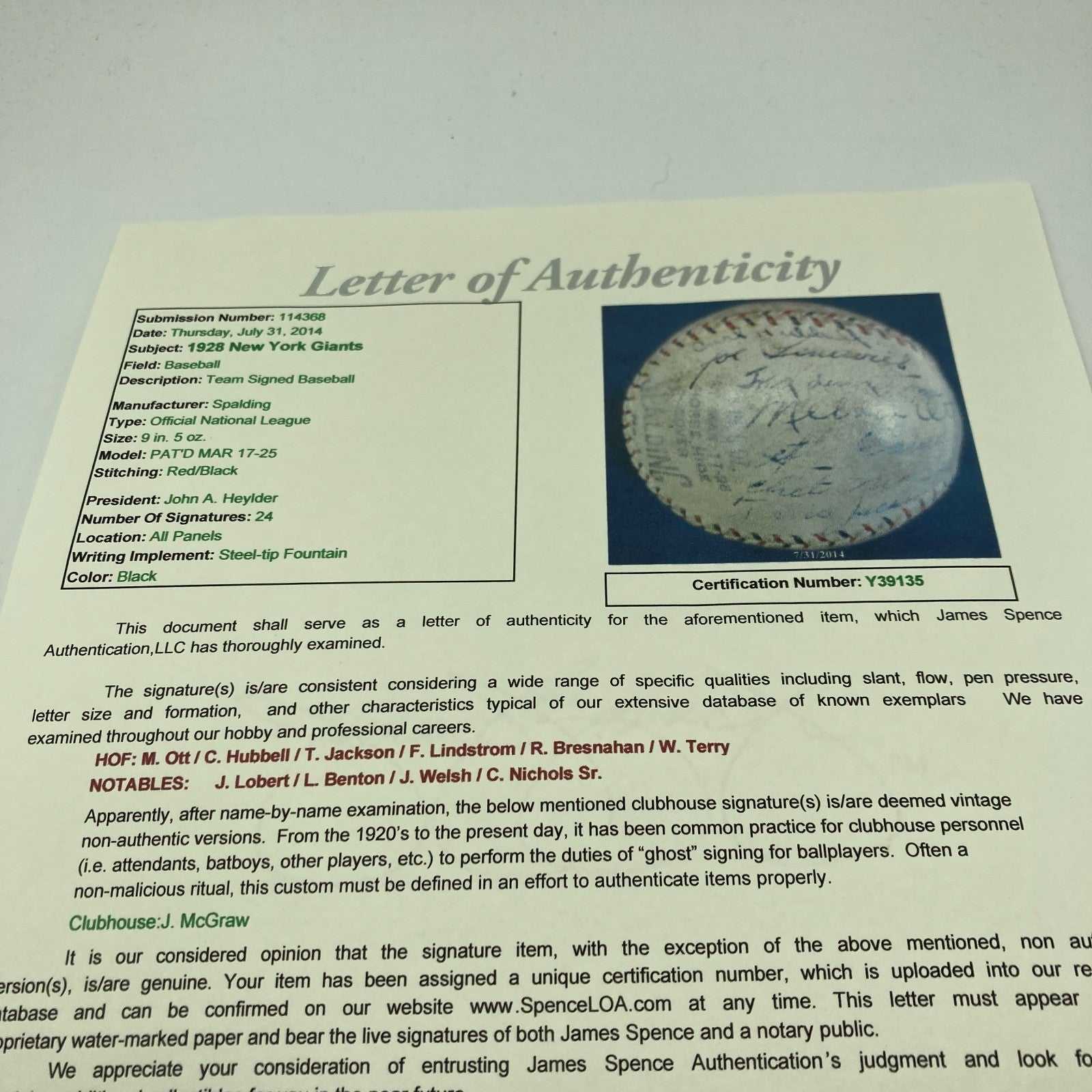 Red and black stitched Spalding J.Heydler Official National League baseball has been signed by (24) with notables including Roger Bresnahan, Lefty O'Doul, Mel Ott, Carl Hubbell, Travis Jackson, Fred Lindstrom, Bill Terry, and Hans Lobert. John McGraw is clubhouse. Includes full LOA from JSA: