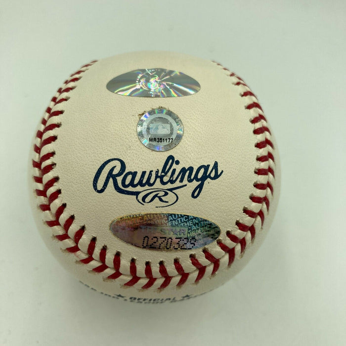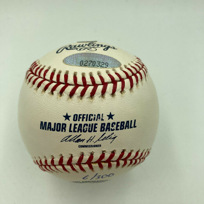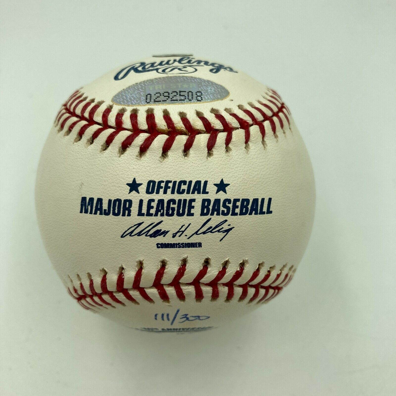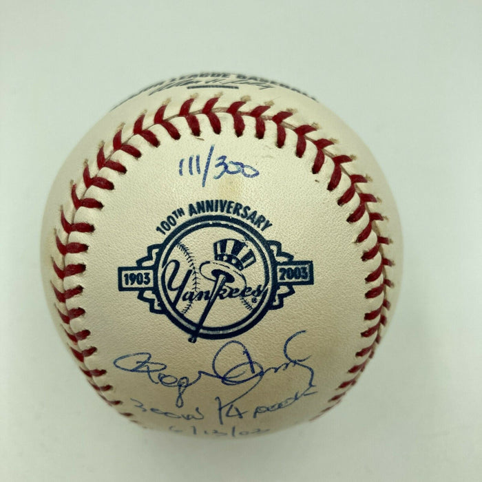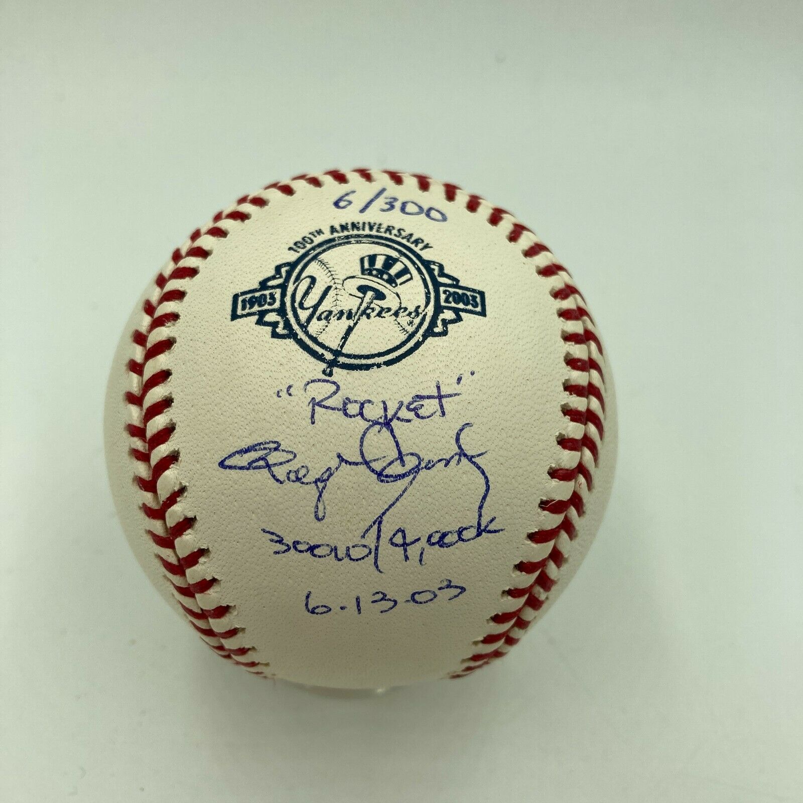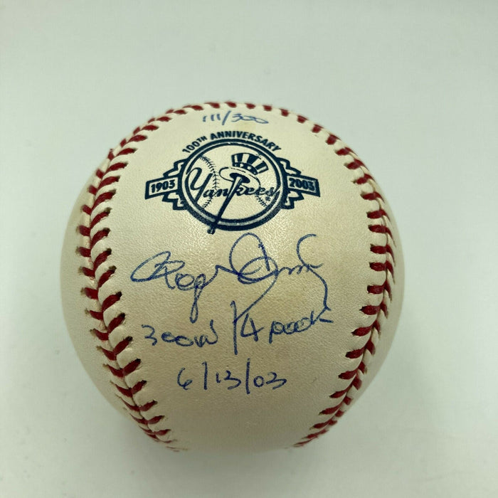 Roger Clemens signed and inscribed Major League Selig New York Yankees 100th Anniversary 1903-2003 baseball. Clemens signed his name in blue pen below the Yankees anniversary stamp and inscribed “300 W 4000 K 6/13/03” below his signature. This ball is inscribed “111/300” in blue pen. This item comes with a sticker from TriStar (0292508) and an MLB Authenticated hologram (MR276659).
