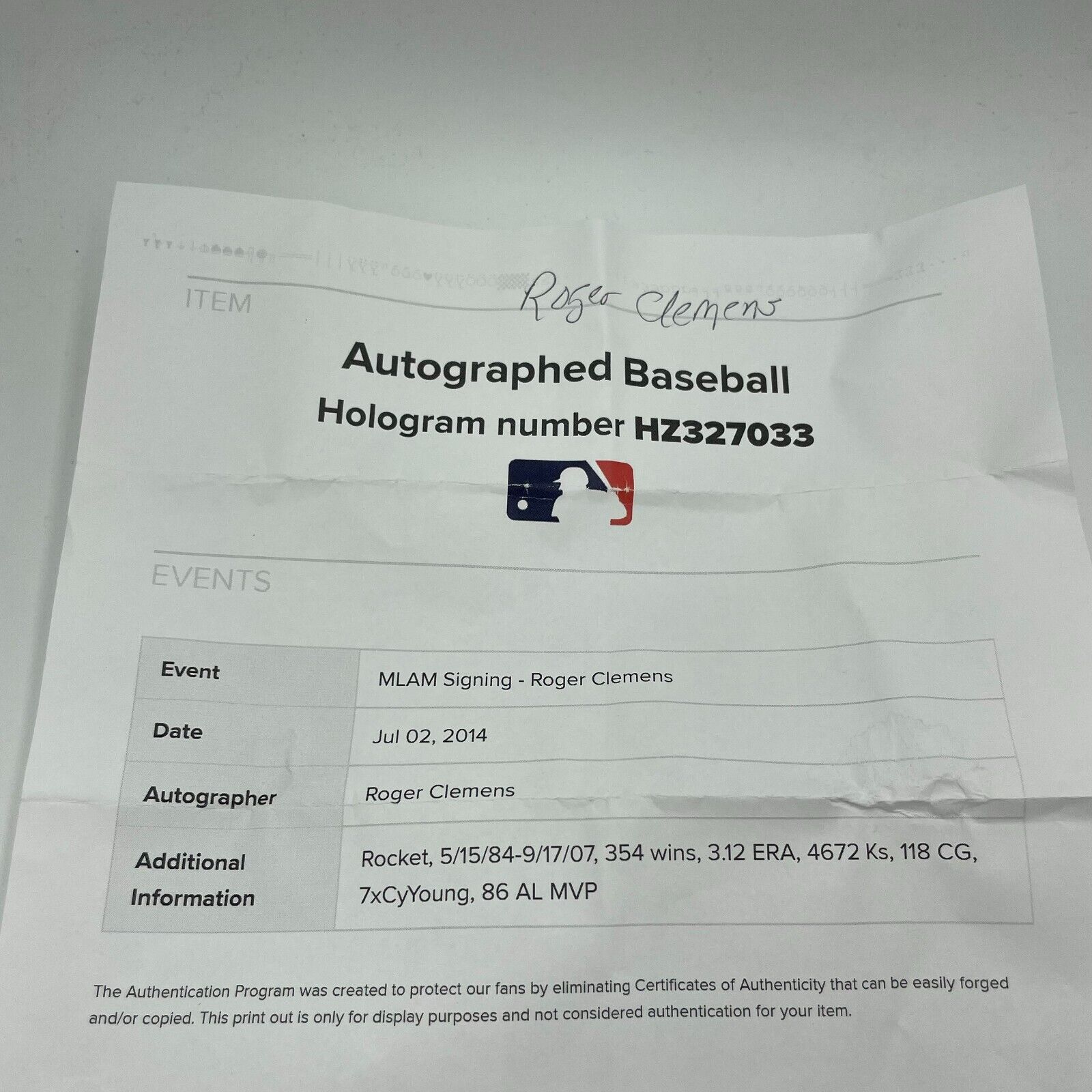 Roger Clemens signed and inscribed " Rocket, 5/15/84-9/17/07, 354 wins, 3.12 ERA, 4672 Ks, 118 CG, 7xCyYoung, 86 AL MVP" on this Official Major League Allan H. Selig baseball. The ball comes with a STICKER ONLY from Tristar (7539530) and an MLB Authenticated hologram (HZ327033) for the signature and inscriptions.