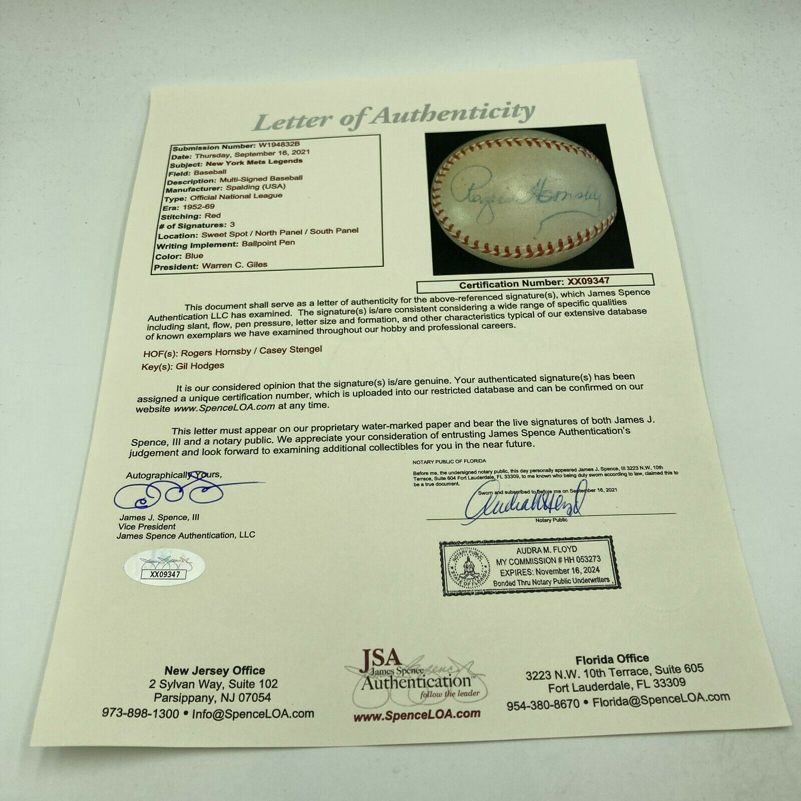 Official National League (Giles) Spalding signed baseball by Rogers Hornsby on the side panel. Followed by Casey Stengel on the sweet spot and Gil Hodges on side panels two Mets legends. Signatures signed blue ballpoint pen. Each player signed on his own panel so it can be displayed as a single signed baseball.