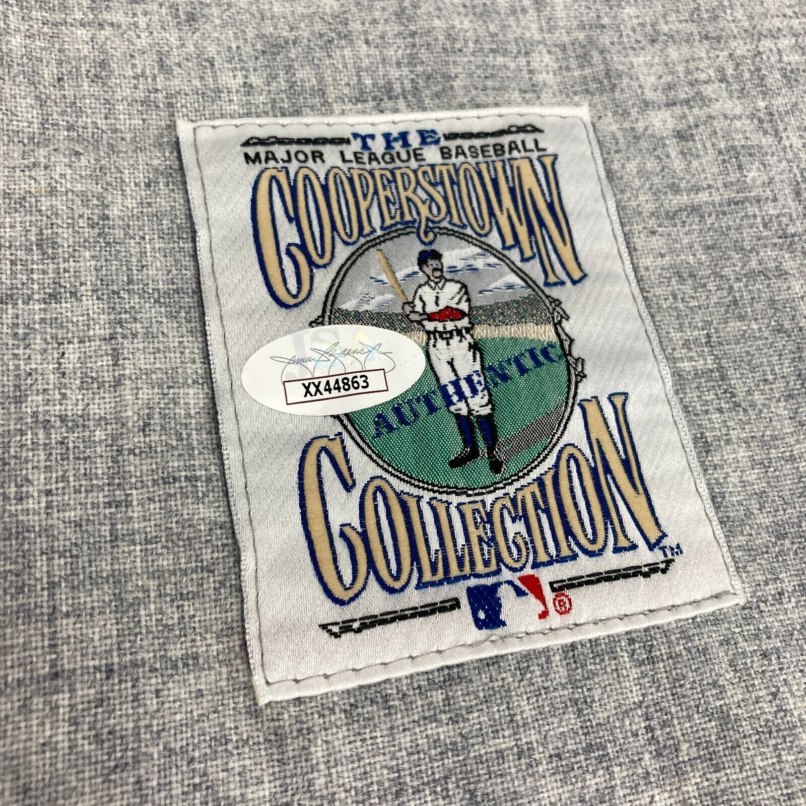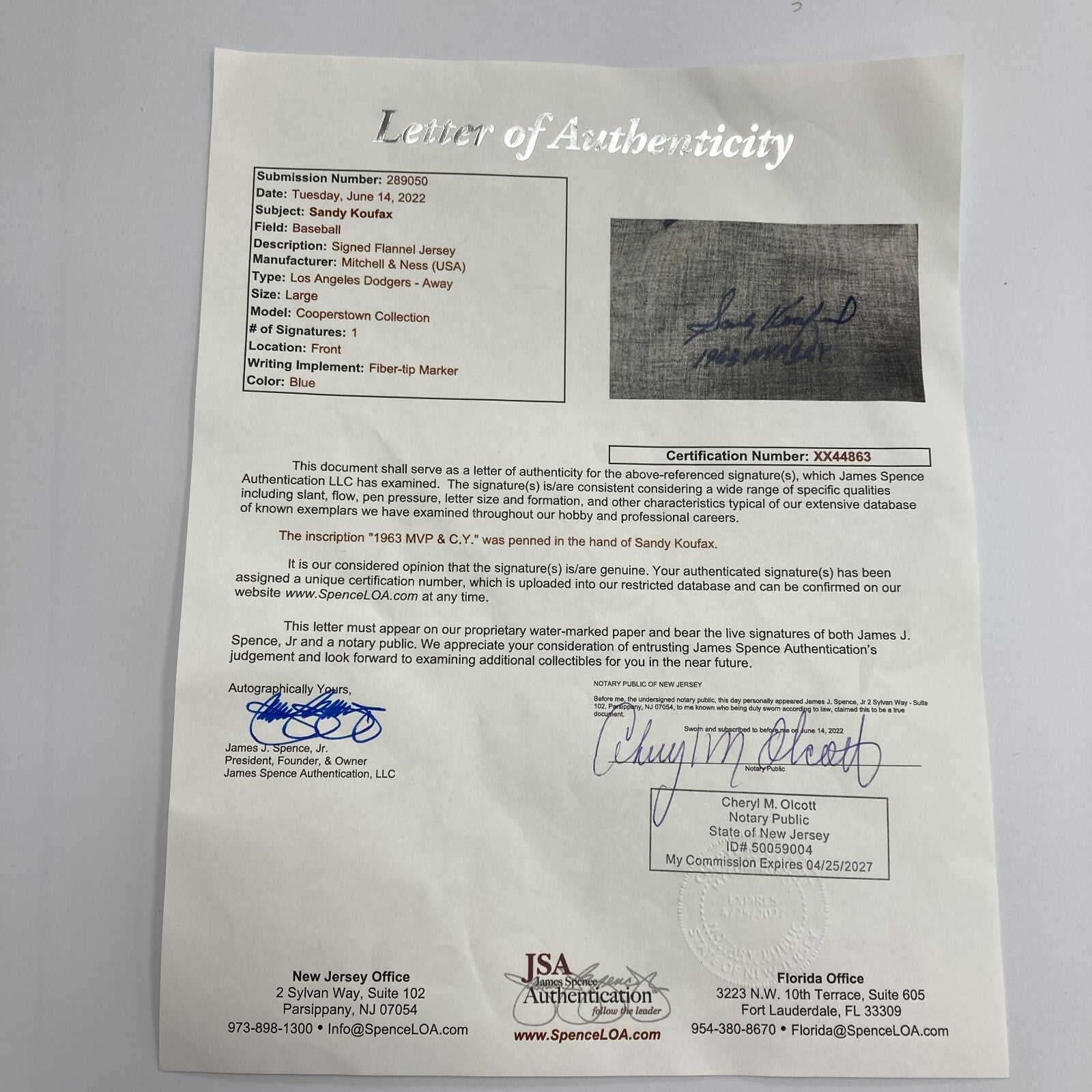 Brooklyn and Los Angeles Dodgers ace Sandy Koufax—the renowned "Left Arm of God"—compiled one of the most incredible six-season stretches in baseball history. From 1961 to 1966, Koufax was virtually unhittable, twirling his way to three Cy Young trophies, two World Series Most Valuable Player Awards, and the 1963 NL MVP trophy. Despite finishing the 1966 season with a 27-9 record, 1.73 ERA, and 317 strikeouts, Koufax abruptly retired, ending one of baseball's most magical careers. Koufax became the youngest player enshrined in the National Baseball Hall of Fame following his election in 1972. Koufax penned his distinct signature an inscribed "1963 MVP & C.Y." with a blue marker across the chest of this offered MLB Cooperstown Collection Los Angeles Dodgers #32 flannel jersey. The jersey comes with a COA from JSA (XX44863) for the signature.