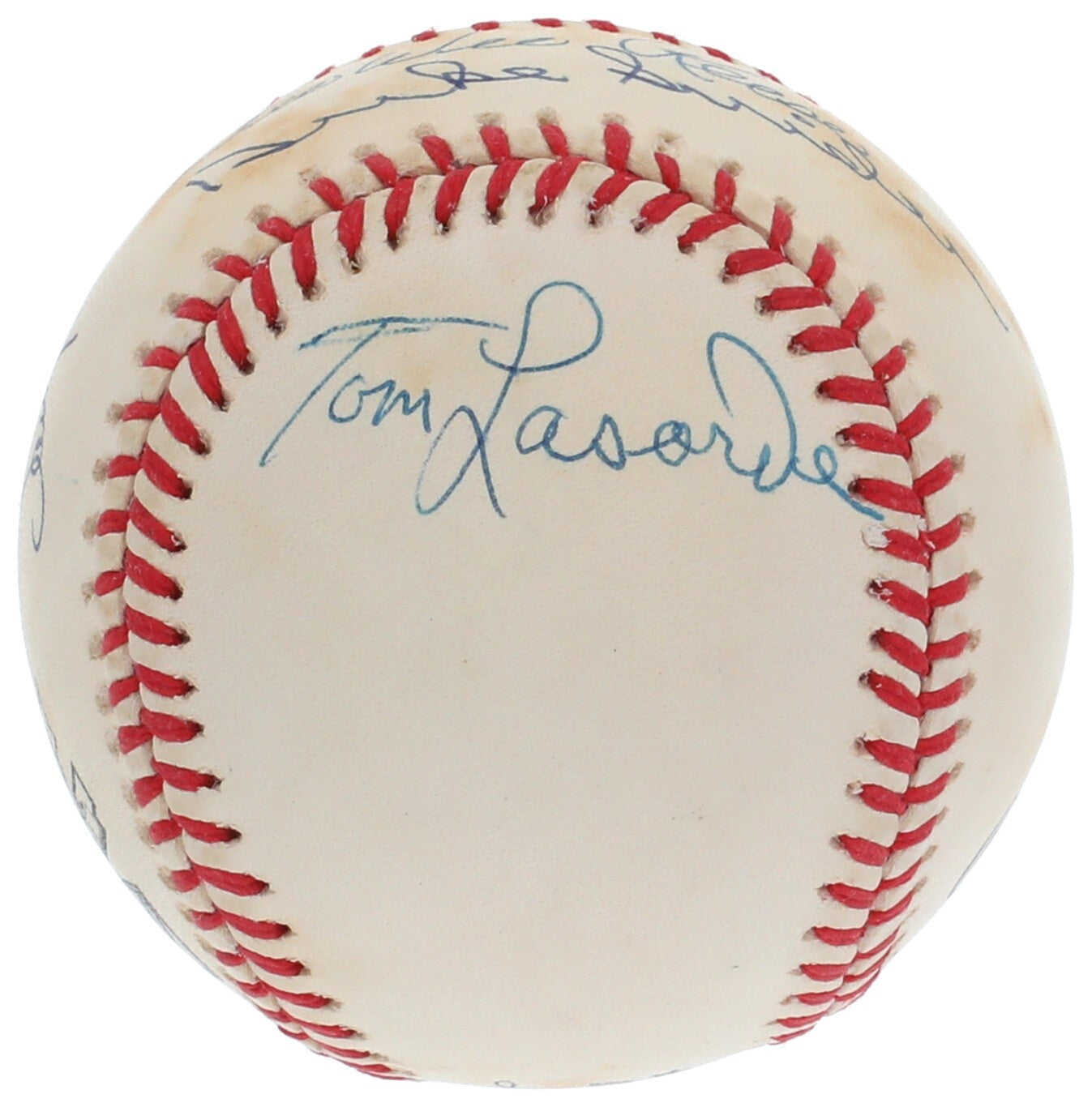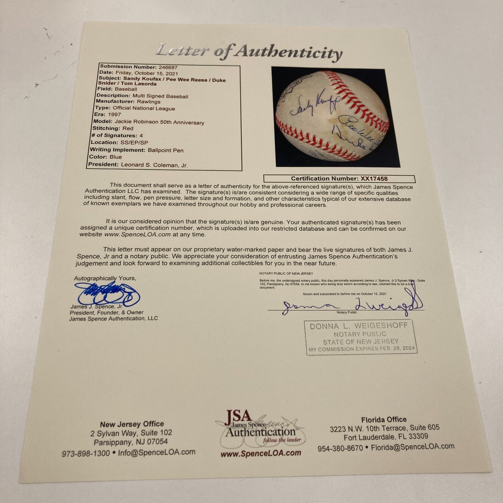 Los Angeles/Brooklyn Dodgers legends and MLB Hall of Famers Sandy Koufax, Tommy Lasorda, Pee Wee Reese, and Duke Snider each placed a flowing blue ballpoint pen signature across this offered Official National League Leonard S. Coleman Jackie Robinson 50th Anniversary baseball. Reese and Snider's signatures appear on the sweet spot, with Koufax placing his flowing signature on the west panel and Lasorda placing his signature on the south panel on the ball that contains spots of toning. The ball comes with an LOA from JSA (XX17458) for the signature.
