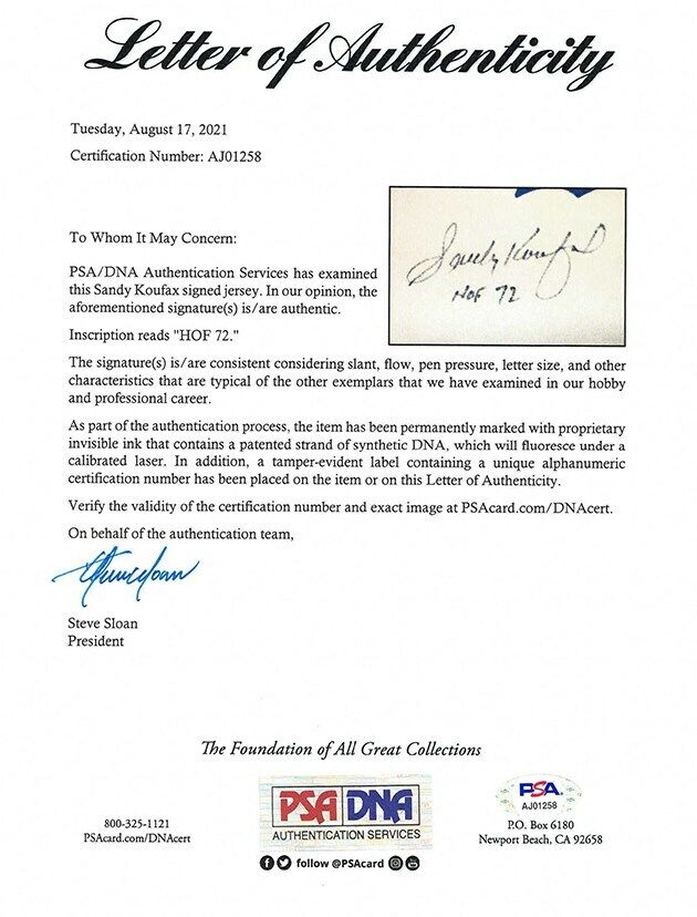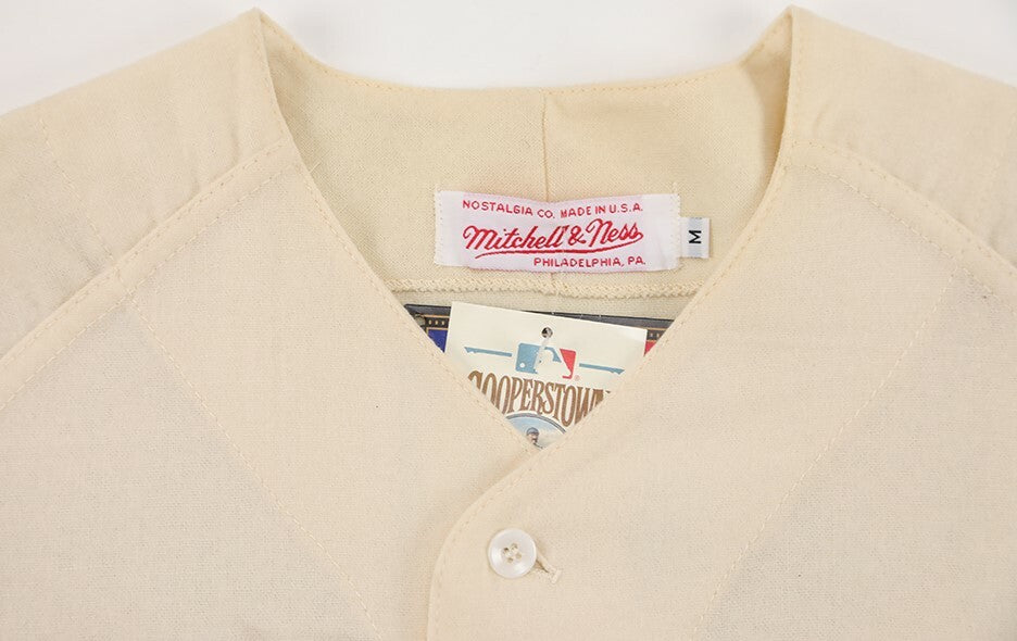 Exquisite Dodgers jersey signed by Hall of Famer Sandy Koufax. Brilliant jersey from the Cooperstown Collection is cream-colored with blue script Dodgers across the chest, number 32 in red on front and blue on back, all in felt. Mitchell & Ness size M tag in collar, and Cooperstown Collection tag on tail. Signed by the three-time Cy Young Award winner in black Sharpie with HOF 72 inscription on front right below the script logo. Whether it's a celebration of Dem Bums or Los Angelinos, this Koufax jersey is a keeper. Comes with PSA LOA.