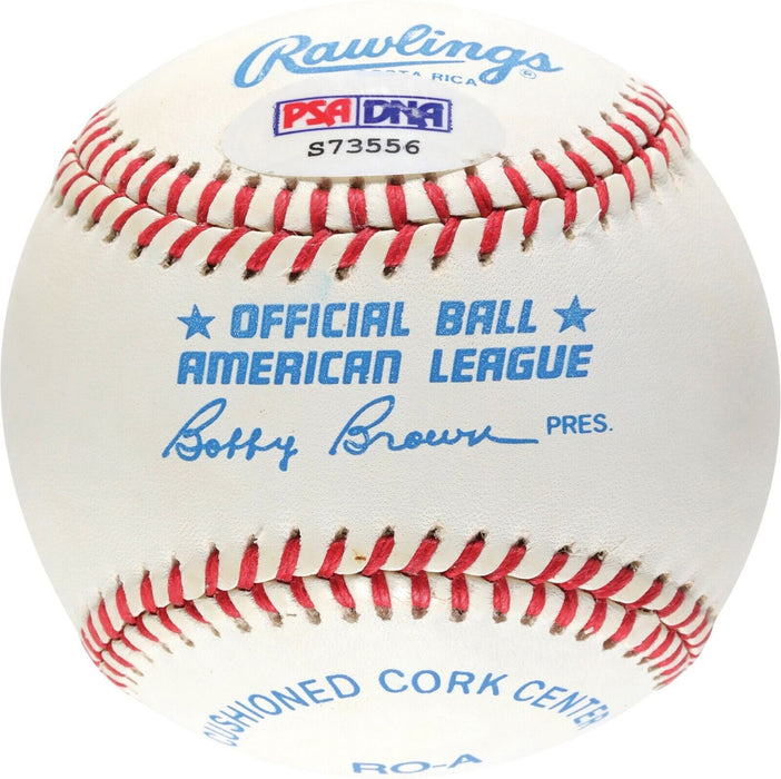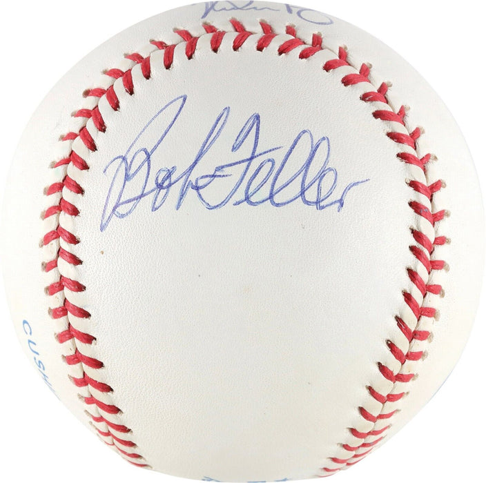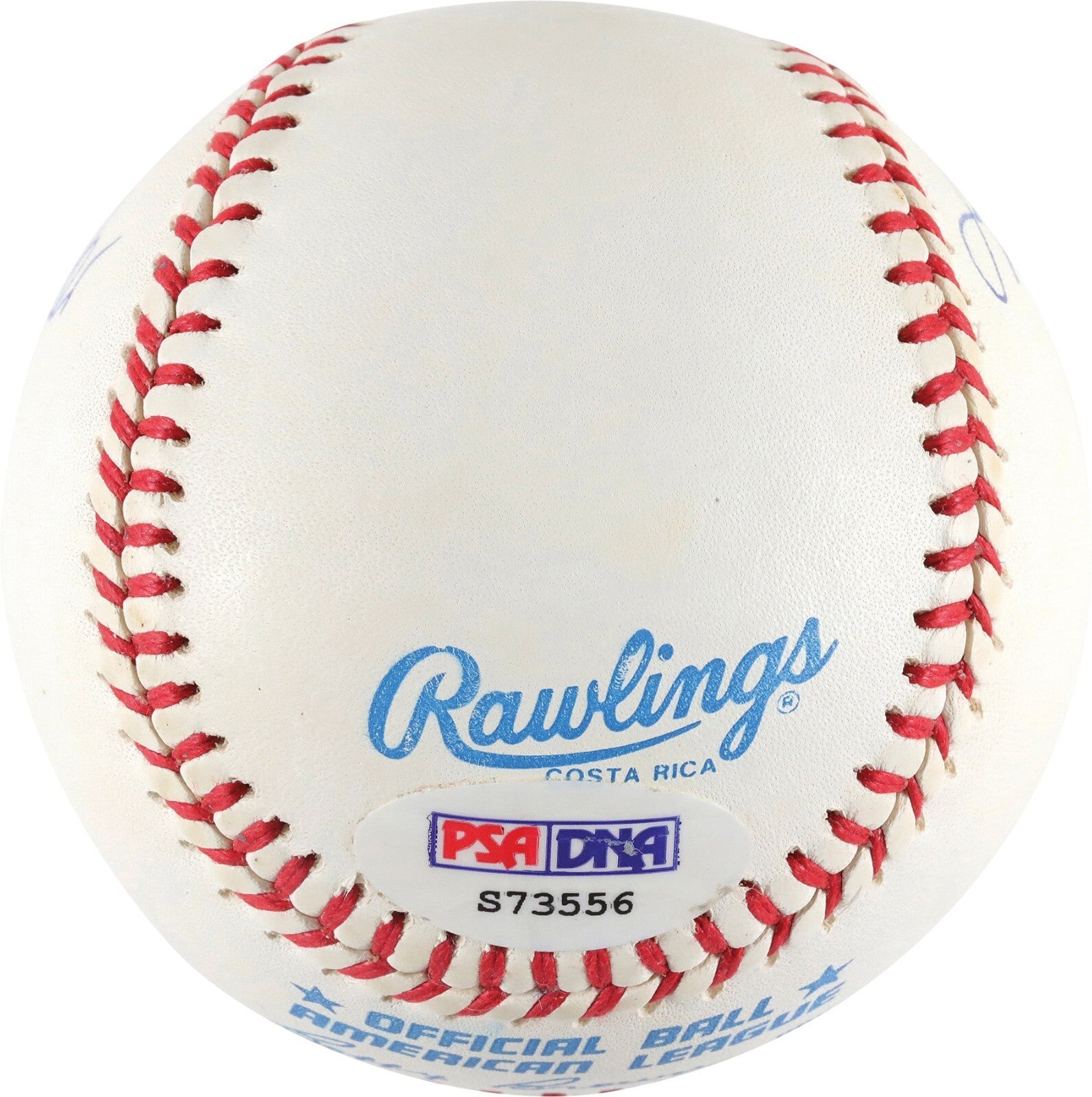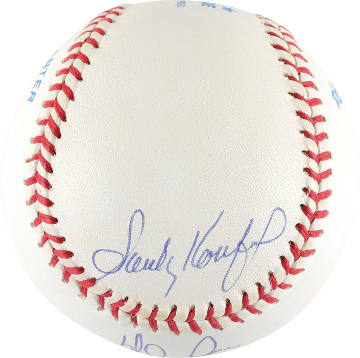 An Official American League Baseball, signed by Sandy Koufax, Nolan Ryan, and Bob Feller. The three Hall of Famers have each signed the ball in blue ink. The lot will include a Letter of Authenticity from PSA/DNA verifying the signatures. Koufax was an icon for the Dodgers, winning 3 Cy Young Awards. Feller, who spent his entire career in Cleveland, was inducted into the Hall of Fame in 1962. Ryan is among the most famed pitchers of all time, and holds the all-time Major League record for strikeouts with 5,714.