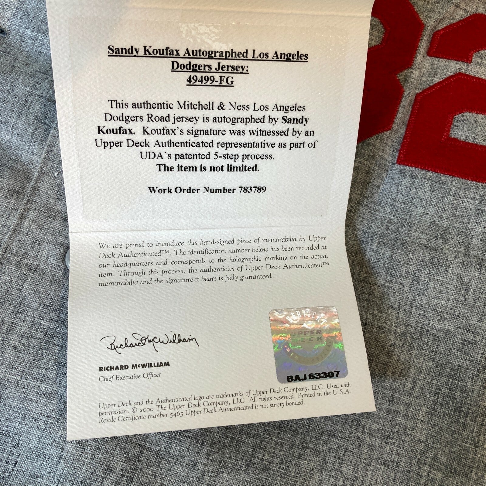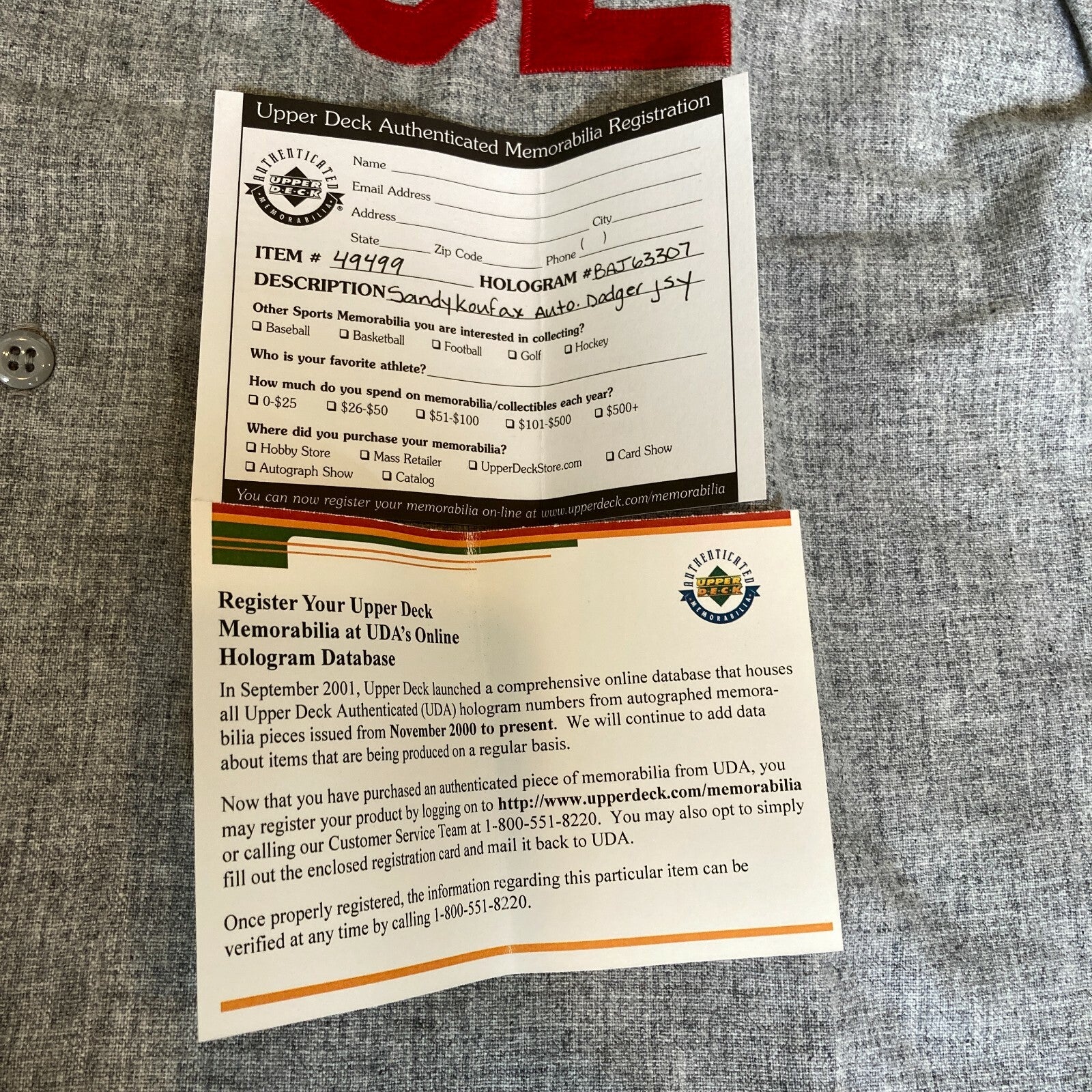 Sandy Koufax 1963 Los Angeles Dodgers road jersey, produced by Mitchell & Ness, signed by Koufax on the left breast. Koufax's signature has been scripted in black Sharpie. Koufax signed this jersey under the auspices of the Upper Deck Company and it is accompanied by both an Upper Deck COA and corresponding hologram label (affixed to the front of the jersey) and original box. The jersey (size 56) remains in Mint condition.