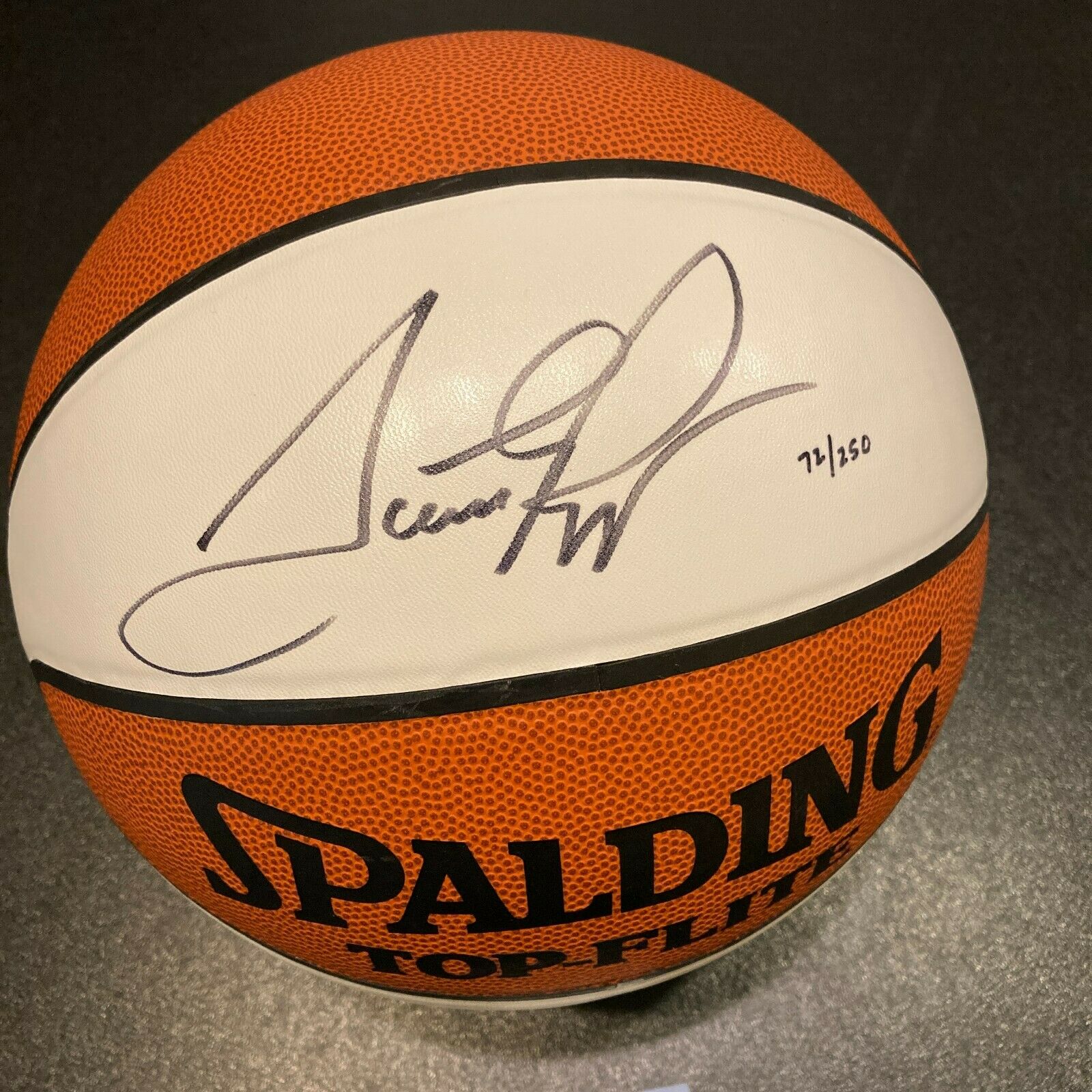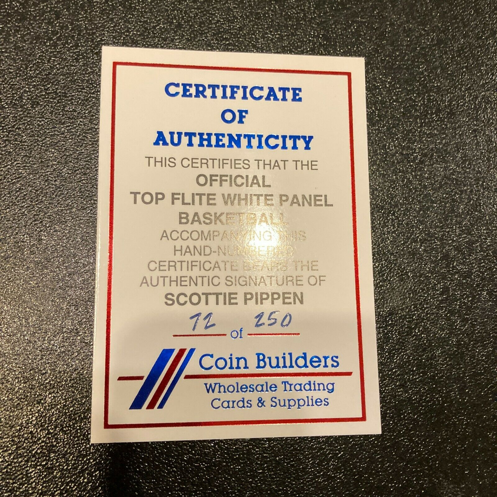 This Spalding white panel basketball is signed by Scottie Pippen in black Sharpie. The signature is authenticated by BAS with a basic COA and the ball is hand-numbered 72/250.