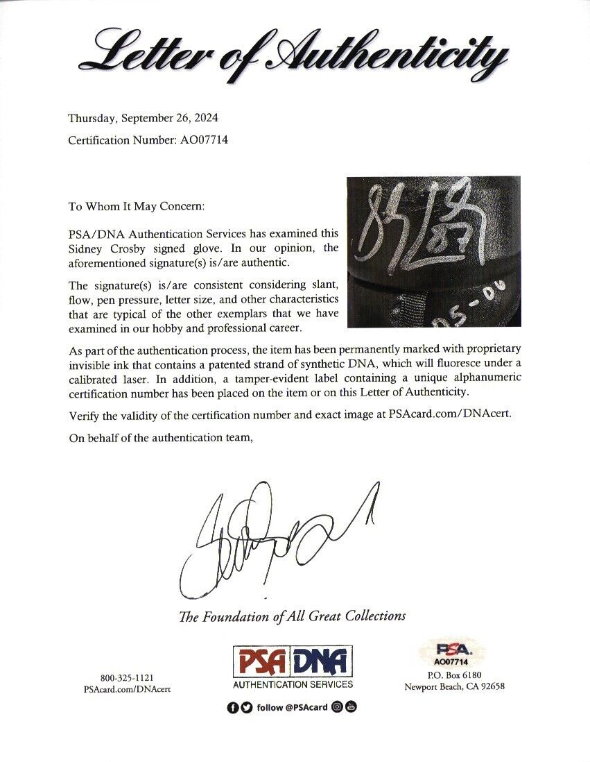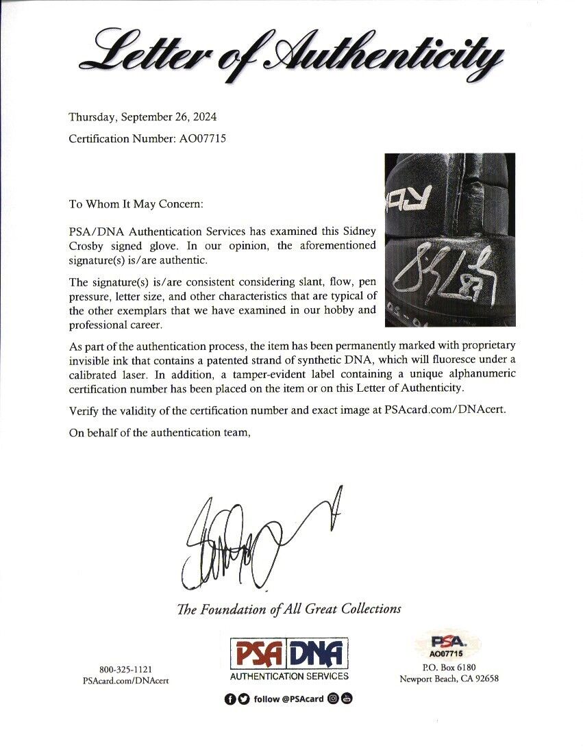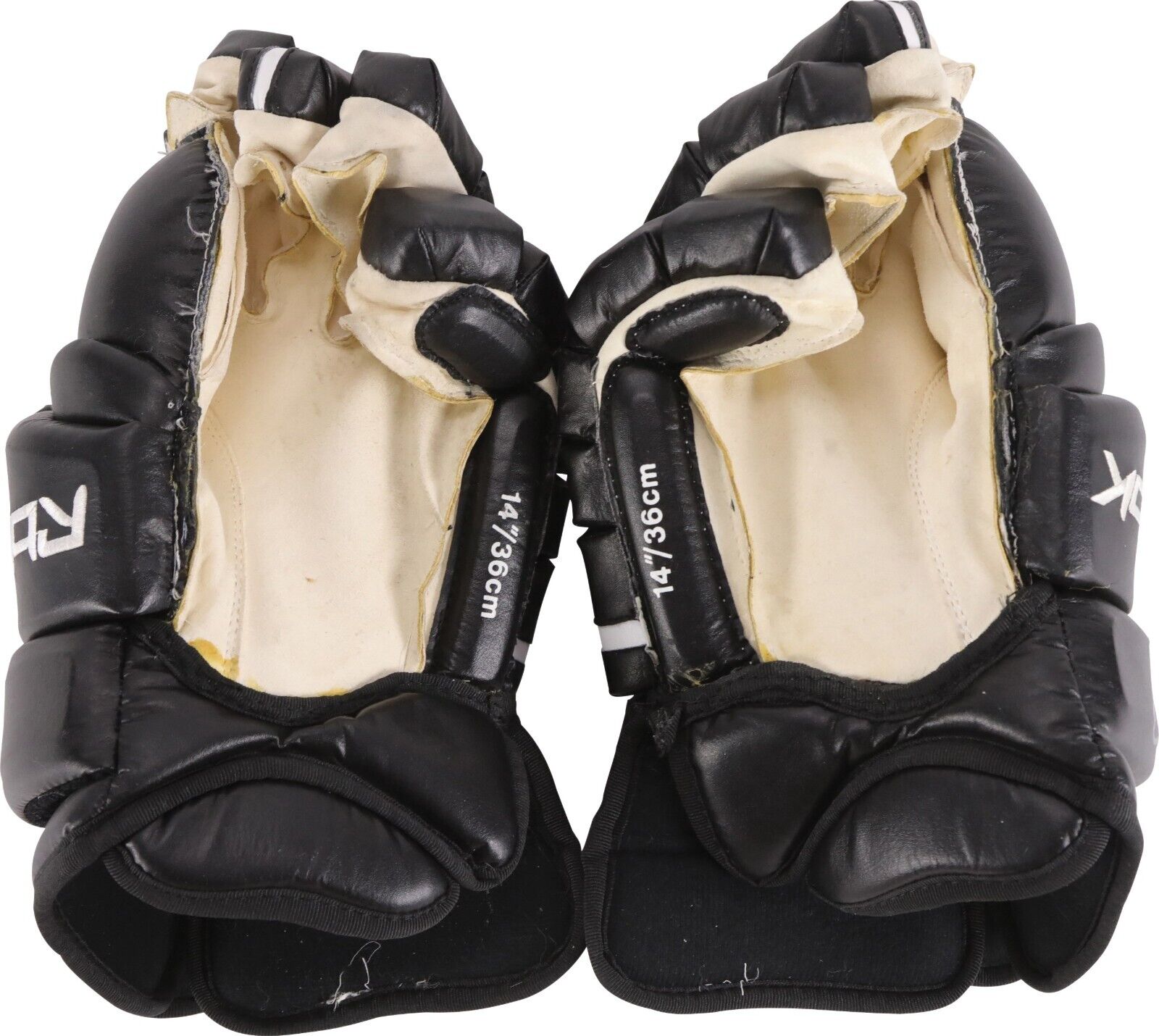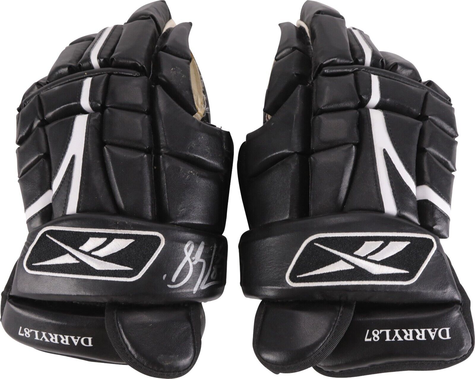 A pair of game issued Reebok hockey gloves signed by Pittsburgh Penguins legend Sidney Crosby. The black gloves show a fair amount of wear with scuff marks throughout. Darryl 87 is stamped in white on the cuff of each glove, where players often inscribe their nicknames. Crosby has also signed each glove near the wrist area, also notating 05-06 for the years. A phenom since he was a young teenager, Crosby has more than made good on his promise, winning Stanley Cups in 2009, 2016, and 2017. A ten-time All-Star and a two-time Hart Memorial Trophy Winner, Crosby will be a shoo-in for the Hall of Fame upon his retirement. Comes with 2 PSA LOAs.