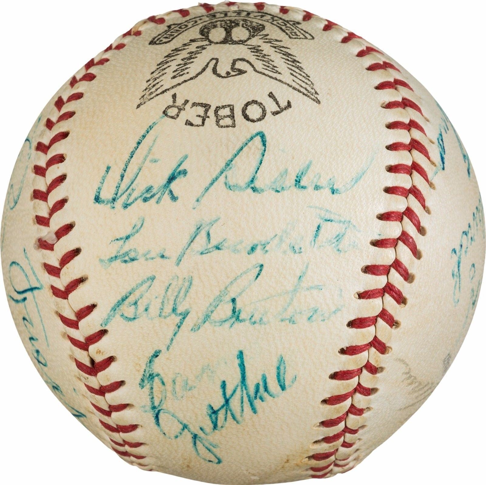 1960's St. Louis Cardinals Hall Of Famers Signed Baseball. Signed during the decade of the 1960's, this "National League" baseball bears a total of thirteen signatures, including seven members of the National Baseball Hall of Fame: Stan Musial, Dizzy Dean, Frankie Frisch, Joe Medwick, Johnny Mize, Eddie Matthews, and Henry Aaron. Others include Lew Burdette, Dick Sisler, and Sam Jethroe. All of the signatures (average 9/10) are in green ink, except for Aaron who signs in black ink. Ball is NRMT. Full LOA from PSA/DNA.