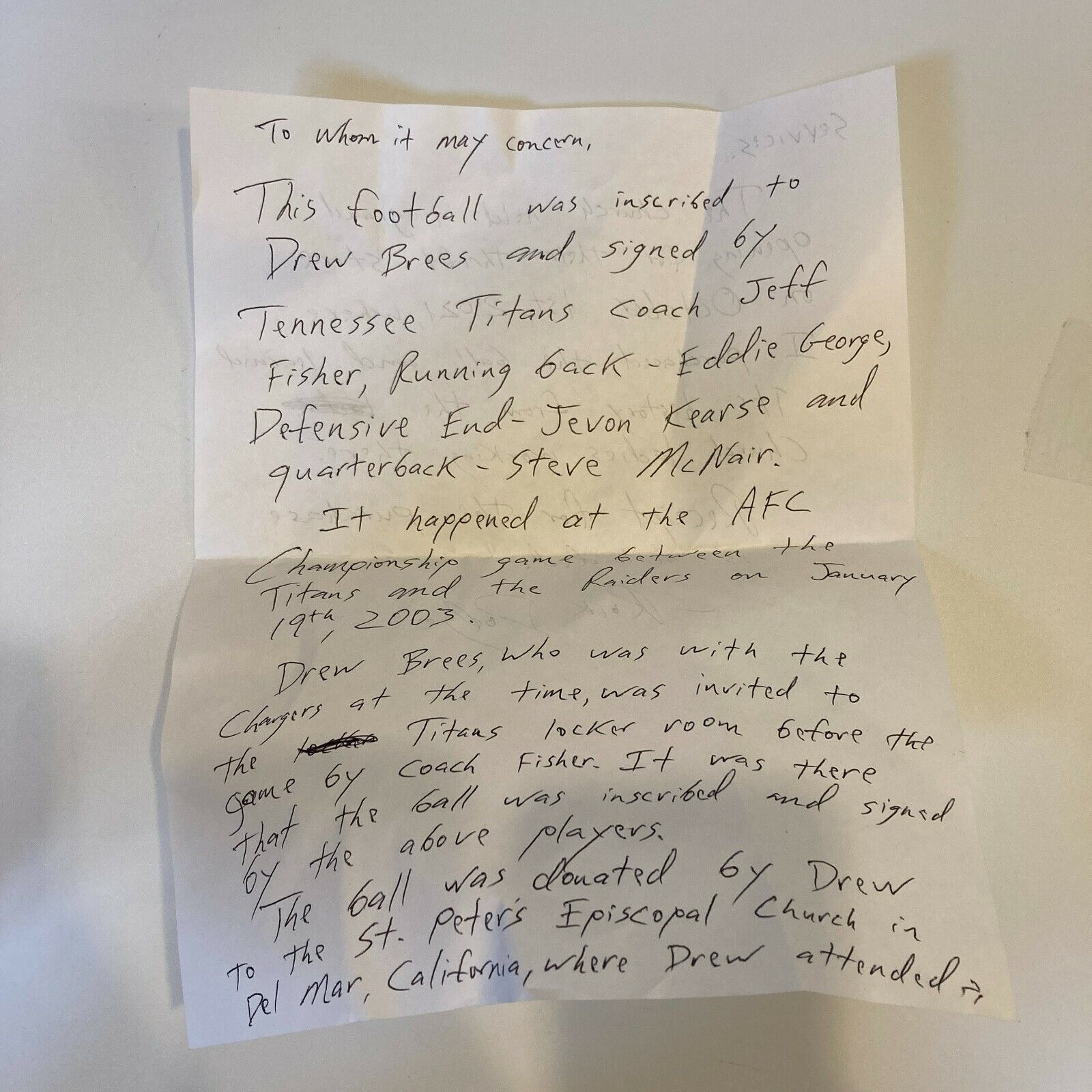Incredible 2003 Tennessee Titans multi signed Wilson NFL Game football presented to Drew Brees at the 2003 AFC Championship game. Signed and inscribed to Brees by: