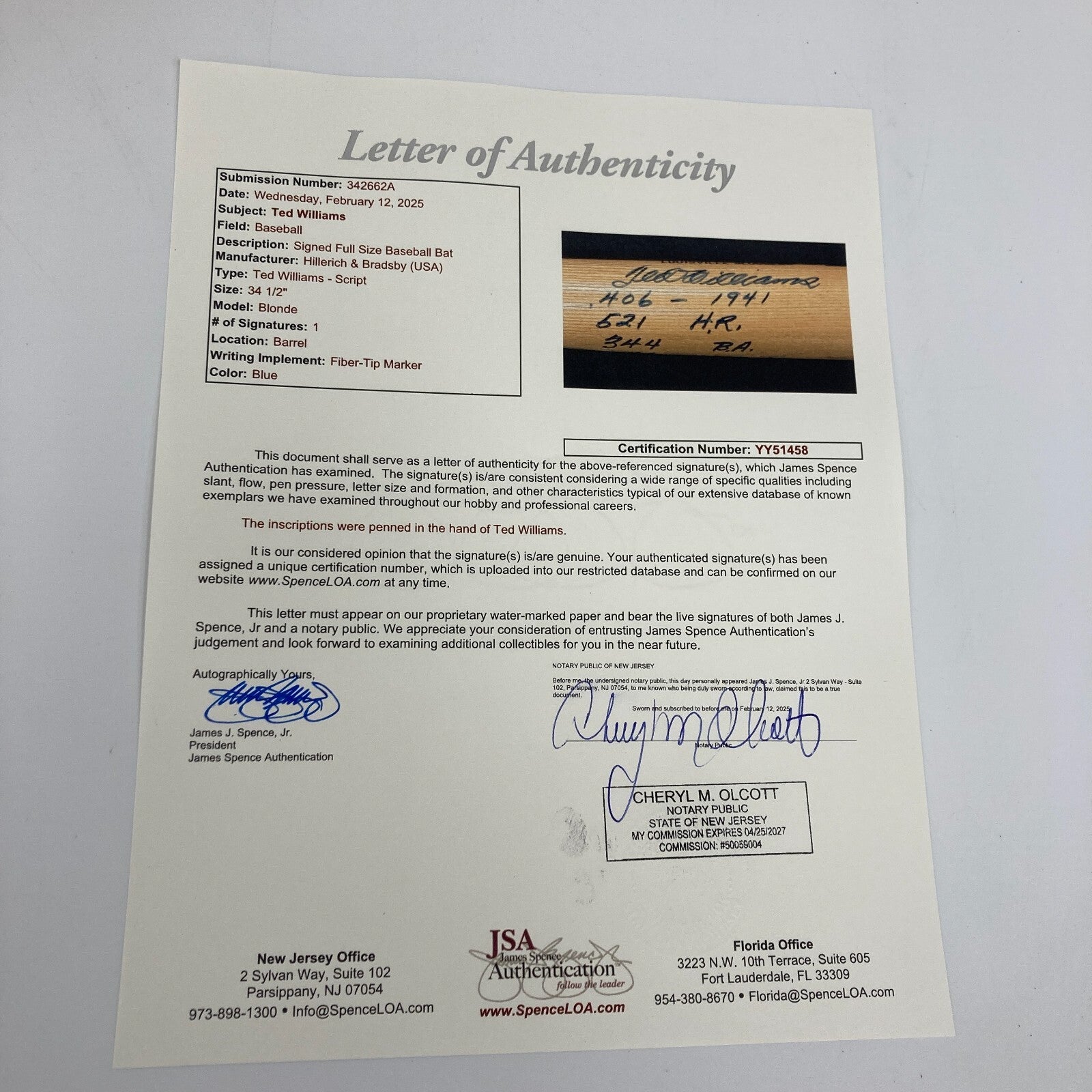 Ted Williams Signed Heavily Inscribed Career STAT Baseball Bat JSA COA