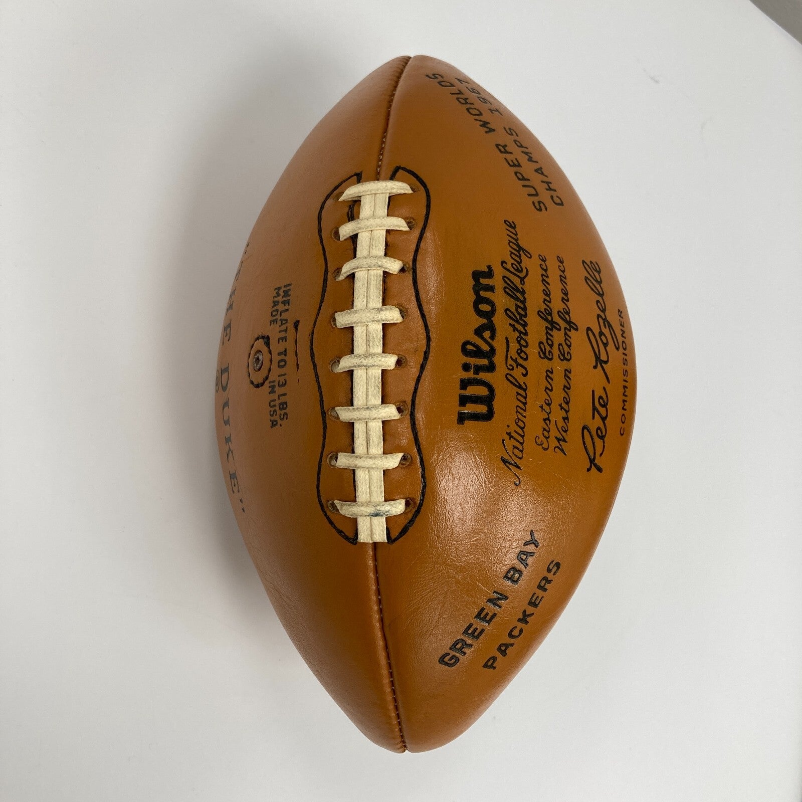 High Grade 1967 Green Bay Packers "Super Bowl" II Champion team-signed football is as nice as we have seen. A total of 29 autographs in blue pen cover two panels of this customized presentational NFL The Duke (Rozelle) football, which has "GREEN BAY PACKERS" and "SUPER WORLDS CHAMPS (sic) 1967" on either side of the main manufacturer's stamp. The name is significant in that the actual term "Super Bowl" wasn't coined until the following season, thus the first two were referred to as the AFL-NFL World Championship Game. Legendary coach Vince Lombardi has perhaps the biggest and boldest signature front-and-center (grading 9+/10), with others including Hall of Famers Bart Starr, Ray Nitschke, Willie Davis, Forrest Gregg, and Herb Adderly, and more among the highlights. Ball remains in NM-MT condition but is slightly deflated and we are unsure as to whether it still holds air; signatures (aside from Lombardi) average a solid 8/10. The American Football League was considered the fledgling upstart to the venerable National Football League when the two began meeting for the championship, and the Packers did little to dispel that notion, defeating the Kansas City Chiefs, 35-10, in what is considered Super Bowl I, and following it up with a 33-14 triumph over the Oakland Raiders in the year in which this ball was signed. It wasn't until Super Bowl III when the New York Jets stunned the heavily-favored Baltimore Colts - credited to leading to the merger of the two into the current NFL - and the AFL/AFC entries proceeded to win 11 of the next 13 "Big Games" after the Pack signed this prize. Comes with PSA LOA.